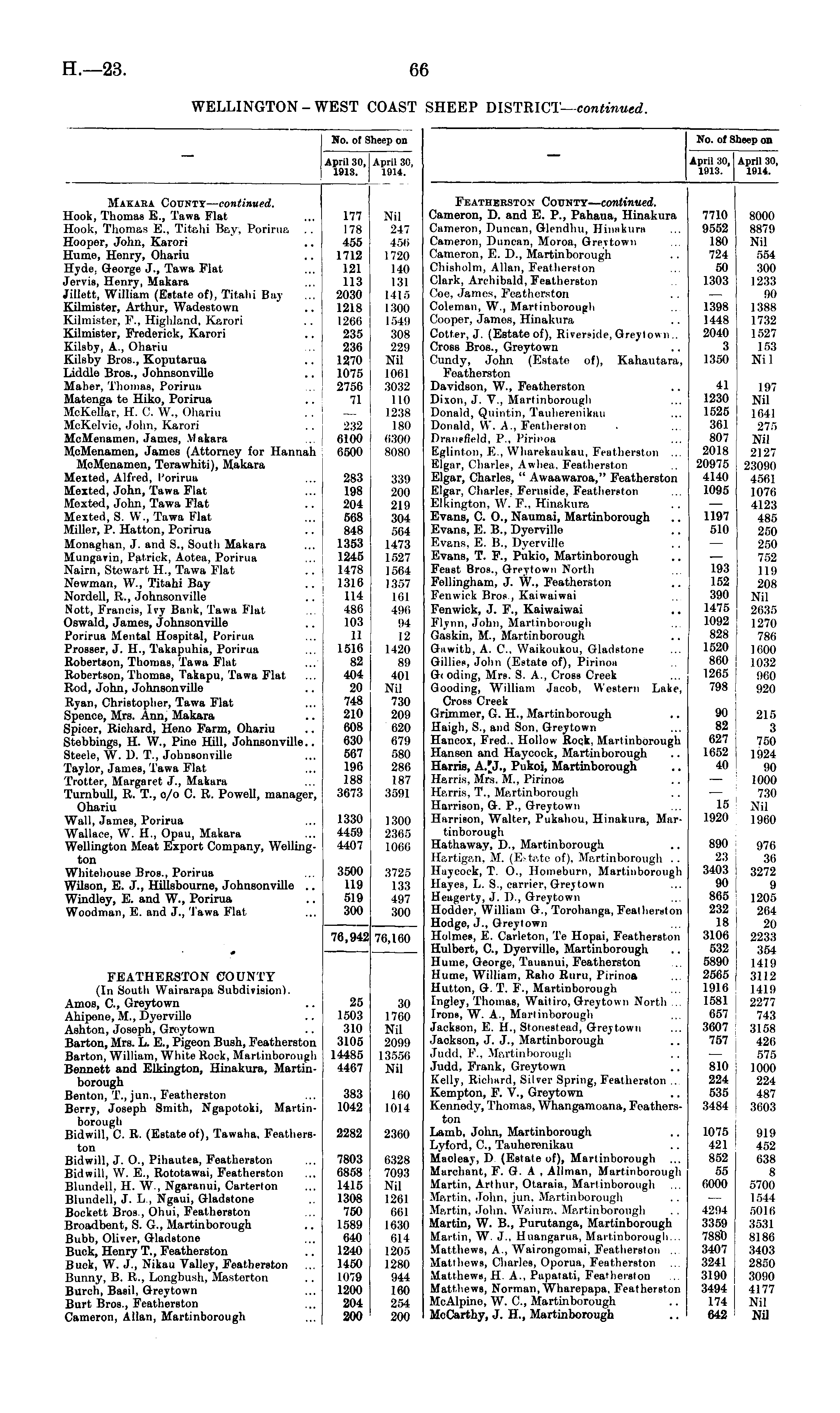 No. of Sheep on April 30, April 30 1913. 1914. April 30, 1914. Featherston County — continued. Cameron, D. and E. P., Pahaua, Hinakura Cameron, Duncan, Glendliu, Hinakura Cameron, Duncan, Moroa, Greytown Cameron, E. D., Martinborough Chisholm, Allan, Featherston Clark, Archibald, Featherston Coe, James. Featherston Coleman, W., Martinborough Cooper, Jamos, Hinakura Cotter, J. (Estate of), Riverside, Greytown .. Cross Bros., Greytown Cundy, John (Estate of), Kahautara, Featherston Davidson, W., Featherston Dixon, J. V., Martinborough Donald, Quintin, Taulierenikau Donald, W. A., Featherston Dransfield, P., Pirinoa Eglinton, E., Wharekaukau, Featherston ... Eigar, Charles, A when. Featherston Elgar, Charles, " Awaawaroa," Featherston Elgar, Charles. Fernside, Featherston Elkington. W. F„ Hinakura Evans, C. O., Naumai, Martinborough Evans, E. B., Dyervillo Evans, E. B., Dyerviile Evans, T. F., Pukio, Martinborough Feast Bros., Greytown North Fellingham, J. W., Featherston Fenwick Bros , Kaiwaiwai Fenwick, J. F., Kaiwaiwai Flynn, John, Martinborough Gaskin, M., Martinborough Gawith, A. ft, Waikoukou, Gladstone Gillies, John (Estate of), Pirinoa G< oding, Mrs. S. A., Cross Creek Gooding, William Jacob, Western Lake, Cross Creek Grimmer, G. H., Martinborough Haigb, S., and Son, Greytown Hancox, Fred., Hollow Roqk, Martinborough Hanson and Haycock, Martinborough Harris, A.'J., Pukoi, Martinborough Harris, Mrs. M., Pirinoa Hcrris. T„ Martinborough Harrison, G. P., Greytown Harrison, Walter, Pukahou, Hinakura, Martinborough Hatha way, D., Martinborough Hartigan, M. (Estate of). Martinborough .. Haycock, T. 0., Homeburn, Martinborough Hayes, L. S., carrier, Greytown Heagerty, J. I)., Greytown Hodder, William G., Torobanga, Featherston Hodge, J., Greylown Holmes, E. Carleton, Te Hopai, Featherston Hulbert, ft, Dyorville, Martinborough Hume, George, Tauanui, Featherston Hume, William, Rabo Ruru, Pirinoa Hutton, G. T. F., Martinborough Ingley, Thomas, Wailiro, Greytown North... Irons, W. A., Martinborough Jackson, E. H., Stonestead, Greytown Jaokson, J. J., Martinborough Judd. V.. Martinborough Judd, Frank, Greytown Kelly, Richard, Silver Spring, Featherston ... Kempton, F. V., Greytown Kennedy, Thomas, Whangamoana, Featherston Lamb, John, Martinborough Lyford, ft, Tauheronikau Macleay, D (Estate of), Martinborough Marchant, F. G. A , Allman, Martinborough Martin, Arthur, Otaraia, Martinborough Martin, John, jun. Martinborough Martin, John, Waiura, Martinborough Martin, W. B., Purutanga, Martinborough Martin, W. J.. Huangarua, Martinborough... Matthews, A., Wairongomai, Featherston .. Matthews, Charles, Oporua, Featherston Matthews, H. A., Papatati, Featherston Matthews, Norman, Wharepapa. Featherston McAlpino, W. ft, Martinborough McCarthy, J. H., Martinborough 7710 9552 180 724 50 1303 1398 1448 2040 3 1350 41 1230 1525 361 807 2018 20975 4140 1095 1197 510 193 152 390 1475 1092 828 1520 860 1265 798 90 82 627 1652 40 8000 8879 Nil 554 300 1233 90 1388 1732 1527 153 Nil 197 Nil 1(141 275 Nil 2127 23090 4561 1070 4123 485 250 250 752 119 208 Nil 2635 1270 780 1600 1032 960 920 215 3 750 1924 90 1000 730 Nil 1960 15 1920 890 23 3403 90 865 232 18 3106 532 5890 2565 1916 1581 657 3607 757 970 30 3272 9 1205 204 20 2233 354 1419 3112 1419 2277 743 3158 420 575 1000 224 487 3603 810 224 535 3484 1075 421 852 55 6000 919 452 638 8 5700 1544 5(1 Hi 3531 8186 3403 2850 3090 4177 Nil Nil 4294 3359 7880 3407 3241 3190 3494 174 642