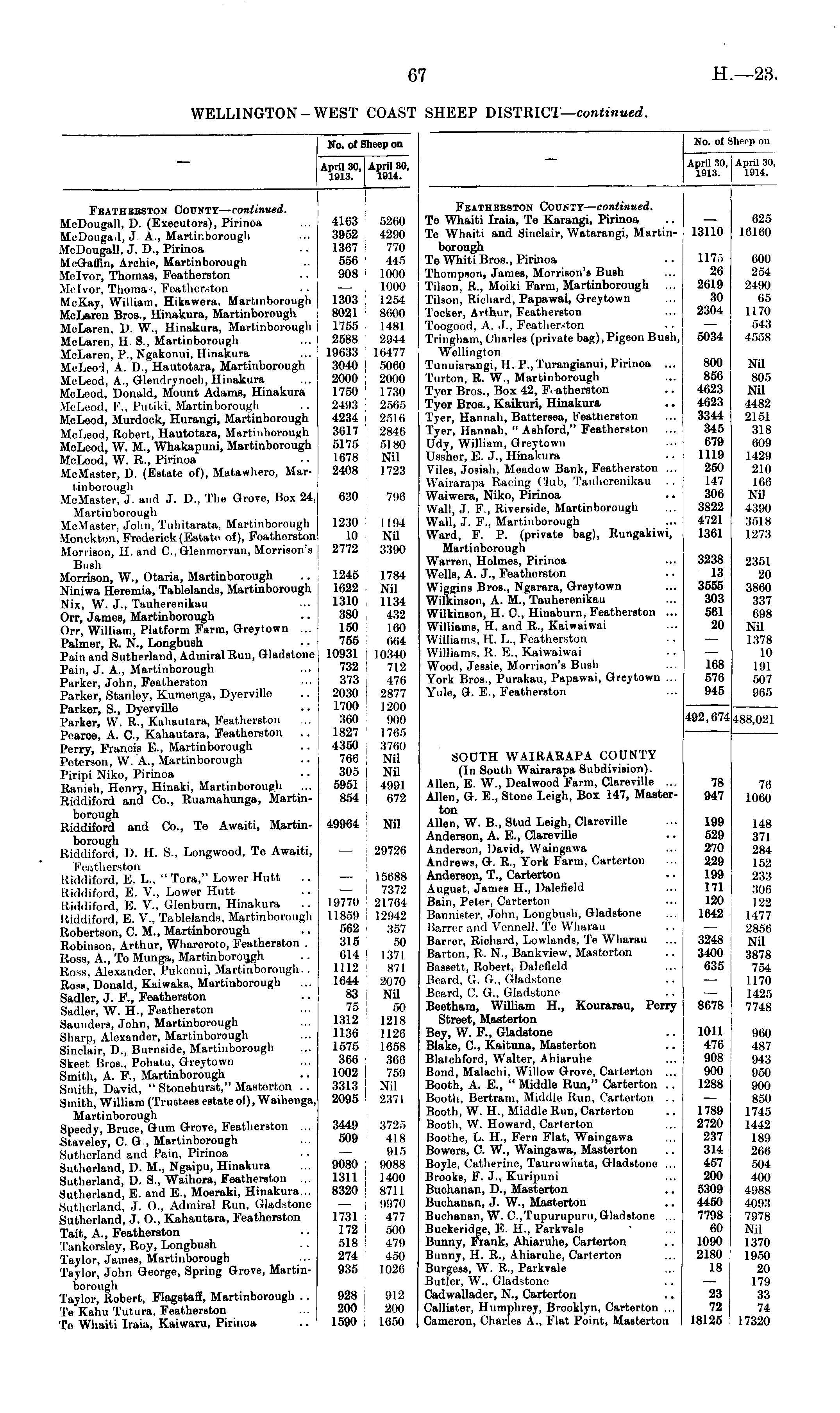 No. of Sheep on April 30, 1913. April 30, 1914. Featherston County— continued. Te Whaiti Iraia, Te Karangi, Pirinoa Te Whaiti and Sinclair, Watarangi, Martinborough Te Whiti Bros., Pirinoa Thompson, James, Morrison's Bueh Tilson, R., Moiki Farm, Martinborough ... Tilson, Richard, Papawai, Greytown Tocker, Arthur, Featherston Toogood, A. J., Feather-ton Tringbam, Charles (private bag), Pigeon Bush, Wellington Tunuiarangi, H. P.,Turangianui, Pirinoa ... Turton, R. W., Martinborough Tyer Bros., Box 42, Featherston Tyer Bros., Kaikuri, Hinakura Tver, Hannah, Battersea, Featherston Tyer, Hannah, " Ashford," Featherston Udy, William, Greytown Ussher, E. J., Hinakura Viles, Josiah, Meadow Bank, Featherston ... Wairarapa Racing Club. Tauherenikau .. Waiwera, Niko, Pirinoa Wall, J. F., Riverside, Martinborough Wall, J. F., Martinborough Ward, F\ P. (private bag), Rungakiwi, Martinborough Warren, Holmes, Pirinoa Wells, A. J., Feathorston Wiggins Bros., Ngarara, Greytown Wilkinson, A. M., Tauherenikau Wilkinson, H. ft, Hinaburn, Featherston ... Williams, H. and R., Kaiwaiwai Williams. H. L., Featherston Williams. R. E.. Kaiwaiwai Wood, Jessie, Morrison's Bush York Bros., Purakau, Papawai, Greytown ... Yule, G. E., Featherston 13110 1175 26 2619 30 2304 5034 800 856 4623 4623 3344 345 679 1119 250 147 306 3822 4721 1361 625 16160 600 254 2490 65 1170 543 4558 Nil 805 Nil 4482 2151 318 609 1429 210 166 Nil 4390 3518 1273 3238 13 3555 303 561 20 2351 20 3860 337 098 Nil 1378 10 191 507 965 168 576 945 492,674 488,021 SOUTH WAIRARAPA COUNTY (In South Wairarapa Subdivision). Allen, E. W., Dealwood Farm, Clareville ... Allen, G. E., Stone Leigh, Box 147, Masterton Allen, W. B., Stud Leigh, Clareville Anderson, A. E., Clareville Anderson, David, Waingawa Andrews, G. R., York Farm, Carterton Anderson, T., Carterton August, James H., Dalefield Bain, Peter, Carterton Bannister, John, Longbush, Gladstone Barrerand Vermeil, Te Wharau Barrer, Richard, Lowlands, Te Wharau Barton, R. N., Bankvicw, Masterton Bassett, Robert, Dalefield Beard, G. G., Gladstone Beard. ('. (I.. Gladstone Beetham, William H., Kourarau, Perry Street, Masterton Bey, W. F, Gladstone Blake, ft, Kaituna, Masterton Blatchford, Walter, Ahiaruhe Bond, Malaebi, Willow Grove, Carterton ... Booth, A. E., " Middle Run," Carterton .. Booth. Bertram. .Middle Bun. Carterton .. Booth, W. H., Middle Run, Carterton Booth, W. Howard, Carterton Boothe, L. H., Fern Flat, Waingawa Bowers, C. W., Waingawa, Masterton Boyle, Catherine, Tauruwbata, Gladstone ... Brooks, F. J., Kuripuni Buchanan, D., Masterton Buchanan, J. W., Masterton Buchanan, W. C,Tupurupuru, Gladstone ... Buckeridge, E. H., Parkvale Bunny, Frank, Ahiaruhe, Carterton Bunny, H. R., Ahiaruhe, Carterton Burgess, W. R., Parkvale Butler, W„ Gladstone Cadwallader, N., Carterton Callister, Humphrey, Brooklyn, Carterton ... Cameron, Charles A., Flat Point, Masterton 78 947 199 529 270 229 199 171 120 1642 3248 3400 035 8678 1011 476 908 900 1288 70 1060 148 371 284 152 233 300 122 1477 2856 Nil 3878 754 1170 1425 7748 960 487 943 950 900 850 1745 1442 189 266 504 400 4988 1 4093 | 7978 Nil 1370 1950 20 179 33 74 17320 1789 2720 237 314 457 200 5309 4450 7798 60 1090 2180 18 23 72 18125