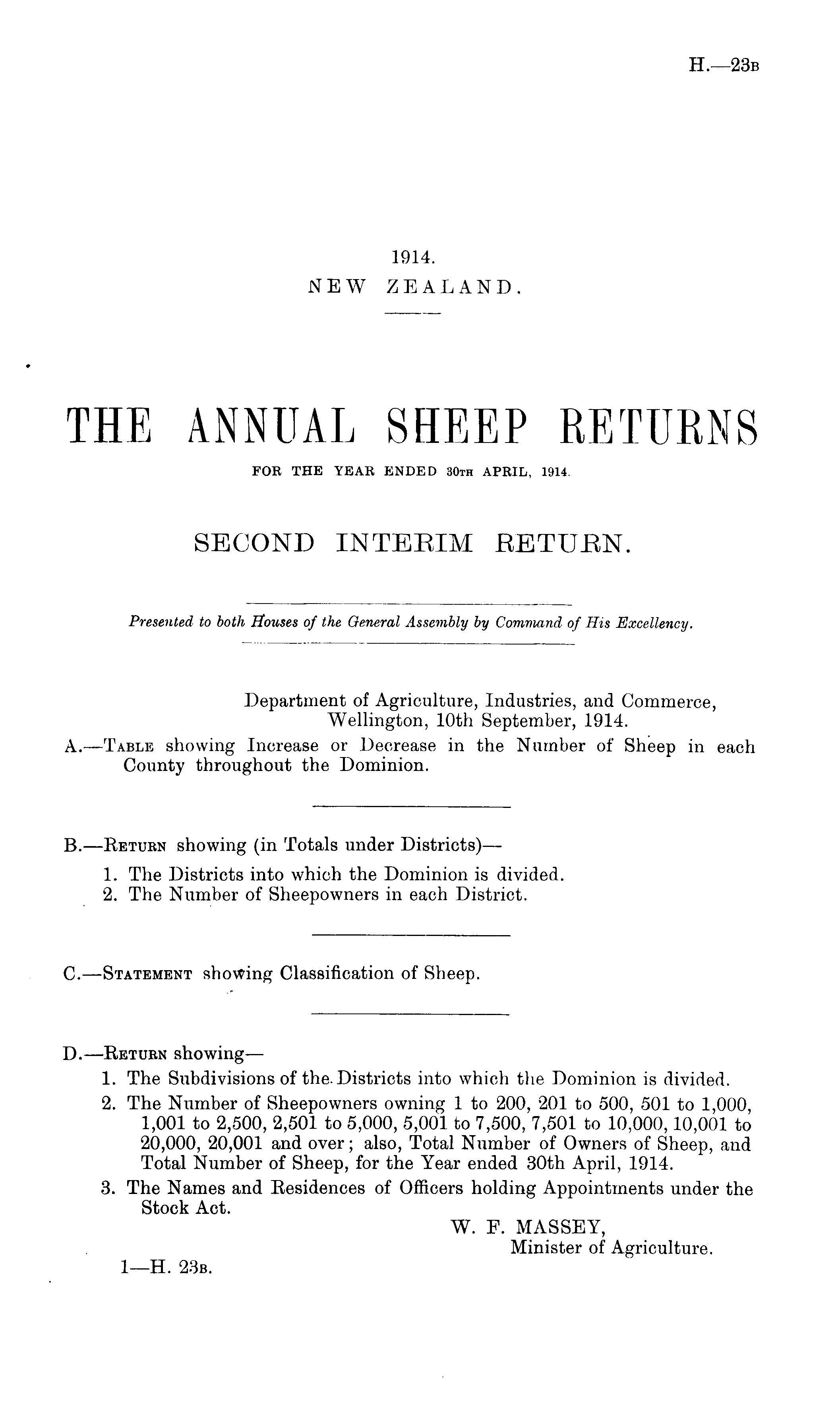 D.—Return showing— 1. The Subdivisions of the. Districts into which the Dominion is divided. 2. The Number of Sheepowners owning 1 to 200, 201 to 500, 501 to 1,000, 1,001 to 2,500, 2,501 to 5,000, 5,001 to 7,500, 7,501 to 10,000,10,001 to 20,000, 20,001 and over; also, Total Number of Owners of Sheep, and Total Number of Sheep, for the Year ended 30th April, 1914. 3. The Names and Residences of Officers holding Appointments under the Stock Act. W. F. MASSEY, Minister of Agriculture.