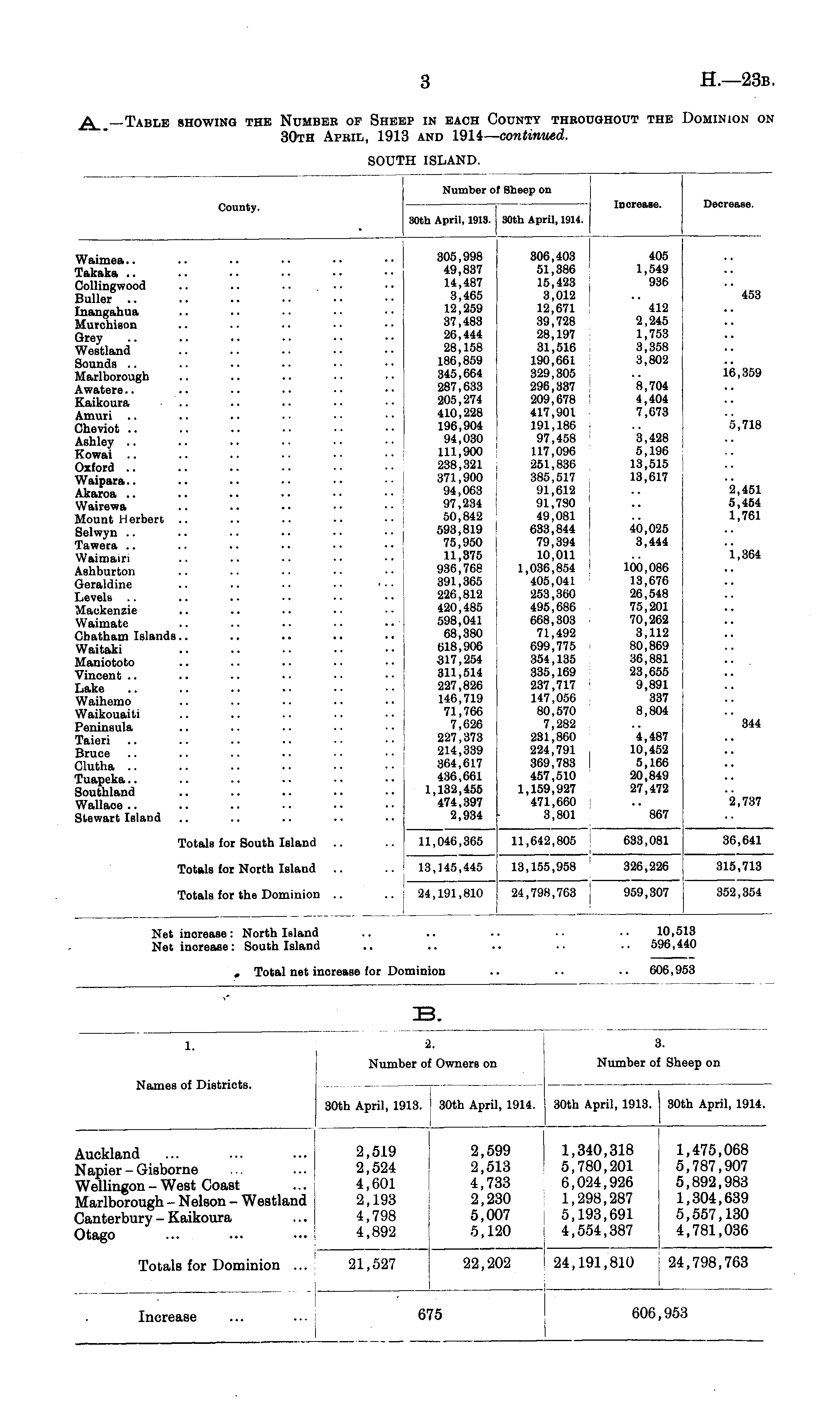 1. 2. 3. Number of Owners on Number of Sheep on Names of Districts. 30th April, 1913. 30th April, 1914. 30th April, 1913. 30th April, 1914. aickland lapier - Gisborne Vellingon - West Coast larlborough - Nelson - Westland Janterbury - Kaikoura )tago 2,519 2,524 4,601 2,193 4,798 4,892 2,599 2,513 4,733 2,230 5,007 5,120 1,340,318 5,780,201 6,024,926 1,298,287 5,193,691 4,554,387 1,475,068 5,787,907 5,892,983 1,304,639 5,557,130 4,781,036 Totals for Dominion ... 21,527 22,202 24,191,810 24,798,763 Increase 675 606,953