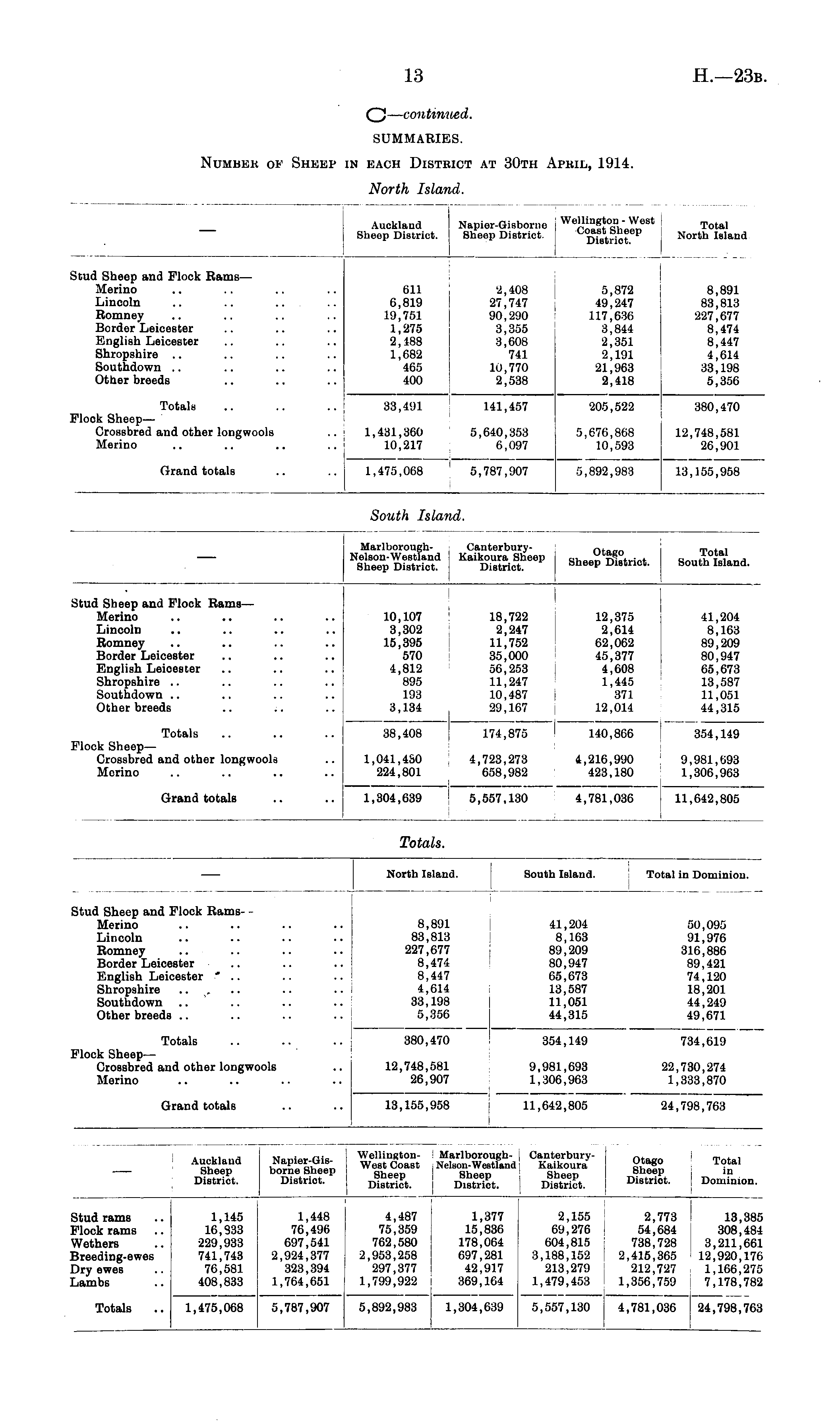 'ort Auckland Sheep District. Napier-Gisborne , Wellington - West Sh P ee P District. C <$&f^ Total North Island Itud Sheep and Flock RamsMerino Lincoln .. .. Romney Border Leicester English Leicester Shropshire Southdown Other breeds 611 6,819 19,751 1,275 2,488 1,682 465 400 2,408 27,747 90,290 3,355 3,608 741 10,770 2,538 5,872 49,247 117,636 3,844 2,351 2,191 21,963 2,418 8,891 83,813 227,677 8,474 8,447 4,614 33,198 5,356 Totals 33,491 141,457 205,522 380,470 ''look Sheep— Crossbred and other longwools Merino 1,431,360 10,217 5,640,353 6,097 5,676,868 10,593 12,748,581 26,901 Grand totals 1,475,068 5,787,907 5,892,983 13,155,958 South Island. Marlborough- Canterbury- r\t* n Nelson-Westland ' Kaikoura Sheep ov,««n Sheep District. District. bheep DlBtalct ' Total South Island. Stud Sheep and Flock Rams — Merino Lincoln Romney Border Leicester English Leicester Shropshire Southdown Other breeds .. 10,107 18,722 3,302 2,247 15,395 11,752 570 35,000 4,812 56,253 895 11,247 103 10,487 3,134 29,167 38,408 174,875 12,375 2,614 62,062 45,377 4,608 1,445 371 12,014 140,866 41,204 8,163 89,209 80,947 65,673 13,587 11,051 44,315 354,149 Totals Flock SheepCrossbred and other longwoole Merino 1,041,430 4,723,273 224,801 658,982 1,304,639 5,557,130 4,216,990 423,180 4,781,036 9,981,«93 1,306,963 11,642,805 Grand totals 4,781,036 11,642,805 Totals. North Island. South Island. South Island. Total in Domin Total in Dominion. Stud Sheep and Flock Earns- - Merino Lincoln Romney Border Leicester English Leicester " .. Shropshire Southdown Other breeds 8,891 83,813 227,677 8,474 8,447 4,614 33,198 5,356 41,204 8,163 89,209 80,947 65,673 13,587 11,051 44,315 50,095 91,976 316,886 89,421 74,120 18,201 44,249 49,671 Totals 380,470 354,149 734,619 Flock SheepCrossbred and other longwools Merino 12,748,581 26,907 9,981,693 1,306,963 22,730,274 1,333,870 Grand totals 13,155,958 11,642,805 24,798,763 .... vT i . nj. Wellington- Marlborough- CanterburyAucklaud Napier-Gis- We8t Coast Nelnon-Westlana Kaikoura Sheep borneSheep sh gh sb District. District. District. District. District. Otago Sheep Distriot. Total 'P Dominion. Stud rams Flock rams Wethers Breeding-ewes Dry ewes Lambs 1,145 16,333 229,933 741,743 76,581 408,833 1,448 76,496 697,541 2,924,377 323,394 1,764,651 4,487 75,359 762,580 2,953,258 297,377 1,799,922 1,377 15,836 178,064 697,281 42,917 369,164 2,155 2,773 13,385 69,276 j 54,684 j 308,484 604,815 I 738,728 I 3,211,661 3,188,152 ! 2,415,365 12,920,176 213,279 ! 212,727 , 1,166,275 1,479,453 ! 1,356,759 7,178,782 5,557,130 4,781,036 24,798,763 Totals 1,475,068 5,787,907 5,892,983 1,304,639