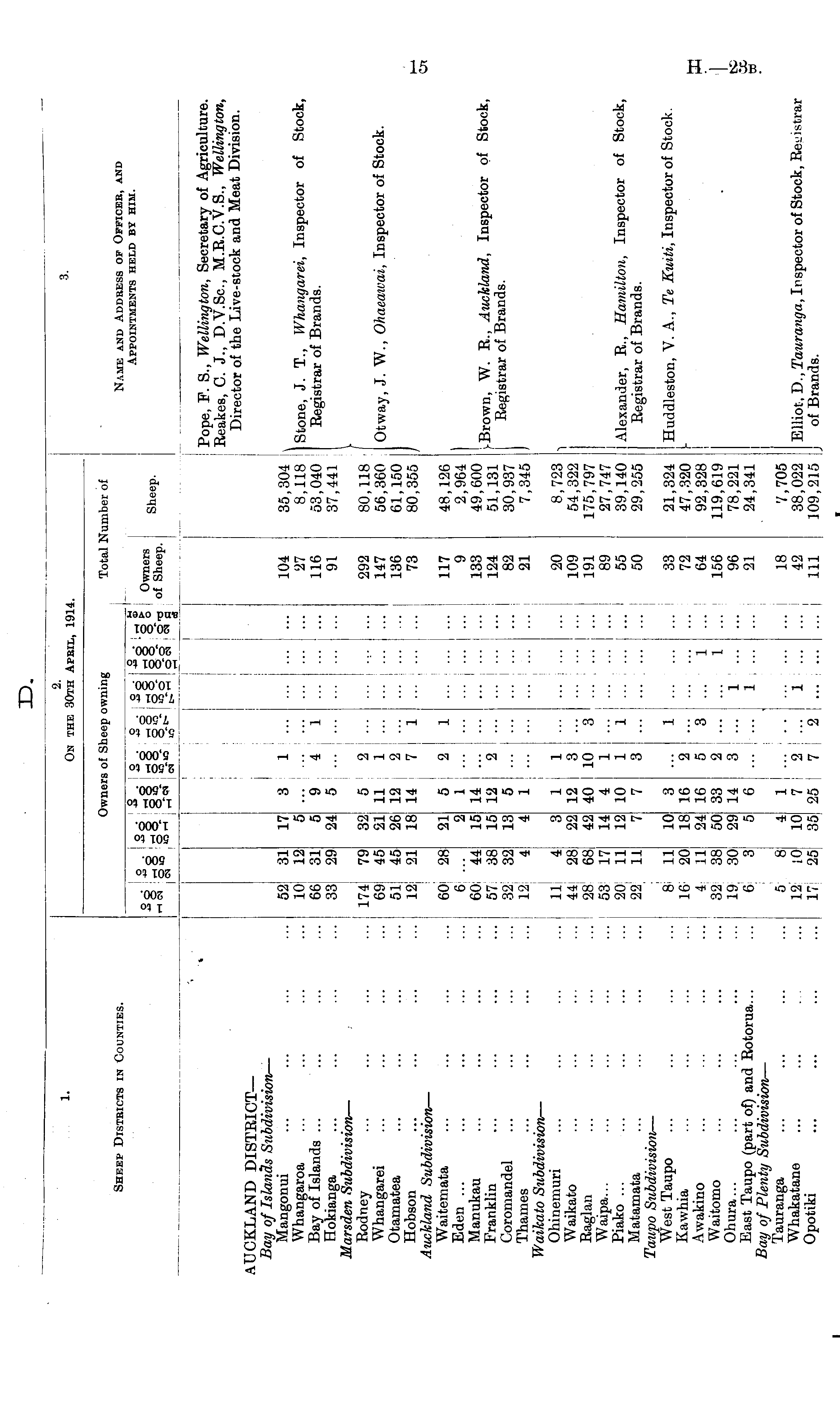 1. 2. On the 30th April, 1914. 3. Sheep Districts in Counties. Owners of Sheep owning Total: umber o£ Name and Address of Ofpicbb, and Appointments held by him. Q * o 3 s - ■2 • S - I S • I So -* I- I- Is g g §o Owners 8 o" o'-a of Sheep. OS <M C Sheep. * Pope, F. S., Wellington, Secretary of Agriculture. Reakes, C. J., D.V.Sc, M.E.C.V.S., Wellington, Director of the Live-stock and Meat Division. AUCKLAND DISTRICT— Bay of Islands Subdivision — Mangonui Whangaroa Bay of Islands ... ... Hokianga Marsden Subdivision — Rodney Whangarei Otamatea Hobson Auckland Subdivision — Waitemata Eden ... Manukau Franklin Coromandel Thames Waikato Subdivision — Ohinemuri Waikato Eaglan Waipa... Piako ... Matamata Taupo Subdivision — West Taupo Kawhia Awakino Waitomo Ohura... East Taupo (part of) and Eotorua... Bay of Plenty Subdivision — Tauranga Whakatane Opotiki 52 10 66 33 174 69 51 12 60J 6 6057i 32 12 31 12 31 29 79 45 45 21 44 38 32 4 17 5 5 24 32 21 26 18 21 15 15 13 4 3 1 ... 9 4 "i '.'.'. '.'.'. 5 5 2 11 1 12 2 14 7 1 5 2 1 1 14 12 2 5 1 I 104 27 116 91 292 147 136 73 117 9 133 124 82 21 35,304 8,118 53,040 37,441 80,118 56,360 61,150 80,355 48,126 2,964 49,600 51,131 30,937 7,345 Stone, J. T., Whangarei, Inspector of Stock, Eegistrar of Brands. Otway, J. W., Ohaeaivai, Inspector of Stock. j-Brown, W. E., Auckland, Inspector of Stock, Registrar of Brands. 11 44 28 53 20 22 4 28 68 17 11 11 3 22 42 14 12 7 1 1 12 3 40 10 3 4 1 10 1 1 ... ... 7 3 ... 20 109 191 89 55 50 8,723 54,322 175,797 27,747 39,140 29,255 Alexander, R., Hamilton, Inspector of Stock, Registrar of Brands. 8i 16' 4; 32 19 6 11 20 11 38 30 3 10 18 24 u0 29 5 3 ... 1 16 2 16 5 3 ... 1 33 2 1 14 3 ... 1 ... 6 ... ... 1 ... 1 7 2 ... 1 ... 25 I 7 2 ... 33 72 64 156 96 21 21,324 47,320 92,328 119,619 78,221 24,341 I Huddleston, V. A., Te Kuiti, Inspector of Stock. 5 12 17 8 10 25 4 10 35 ... i 18 42 111 7,705 38,022 109,215 Elliot, D., Tauranga, Inspector of Stock, Registrar of Brands.