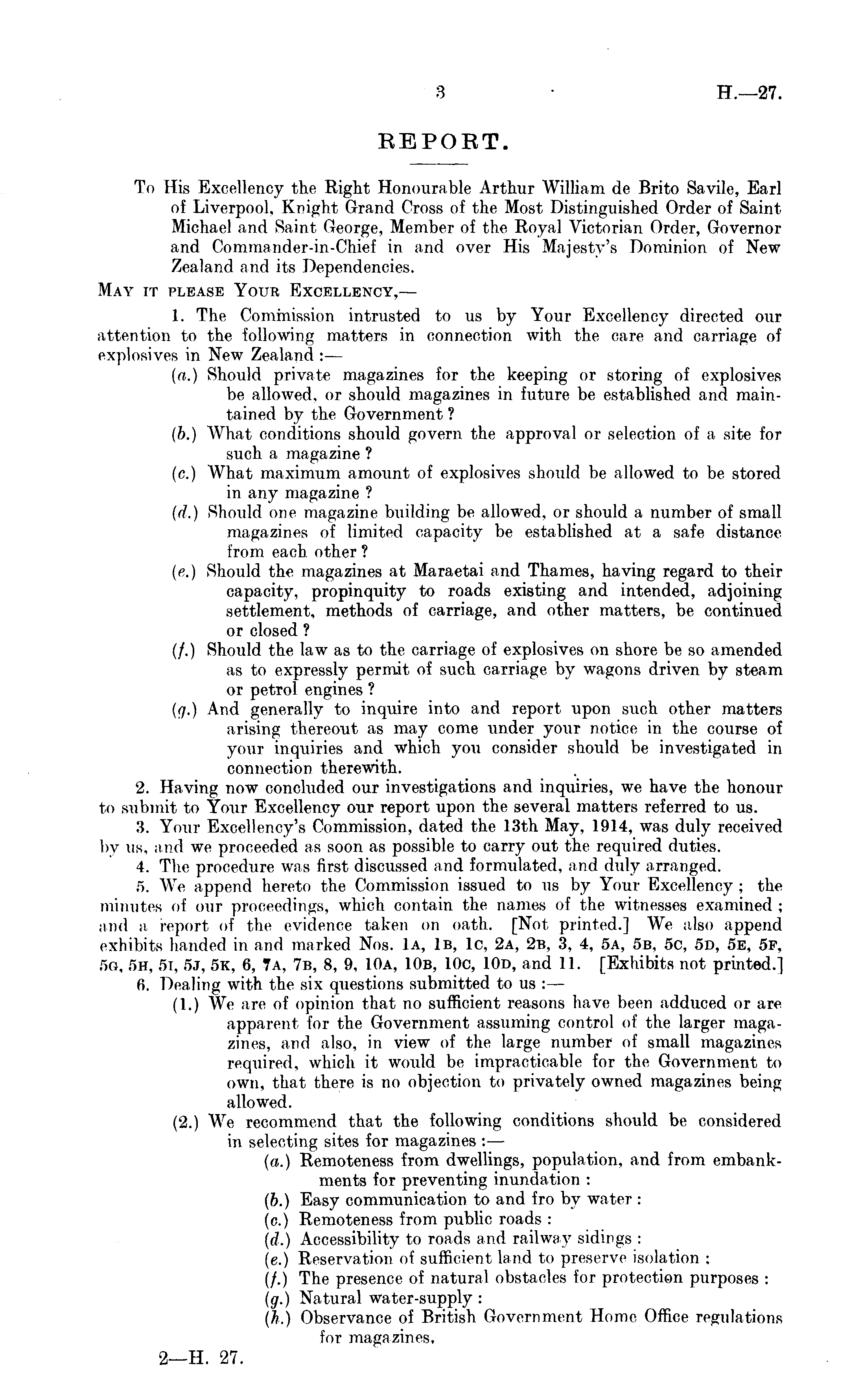 REPORT. To His Excellency the Right Honourable Arthur William de Brito Savile, Earl of Liverpool, Knight Grand Cross of the Most Distinguished Order of Saint Michael and Saini George, Member of the Royal Victorian Order, Governor and Commander-in-Chief in and over His Majesty's Dominion of New Zealand and its Dependencies. May it please Your Excellency,— 1. The Commission intrusted to us by Your Excellency directed our attention to the following matters in connection with the care and carriage of explosives in New Zealand : — (a.) Should private magazines for the keeping or storing of explosives be allowed, or should magazines in future be established and maintained by the Government ? (b.) What conditions should govern the approval or selection of a site for such a magazine ? (c.) What maximum amount of explosives should be allowed to be stored in any magazine ? (d.) Should one magazine building be allowed, or should a number of small magazines of limited capacity be established at a safe distance from each other ? {p.) Should the magazines at Maraetai and Thames, having regard to their capacity, propinquity to roads existing and intended, adjoining settlement, methods of carriage, and other matters, be continued or closed ? (/.) Should the law as to the carriage of explosives on shore be so amended as to expressly permit of such carriage by wagons driven by steam or petrol engines ? (g.) And generally to inquire into and report upon such other matters arising thereout as may come iinder your notice in the course of your inquiries and which you consider should be investigated in connection therewith. 2. Having now concluded our investigations and inquiries, we have the honour to submit to Your Excellency our report upon the several matters referred to us. 3. Your Excellency's Commission, dated the 13th May, 1914, was duly received by us, and we proceeded as soon as possible to carry out the required duties. 4. The procedure was first discussed and formulated, and duly arranged. 5. We append hereto the Commission issued to us by Your Excellency ; the minutes of our proceedings, which contain the names of the witnesses examined ; and a report of the evidence taken on oath. [Not printed.] We also append exhibits banded in and marked Nos. lα, Iβ, lc, 2a, 2b, 3, 4, sa, sb, sc, sd, se, sf, sg, sh, r>i. SJ, sk, 6, 7a, 7b, 8, 9, 10a, 10b, 10c, 10d, and 11. [Exhibits not printed.] 6. Dealing with the six questions submitted to us : — (1.) We arc of opinion that no sufficient reasons have been adduced or arc apparent for the Government assuming control of the larger magazines, and also, in view of the large number of small magazines required, which it would be impracticable for the Government to own, that there is no objection to privately owned magazines being allowed. (2.) We recommend that the following conditions should be considered in selecting sites for magazines :— (a.) Remoteness from dwellings, population, and from embankments for preventing inundation : (b.) Easy communication to and fro by water : (c.) Remoteness from public roads : (d.) Accessibility to roads am! railway sidings : (c.) Reservation of sufficient land to preserve isolation ; (/.) The presence of natural obstacles for protection purposes : (g.) Natural water-supply : (h.) Observance of British Government Home Office regulations for magazines.