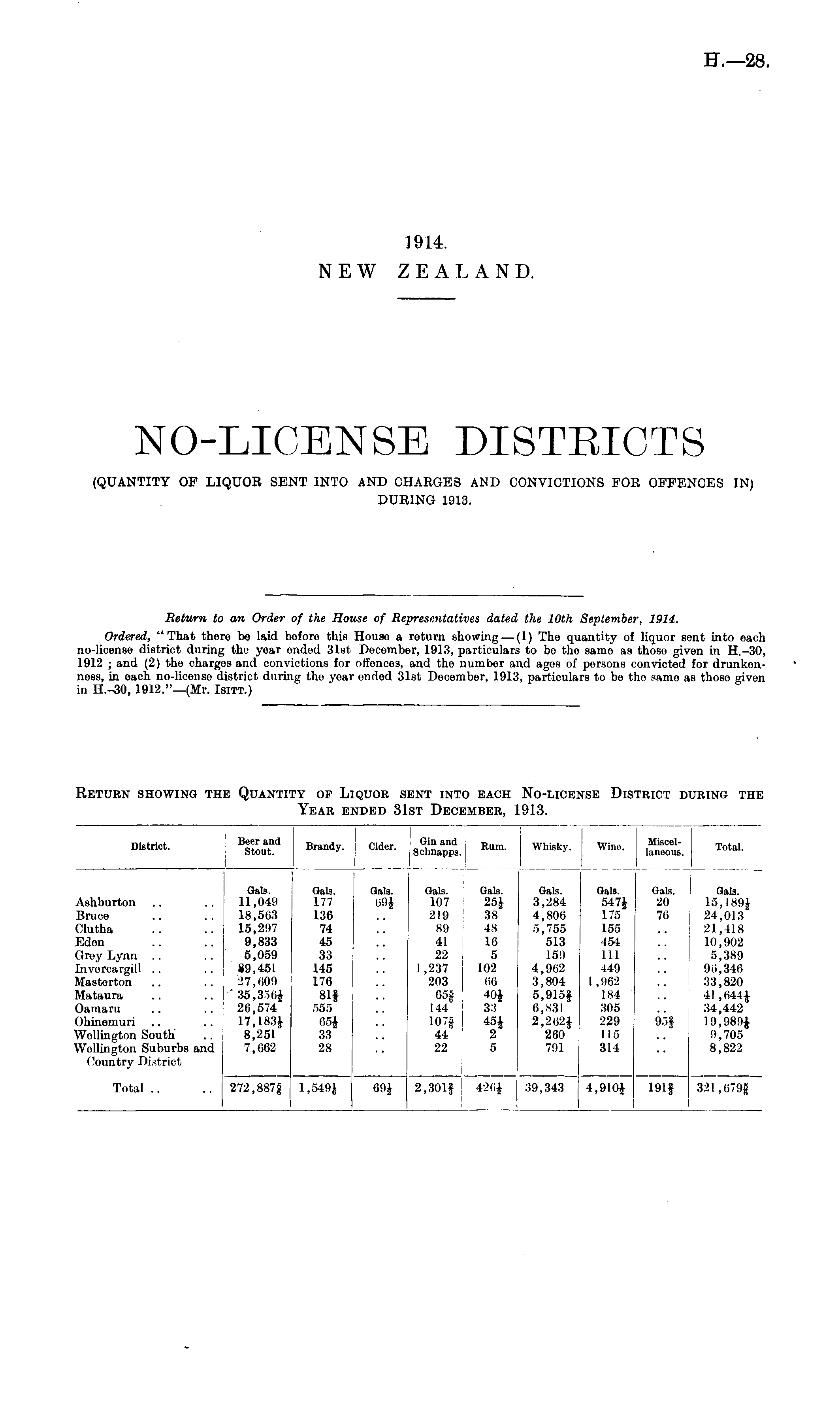 Return to an Order of the House of Representatives dated the 10th September, 1914. Ordered, "That there be laid before this House a return showing — (1) Tho quantity of liquor sent into each no-license district during the year onded 31st Docember, 1913, particulars to bo tho same as those given in H.-30, 1912 ; and (2) the charges and convictions for offonce3, and the number and ages of persons convicted for drunkenness, in each no-license district during the year onded 31st December, 1913, particulars to be tho same as those given in H.-30, 1912."—(Mr. Isitt.)