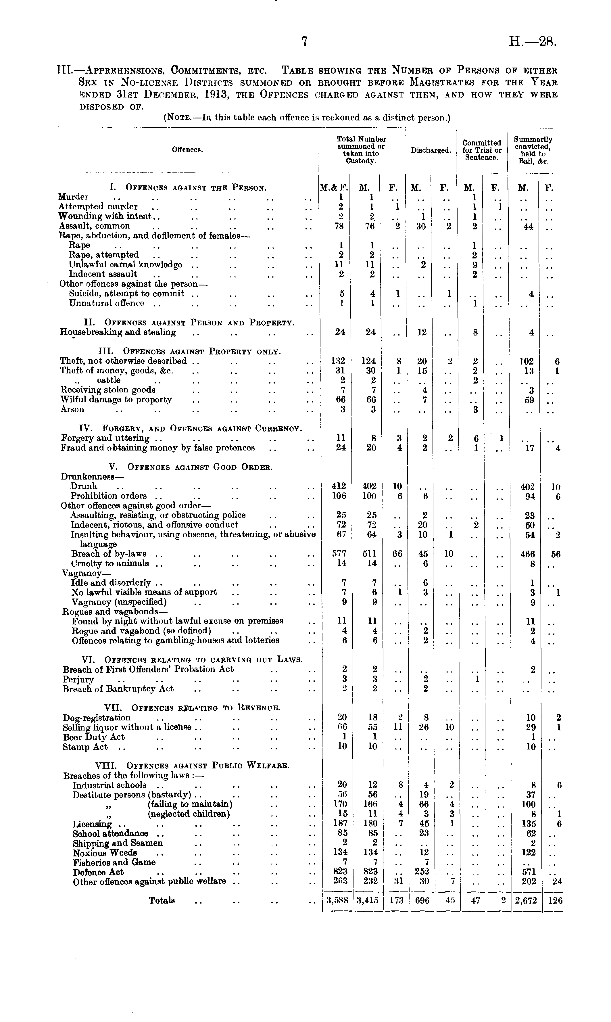 III.—Apprehensions, Commitments, etc. Table showing the Number of Persons of either Sex in No-license Districts summoned or brought before Magistrates for the Year ended 31st December, 1913, the Offences charged against them, and how they were disposed of.