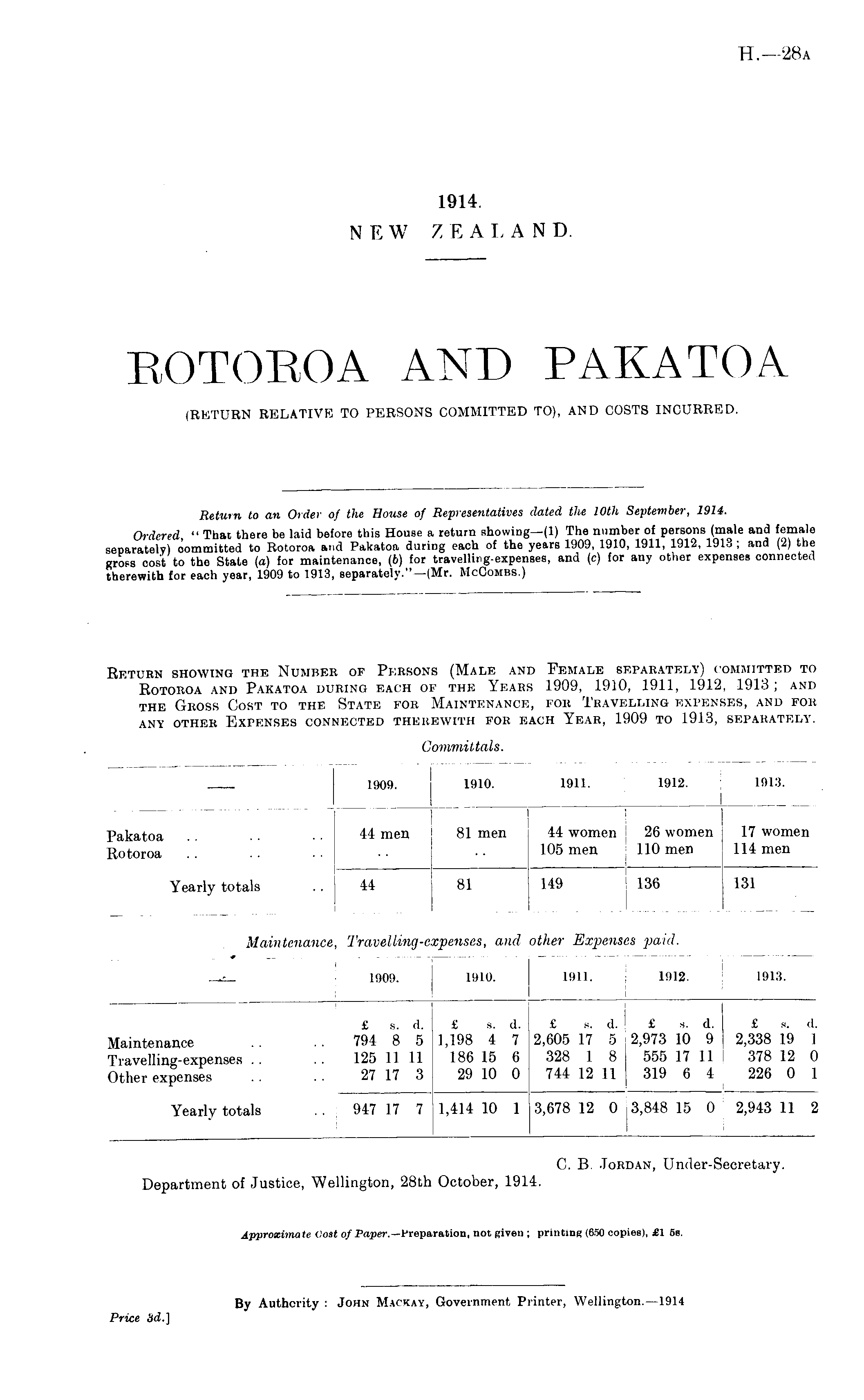 C. B. Jordan, Under-Secretary. Department of Justice, Wellington, 28th October, 1914.