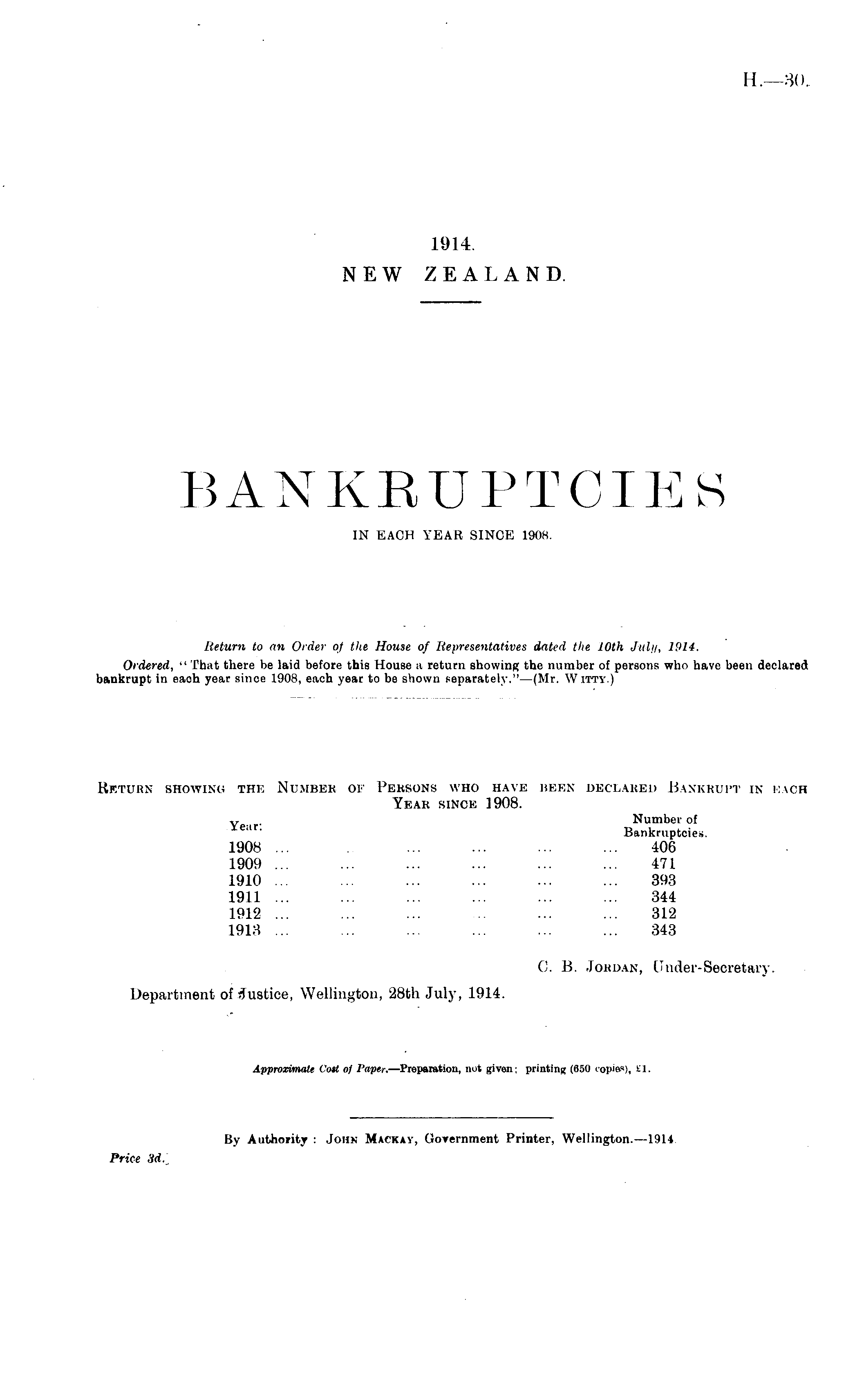 Return to an Order of tlte House of Representatives dated the 10th July, 1914. Ordered, " That there be laid before this House a return showing the number of persons who have been declared bankrupt in each year since 1908, each year to be shown separately."—(Mr. Witty.) Return showing the Number of Persons who have been declared Bankrupt in i:\ch Year since 1908. v Number of ear; Bankruptcies. 1908 ... . ... ... ... ... 406 1909 ... ... ... ... ... ... 471 1910 ... ... ... ... ... ... 393 1911 ... ... ... ... ... ... 344 1912 ... ... ... ... ... ... 312 1913 ... ... ... 343 C. B. Jordan, tinder-Secretary. Department of Justice, Wellington, 28th July, 1914.