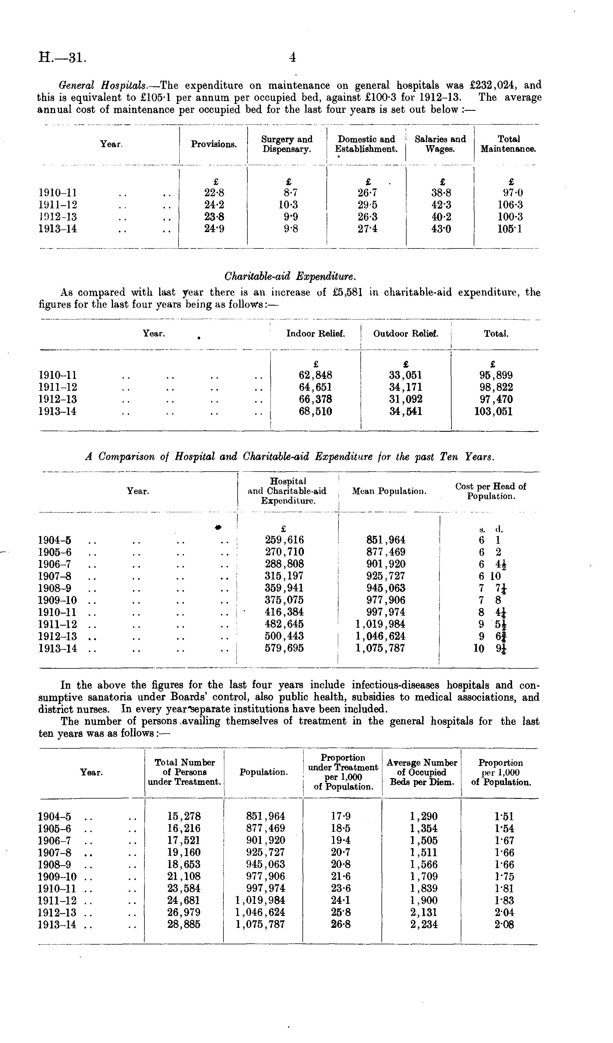 Year. Provisions. Surgery and Dispensary. Domestic and Establishment. Salaries and Wages. Total Maintenance. 1910-11 1911-12 1912-13 1913-14 £ 22-8 24-2 23-8 24-9 £ 8-7 10-3 9-9 9-8 £ 26-7 29-5 26-3 27-4 £ 38-8 42-3 40-2 43-0 £ 97-0 106-3 100-3 1051