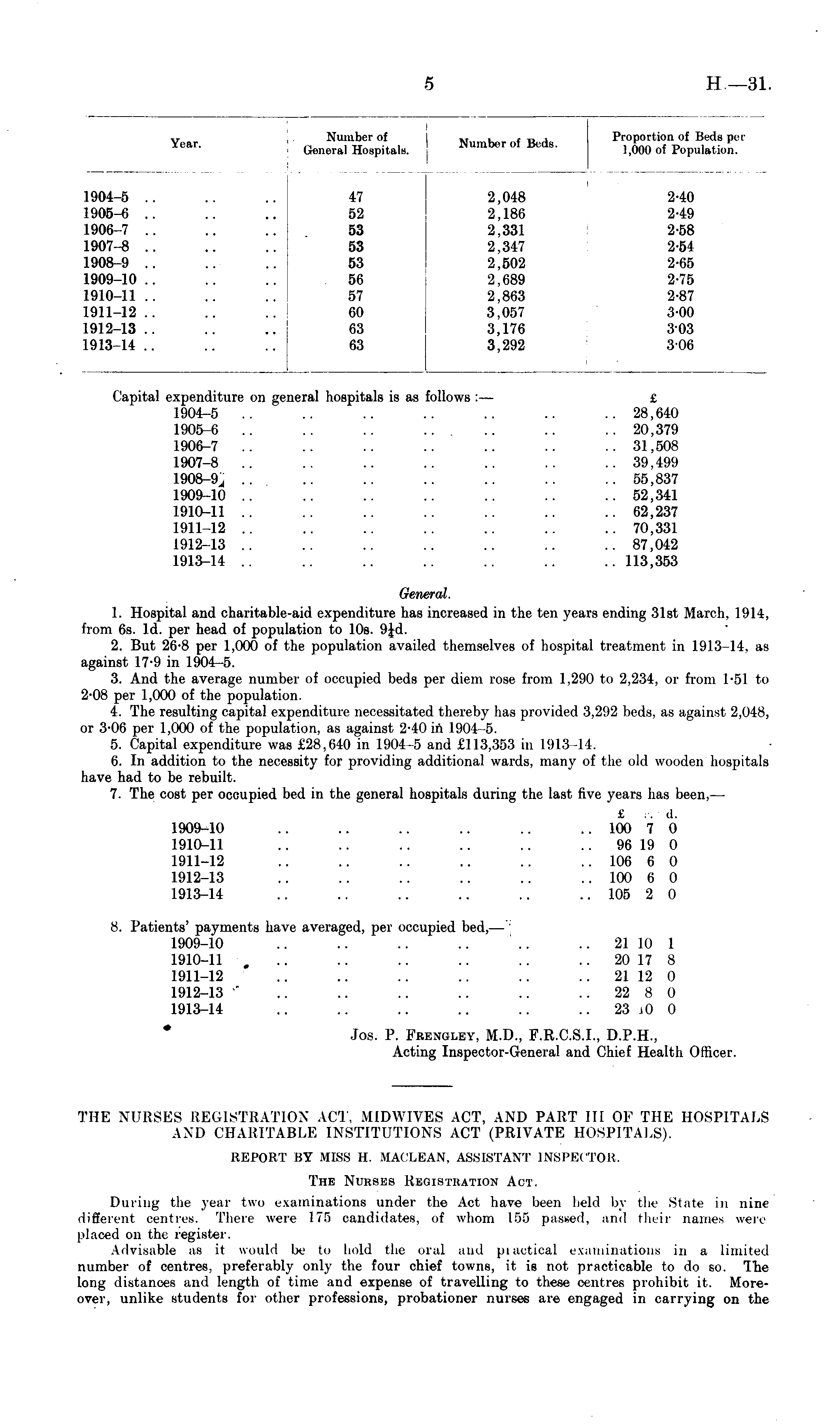 Year. Number of General Hospitals. Number of Bods. Proportion of Beds per 1,000 of Population. 1904-5 .. 1905-6 .. 1906-7 .. 1907-8 .. 1908-9 .. 1909-10 .. 1910-11 .. 1911-12 .. 1912-13 .. 1913-14 .. 47 52 53 53 53 . 56 57 60 63 63 2,048 2,186 2,331 2,347 2,502 2,689 2,863 3,057 3,176 3,292 2-40 2-49 2-58 2-54 2-65 2-75 2-87 3-00 3-03 306