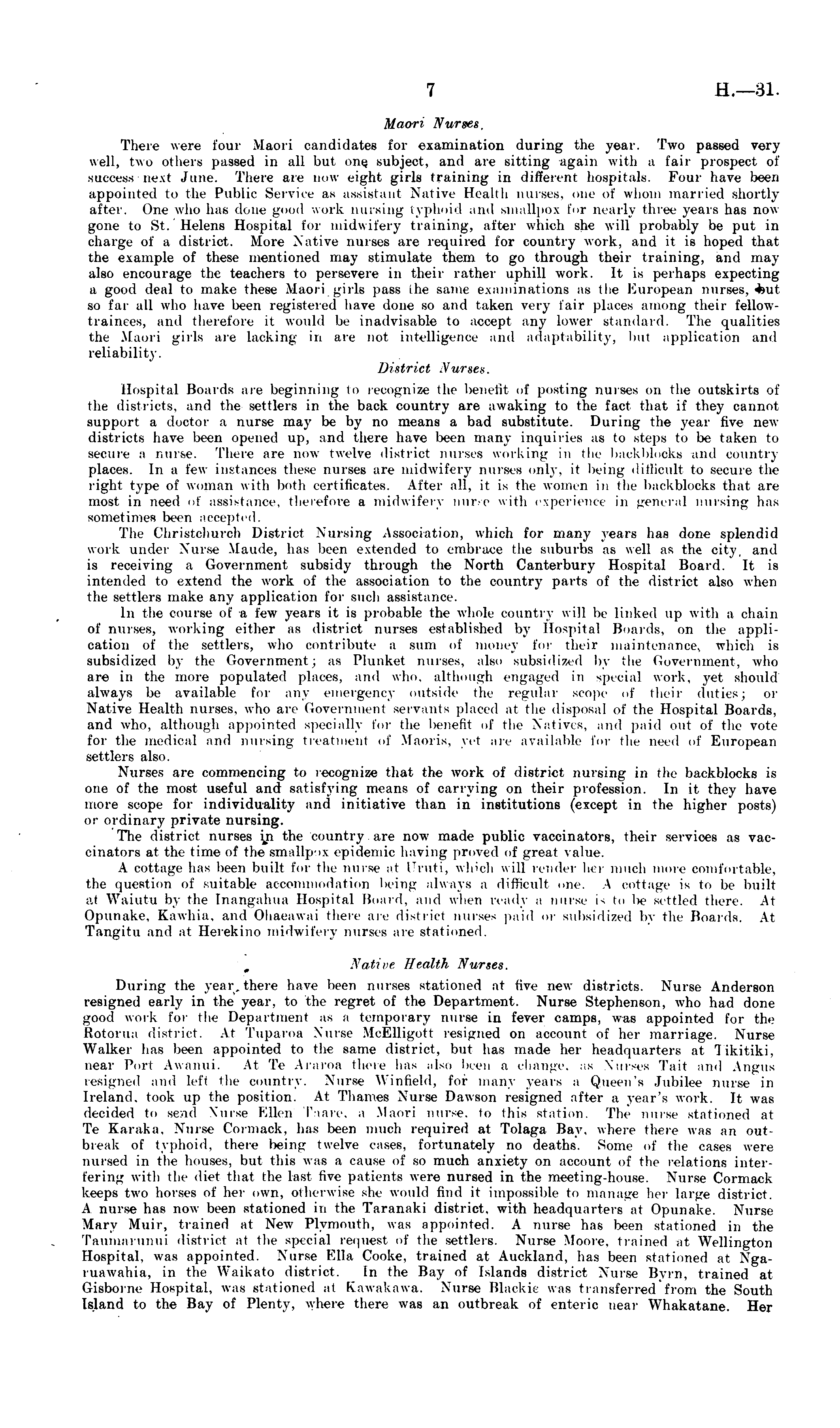 Maori Nurses. There were four Maori candidates for examination during the year. Two passed very well, two others passed in all but one subject, and are sitting again with a fair prospect of success next June. There are now eight girls training in different hospitals. Four have been appointed to the Public Service as assistant Native Health nurses, one of whom married shortly after. One who has done good work nursing typhoid and smallpox for nearly three years has nowgone to St. Helens Hospital for midwifery training, after which she will probably be put in charge of a district. More Native nurses are required for country work, and it is hoped that the example of these mentioned may stimulate them to go through their training, and may also encourage the teachers to persevere in their rather uphill work. It is perhaps expecting a good deal to make these Maori girls pass Lhe same examinations as the European nurses, -but so far all who have been registered have done so and taken very fair places among their fellowtrainees, and therefore it would be inadvisable to accept any lower standard. The qualities the Maori girls are lacking in are not intelligence and adaptability, but application and reliability. District Nurses. Hospital Boards are beginning to recognize the benefit of posting nurses on the outskirts of the districts, and the settlers in the back country are awaking to the fact that if they cannot support a doctor a nurse may be by no means a bad substitute. During the year five new districts have been opened up, and there have been many inquiries as to steps to be taken to secure a nurse. There are now twelve district nurses working in the backblocks and country places. In a few instances these nurses are midwifery nurses only, it being difficult to secure the right type of woman with both certificates. After all, it is the women in the backblocks that are most in need of assistance, therefore a midwifery nur-e with experience in genera] nursing has sometimes been accept d. The Christchurch District Nursing Association, which for many years has done splendid work under Nurse Maude, has been extended to embrace the suburbs as well as the city, and is receiving a Government subsidy through the North Canterbury Hospital Board. It is intended to extend the work of the association to the country parts of the district also when the settlers make any application for such assistance. In the course of a few years it is probable the whole country will be linked up with a chain of nurses, working either as district nurses established by Hospital Boards, on the application of the settlers, who contribute a sum of money for their maintenance, Which is subsidized by the Government; as Plunket nurses, also subsidized by the Government, who are in the more populated places, and who. although engaged in special work, vet should always be available for any emergency outside the regular sco] f their duties; or Native Health nurses, who are Government servants placed at the disposal of the Hospital Boards, and who. although appointed specially for the benefit of the Natives, and paid out of the vote for the medical and nursing treatment of Maoris, yet are available for ihe need of European settlers also. Nurses are commencing to recognize that the work of district nursing in the backblocks is one of the most useful and satisfying means of carrying on their profession. In it they have more scope for individuality and initiative than in institutions (except in the higher posts) or ordinary private nursing. The district nurses iji the country tire now made public vaccinators, their services as vaccinators at the time of the smallpox epidemic having proved of great value. A cottage has been built for the nurse at I'ruti. which will render hi r much more comfort abli . the question of suitable accommodation being always a difficult <>ne. \ cottage is to be built at Waiutu by the [nangahua Hospital Hoard, and when ready a nurse is In lie settled there. At Opunake, Kawhia, and Ohaeawai there are district nurses paid or subsidized by the Boards. At Tangitu and at Herekino midwifery nurses are stationed. Nativt Health Nurses. During the year, there have been nurses stationed at live new districts. Nurse Anderson resigned early in the year, to the regret of the Department. Nurse Stephenson, who had done good work for the Department as a temporary nurse in fever camps, was appointed for tin.' Rotorua district. At Tuparoa Nurse McElligot! resigned on account of her marriage. Nurse Walker has been appointed to the same district, but has made her headquarters at likitiki, near Port Awanui. At Te Araroa there has also been a change, as Nurses Tail and Angus resigned and left the country. Nurse Winficld, for many years a Queen's Jubilee nurse in Ireland, took up the position. At Thames Nurse Dawson resigned after a year's work. It was decided i" send Nurse Ellen dare, a Maori nurse, to ihis station. The nurse stationed at Te Karaka. Nurse Cormack, litis been much required at Tolaga Bay. where there was an outbreak of typhoid, there being twelve cases, fortunately no deaths. Some of the cases were nursed in the houses, but this was a cause of so much anxiety on account of the relations interfering with the diet that the last five patients were nursed in the meeting-house. Nurse Cormack keeps two horses of her own. otherwise she would find it impossible to manage her large district. A nurse has now been stationed in the Taranaki district, with headquarters at Opunake. Nurse Mary Muir, trained at New Plymouth, was appointed. A nurse has been stationed in the Taumarunui district a! the special request of the settlers. Nurse Moore, trained at Wellington Hospital, was appointed. Nurse Ella Cooke, trained at Auckland, has been stationed at Ngaruawahia. in the Waikato district. In the Bay of Islands district Nurse Byrn, trained at Gisborne Hospital, was stationed ai Kawakawa. Nurse Blackie was transferred from the South Isl