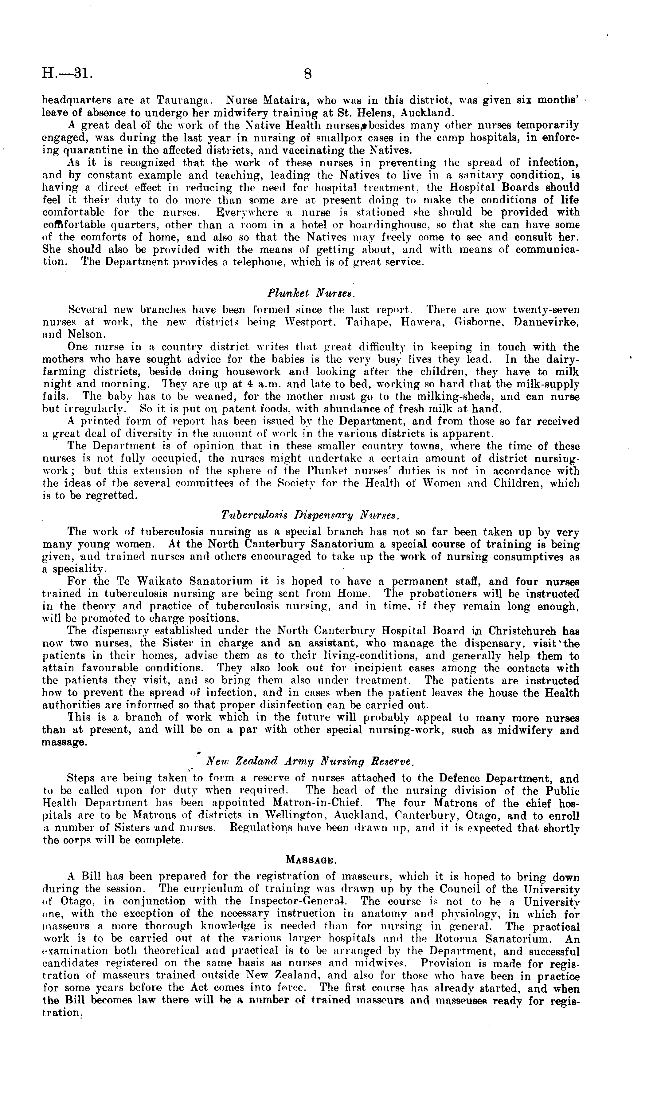 headquarters are at Tauranga. Nurse Mataira, who was in this district, was given six months' leave of absence to undergo her midwifery training at St. Helens, Auckland. A great deal of the work of the Native Health nurses,»besides many other nurses temporarily engaged, was during the last year in nursing of smallpox cases in the camp hospitals, in enforcing quarantine in the affected districts, and vaccinating the Natives. As it is recognized that the work of these nurses in preventing the spread of infection, and by constant example and teaching, leading the Natives to live in a sanitary condition, is having a direct effect in reducing the need for hospital treatment, the Hospital Boards should feel it their duty to do more than some are at present doing to make the conditions of life comfortable for the nurses. Everywhere a nurse is stationed she should lie provided with comfortable quarters, other than a room in a hotel or boardinghouse, so that she can have some of the comforts of home, and also so that the Natives may freely come to see and consult her. She should also be provided with the means of getting about, and with means of communication. The Department provides a telephone, which is of great service. Plunket Nurses. Several new branches have been formed since the last report. There are now twenty-seven nurses at work, the new districts being Westport, Taihape, Hawera, Gisborne, Dannevirke, and Nelson. One nurse in a country district writes that great difficulty in keeping in touch with the mothers who have sought advice for the babies is the very busy lives they lead. In the dairyfarming districts, beside doing housework and looking after the children, they have to milk night and morning. Ihey are up at 4 a.m. and late to bed, working so hard that the milk-supply fails. The baby has to be weaned, for the mother must go to the niilking-sheds. and can nurse but irregularly. So it is put on patent foods, with abundance of fresh milk at hand. A printed form of report lias been issued by the Department, and from those so far received a great deal of diversity in the amount id' work in the various districts is apparent. The Department is of opinion that in these smaller country towns, where the time of these nurses is not fully occupied, the nurses might undertake a certain amount of district nursingwork; but this extension of the sphere of the Plunket nurses' duties is not in accordance with the ideas of the several committees of the Society for the Health of Women and Children, which is to be regretted. Tuberculosis Dispensary Nurse*. The work of tuberculosis nursing as a special branch has not so far been taken up by very mnny young women. At the North Canterbury Sanatorium a special course of training is being given, and trained nurses and others encouraged to take up the work of nursing consumptives as a speciality. For the Te Waikato Sanatorium it is hoped to have a permanent staff, and four nurses trained in tuberculosis nursing are being sent from Home. The probationers will be instructed in the theory and practice of tuberculosis nursing, and in time, if they remain long enough, will be promoted to charge positions. The dispensary established under the North Canterbury Hospital Board in Christchurch has now two nurses, the Sister in charge and an assistant, who manage the dispensary, visit the patients in their homes, advise them as to their living-conditions, and generally help them to attain favourable conditions. They also look out for incipient cases among the contacts with the patients they visit, and so bring them also under treatment. The patients are instructed how to prevent the spread of infection, and in cases when the patient leaves the house the Health authorities are informed so that proper disinfection can be carried out. This is a branch of work which in the future will probably appeal to many more nurses than at present, and will be on a par with other special nursing-work, such as midwifery and massage. Nein Zealand Army Nursing Reserve. Steps are l>eing taken to form a reserve of nurses attached to the Defence Department, and to l>e called upon for duty when required. The head of the nursing division of the Public Health Department has lieen appointed Matron-in-Chief. The four Matrons of the chief hospitals are to be Matrons of districts in Wellington. Auckland. Canterbury, Otago, and to enroll a number of Sisters and nurses. Regulations have been drawn up, and it is expected that shortly the corps will be complete. Massage. A Bill has been prepared for the registration of masseurs, which it is hoped to bring down during the session. The curriculum of training was drawn up by the Council of the University of Otago, in conjunction with the Inspector-General. The course is not to be a University one, with the exception of the necessary instruction in anatomy and physiology, in which for masseurs a more thorough knowledge is needed than for nursing in general. The practical work is to be carried out at the various larger hospitals and the Rotorua Sanatorium. An examination both theoretical and practical is to be arranged by the Department, and successful candidates registered on the same basis as nurses and midwives. Provision is made for registration of masseurs trained outside New Zealand, and also for those who have been in practice for some years before the Act comes into ferce. The first course has already started, and when the Bill becomes law there will be a number of trained masseurs and masseuses ready for regist ration.