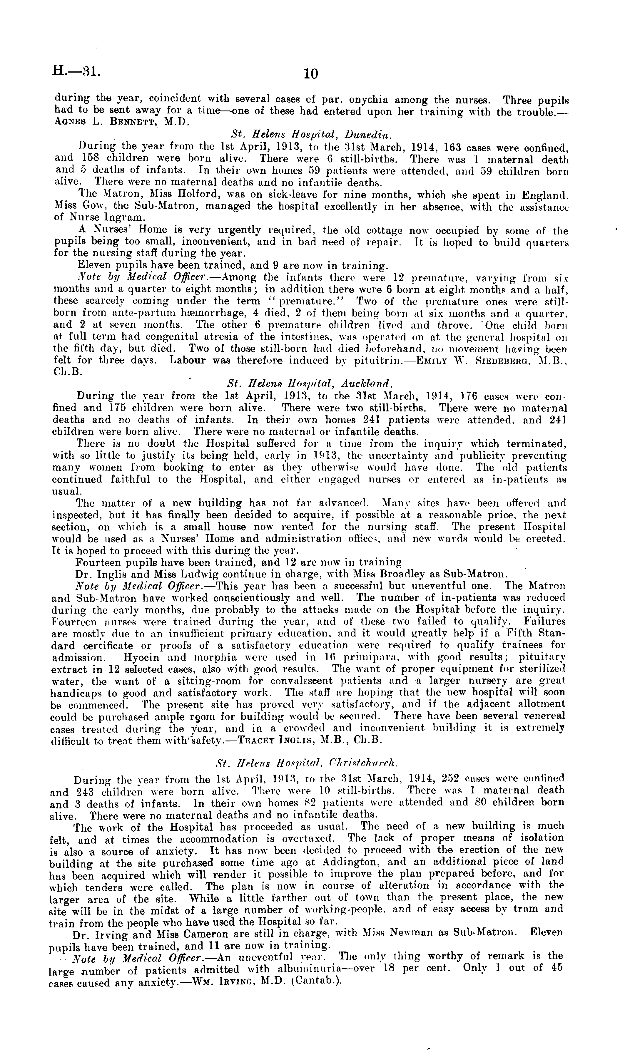 during the year, coincident with several cases cf par. onychia among the nurses. Three pupils had to be sent away for a time —one of these had entered upon her training with the trouble.— Agnes L. Bennett, M.D. St. Helens Hospital. Dunedin. During the year from the Ist April, 1913, to the 31st March, 1914, 163 cases were confined, and 158 children were born alive. There were 6 still-births. There was I maternal death and 5 deaths of infants. In their own homes 59 patients were attended, and 59 children born alive. There were no maternal deaths and no infantile deaths. The Matron, Miss Holford, was on sick-leave for nine months, which she spent in England. Miss Gow, the Sub-Matron, managed the hospital excellently in her absence, with the assistance of Nurse Ingram. A Nurses' Home is very urgently required, the old cottage now occupied by some of the pupils being too small, inconvenient, and in bad need of repair. It is hoped to build quarters for the nursing staff during the year. Eleven pupils have been trained, and 9 are now in training. .Vote by Medical Officer. —Among the infants then- were 12 premature, varying from six months and a quarter to eight months; in addition there were 6 born at eight months and a half, these scarcely coming under the term " premature." Two of the premature ones were stillborn from ante-part urn haemorrhage, 4 died, 2 of them being born at six months and a quarter, and 2 at seven months. The other 6 premature children lived and throve. One child born at full term had congenital atresia of the intestines, was operated on at the general hospital on the fifth day, but died. Two of those still-born had died beforehand, no movement having been felt for three days. Labour was therefore induced by pituitrin. —Emily YV. Siedeberg, M.8., Ch.B. St. Helens Hospital, Auckland. During the year from the Ist April, 1913. to the 31st March, 1911, 176 eases were confined and 175 children were born alive. There were two still-births. There were no maternal deaths and no deaths of infants. In their own homes 211 patients were attended, and 241 children were born alive. There were no maternal or infantile deaths. There is no doubt the Hospital suffered for a time from the inquiry which terminated, with so little to justify its being held, early in 1913, the uncertainty and publicity preventing many women from booking to enter as they otherwise would have done. The old patients continued faithful to the Hospital, and either engaged nurses or entered as in-patients as usual. The matter of a new building has not far advanced. Many sites have been offered and inspected, but it has finally been decided to acquire, if possible at a reasonable price, the next section, on which is a small house now rented for the nursing staff. The present Hospital would be used as a Nurses' Home and administration offices, ami new wards would be erected. It is hoped to proceed with this during the year. Fourteen pupils have been trained, and 12 are noxv in training Dr. Inglis and Miss Ludwig continue in charge, with Miss Broadley as Sub-Matron. Note I)y Medical Officer. —This year has been a successful but uneventful one. The Matron and Sub-Matron have worked conscientiously and well. The number of in-patients was reduced during the early months, due probably to the attacks made on the Hospital- before the inquiry. Fourteen nurses were trained during the year, and of these two failed to qualify. Failures are mostly due to an insufficient primary education, and it would greatly help if a Fifth Standard certificate or proof's of a satisfactory education were required to qualify trainees for admission. Hyocin and morphia were used in Hi primipara, with good results; pituitary extract in 12 selected cases, also with good results. The want of proper equipment for sterilized water, the want of a sitting-room for convalescent patients and a larger nursery are great handicaps to good and satisfactory work. The staff are hoping that the new hospital will soon be commenced. The present site has proved very satisfactory, and if the adjacent allotment could be purchased ample room for building would be secured. 'Iliere have been several venereal cases treated during the year, and in a crowded and inconvenient building it is extremely difficult to treat them with/safety. —Tkacey Inglis, M.8., Ch.B. St. Helens Hospital. Christchurch. During the year from the Ist April, 1913, to the 31st March, 1911, 252 eases were confined and 243 children were born alive. There were 10 still-births. There was 1 maternal death and 3 deaths of infants. In their own homes 82 patients were attended and 80 children born alive. There were no maternal deaths and no infantile deaths. The work of the Hospital has proceeded as usual. The need of a new building is much felt, and at times the accommodation is overtaxed. The lack of proper means of isolation is also a source of anxiety. It has now been decided to proceed with the erection of the new building at the site purchased some time ago at Addington, and an additional piece of land has been acquired which will render it possible to improve the plan prepared before, and for which tenders were called. The plan is now in course of alteration in accordance with the larger area of the site. While a little farther out of town than the present place, the new site will be in the midst of a large number of working-people, and of easy access by tram and train from the people who have used the Hospital so far. Dr. Irving and Miss Cameron are still in charge, with Miss Newman as Sub-Matron. Eleven pupils have been trained, and 11 are now in training. Xote by Medical Officer. —An uneventful year. The only thing worthy of remark is the large number of patients admitted with albuminuria—over 18 per cent. Only 1 out of 45 cases caused any anxiety.— Wm. Irving, M.D. (Cantab.).