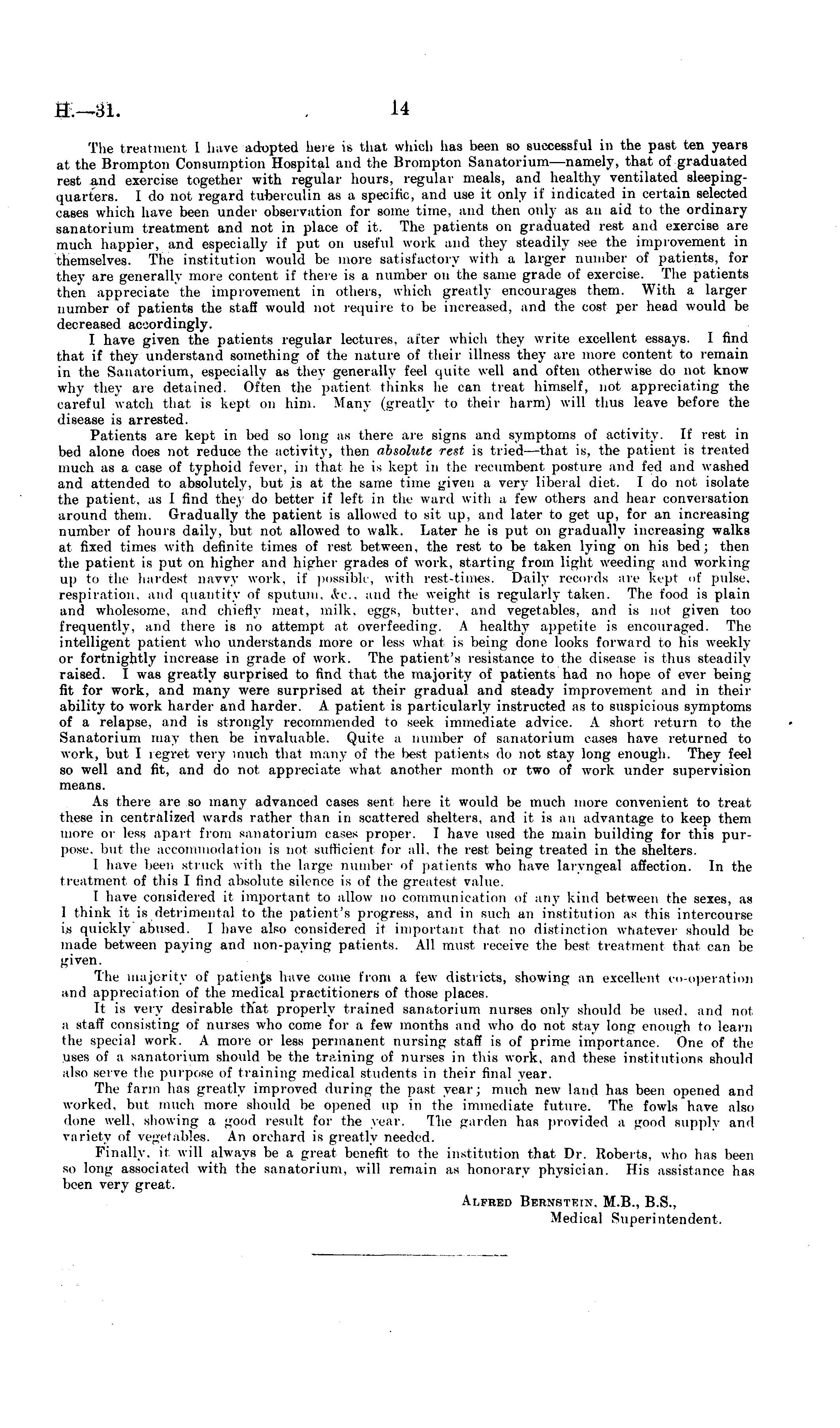 The treatment 1 have adopted here is that which has been so successful in the past ten years at the Brompton Consumption Hospital and the Brompton Sanatorium —namely, that of graduated rest and exercise together with regular hours, regular meals, and healthy ventilated sleepingquarters. Ido not regard tuberculin as a specific, and use it only if indicated in certain selected cases which have been under observation for some time, and then only as an aid to the ordinary sanatorium treatment and not in place of it. The patients on graduated rest and exercise are much happier, and especially if put on useful work and they steadily see the improvement in themselves. The institution would be more satisfactory with a larger number of patients, for they are generally more content if there is a number on the same grade of exercise. The patients then appreciate the improvement in others, which greatly encourages them. With a larger number of patients the staff would not require to be increased, and the cost per head would be decreased accordingly. I have given the patients regular lectures, alter which they write excellent essays. I find that if they understand something of the nature of their illness they are more content to remain in the Sanatorium, especially as they generally feel quite well and often otherwise do not know why they are detained. Often the patient thinks he can treat himself, not appreciating the careful watch that is kept on him. Many (greatly to their harm) will thus leave before the disease is arrested. Patients are kept in bed so long as there are signs and symptoms of activity. If rest in bed alone does not reduce the activity, then absolute rest is tried —that is, the patient is treated much as a case of typhoid fever, in that he is kept in the recumbent posture and fed and washed and attended to absolutely, but is at the same time given a very liberal diet. I do not isolate the patient, as I find the\ do better if left in the ward with a few others and hear conversation around them. Gradually the patient is allowed to sit up, and later to get up, for an increasing number of hours daily, but not allowed to walk. Later he is put on gradually increasing walks at fixed times with definite times of rest between, the rest to be taken lying on his bed; then the patient is put on higher and higher grades of work, starting from light weeding and working up to the hardest navvy work, if possible, with rest-times. Daily records are kept of pulse. respiration, and quantity of sputum, &c, and the weight is regularly taken. The food is plain and wholesome, and chiefly meat, milk, eggs, butter, and vegetables, and is not given too frequently, and there is no attempt at overfeeding. A healthy appetite is encouraged. The intelligent patient who understands more or less what is being done looks forward to his weekly or fortnightly increase in grade of work. The patient's resistance to the disease is thus steadily raised. I was greatly surprised to find that the majority of patients had no hope of ever being fit for work, and many were surprised at their gradual and steady improvement and in their ability to work harder and harder. A patient is particularly instructed as to suspicious symptoms of a relapse, and is strongly recommended to seek immediate advice. A short return to the Sanatorium may then be invaluable. Quite a number of sanatorium cases have returned to work, but I legret very much that many of the best patients do not stay long enough. They feel so well and fit, and do not appreciate what another month or two of work under supervision means. As there are so many advanced cases sent here it would be much more convenient to treat these in centralized wards rather than in scattered shelters, and it is an advantage to keep them more or loss apart from sanatorium cases proper. I have used the main building for this purpose, but the accommodation is not sufficient for all. the rest being treated in the shelters. 1 have been struck with the large number of patients who have laryngeal affection. In the treatment of this I find absolute silence is of the greatest value. I have considered it important to allow no communication of any kind between the sexes, as I think it is detrimental to the patient's progress, and in such an institution as this intercourse is quickly abused. I have also considered it important that no distinction whatever should be made between paying and non-paying patients. All must receive the best treatment that can be given. The majority of patients have come from a few districts, showing an excellent co-operation and appreciation of the medical practitioners of those places. It is very desirable that properly trained sanatorium nurses only should be used, and not a staff consisting of muses who come for a few months and who do not stay long enough to learn the special work. A more or less permanent nursing staff is of prime importance. Our of the Uses of a sanatorium should be the training of nurses in this work, and these institutions should also serve the purpose of training medical students in their final year. The farm has greatly improved during the pas! year; much new laud has been opened and worked, but much more should be opened up in the immediate future. The fowls have also done well, showing a good result for the year. The garden has provided a good supply and variety of vegetables. An orchard is greatly needed. Finally. n will always be a great benefit to the institution that Dr. Roberts, who has been so long associated with the sanatorium, will remain as honorary physician. His assistance has been very great. Alfred Bernsthin. M.8., 8.5., Medical Superintendent.