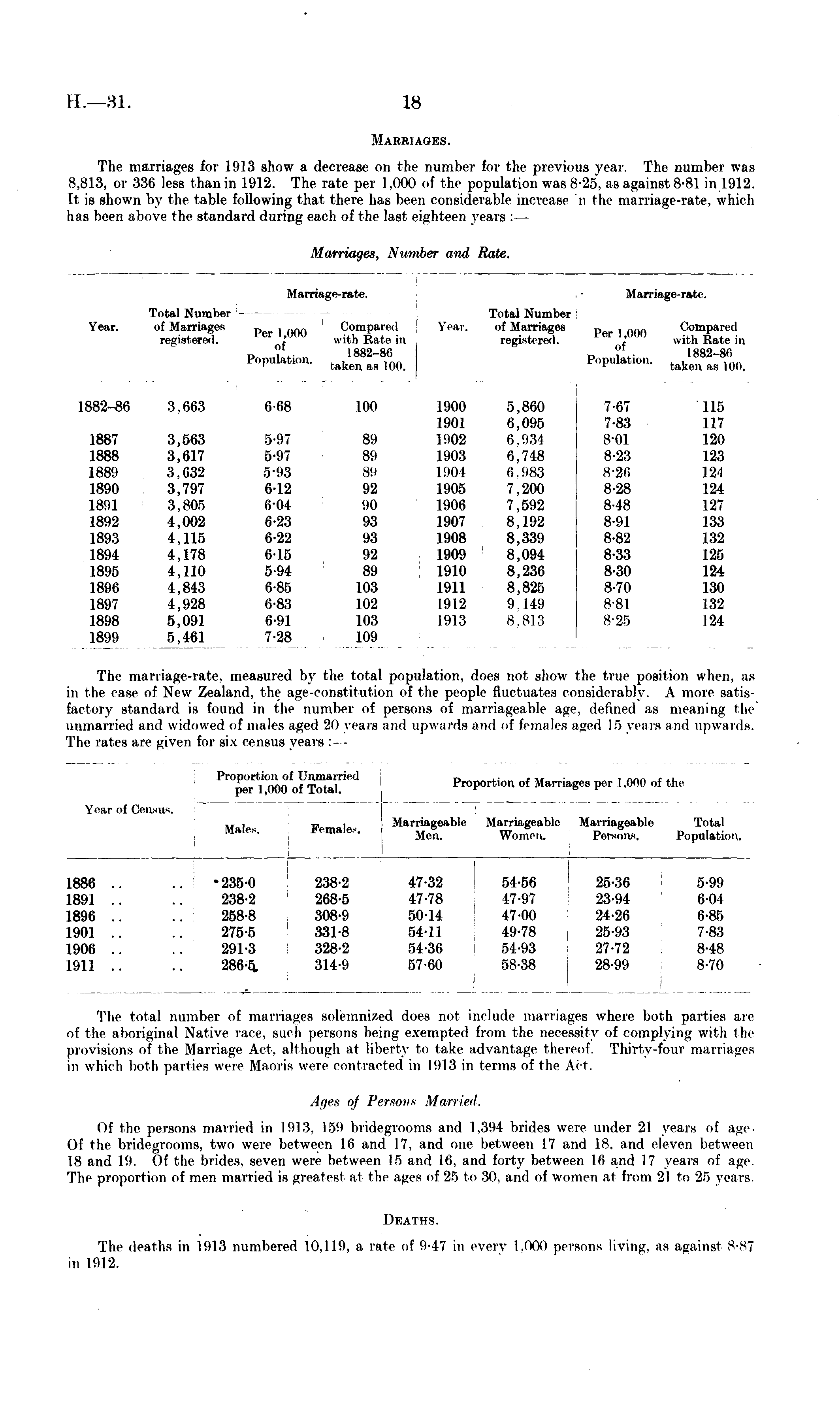 Marriages. The marriages for 1913 show a decrease on the number for the previous year. The number was 8,813, or 336 less than in 1912. The rate per 1,000 of the population was 8-25, as against 8-81 in 1912. It is shown by the table following that there has been considerable increase n the marriage-rate, which has been above the standard during each of the last eighteen years :—