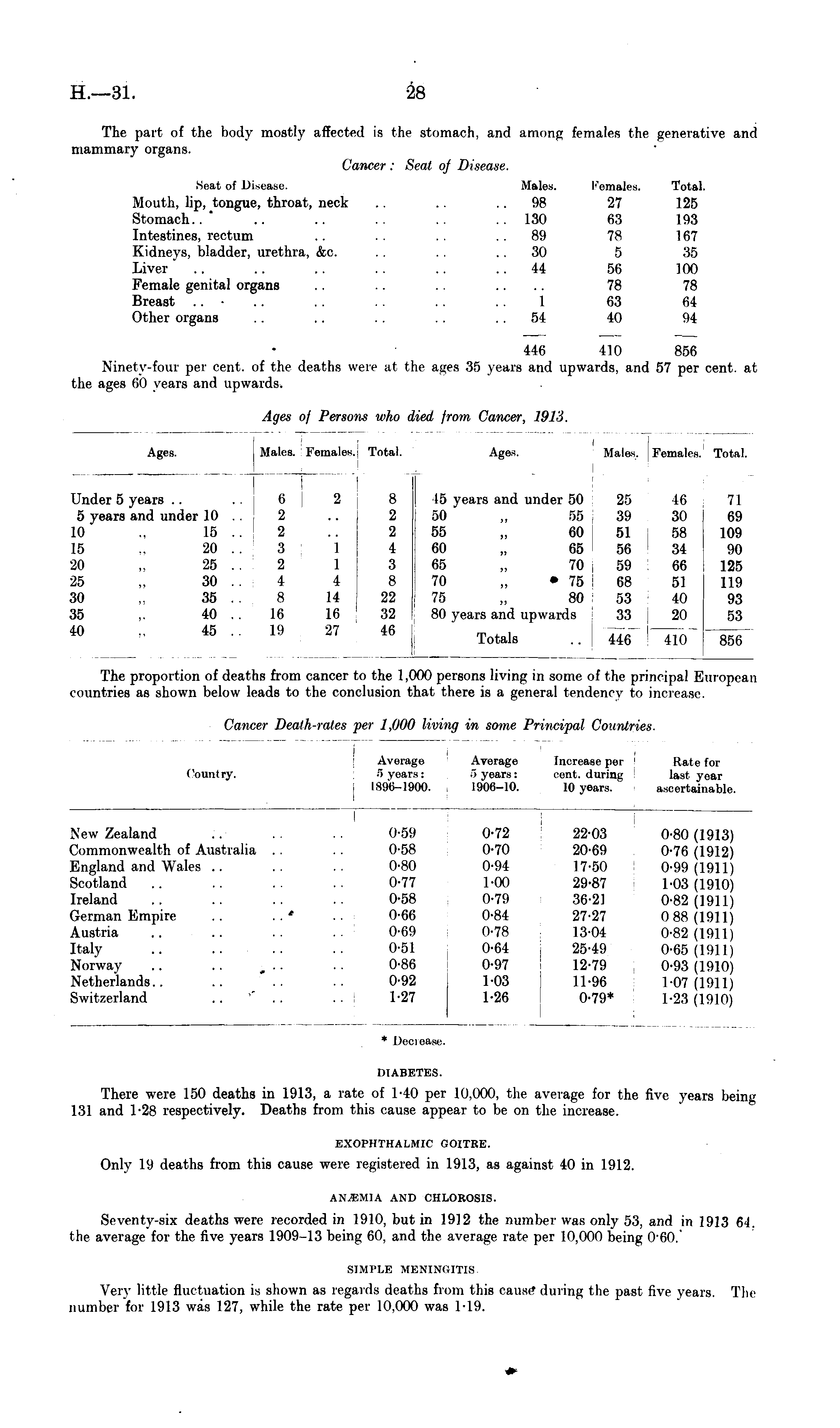 diabetes. There were 150 deaths in 1913, a rate of 1-40 per 10,000, the average for the five years being 131 and T2B respectively. Deaths from this cause appear to be on the increase. EXOPHTHALMIC GOITRE. Only 19 deaths from this cause were registered in 1913, as against 40 in 1912. ANEMIA AND CHLOROSIS. Seventy-six deaths were recorded in 1910, but in 1912 the number was only 53, and in 1913 6J. the average for the five years 1909-13 being 60, and the average rate per 10,000 being 060. SIMPLE MENINGITIS Very little fluctuation is shown as regards deaths from this canst' during the past five years. The number for 1913 was 127, while the rate per 10,000 was Tl9.