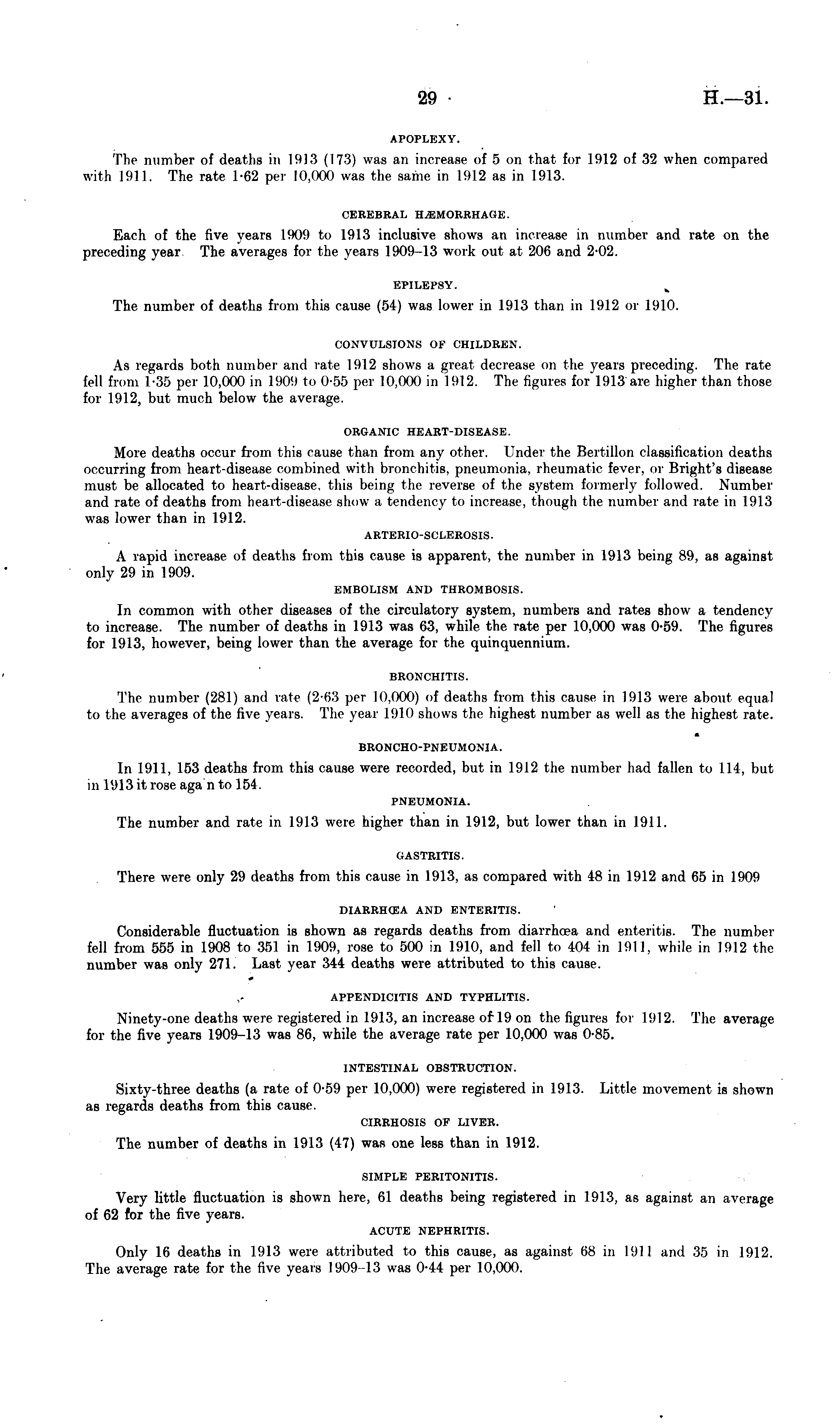 APOPLEXY. The number of deaths in 1913 (173) was an increase of 5 on that for 1912 of 32 when compared with 1911. The rate 1-62 per 10,000 was the same in 1912 as in 1913. CEREBRAL HEMORRHAGIC. Each of the five years 1909 to 1913 inclusive shows an increase in number and rate on the preceding year The averages for the years 1909-13 work out at 206 and 2-02. epilepsy. k The number of deaths from this cause (54) was lower in 1913 than in 1912 or 1910. CONVULSIONS OF CHILDREN. As regards both number and rate 1912 shows a great decrease on the years preceding. The rate fell from 1-35 per 10,000 in 1909 to 0-55 per X).(XX) in 1912. The figures for 1913 are higher than those for 1912, but much below the average. ORGANIC HEART-DISEASE. More deaths occur from this cause than from any other. Under the Bertillon classification deaths occurring from heart-disease combined with bronchitis, pneumonia, rheumatic fever, or Bright's disease must be allocated to heart-disease, this being the reverse of the system formerly followed. Number and rate of deaths from heart-disease show a tendency to increase, though the number and rate in L 913 was lower than in 1912. ARTERIO-SCLEROSIS. A rapid increase of deaths from this cause is apparent, the number in 1913 being 89, as against only 29 in 1909. EMBOLISM AND THROMBOSIS. In common with other diseases of the circulatory system, numbers and rates show a tendency to increase. The number of deaths in 1913 was 63, while the rate per 10,000 was 0-59. The figures for 1913, however, being lower than the average for the quinquennium. BRONCHITIS. The number (281) and rati- (2-63 per 10.000) of deaths from this cause in 1913 were about equal to the averages of the five years. The year 1910 shows the highest number as well as the highest rate. BRONCHO-PNEUMONIA. In 1911, 153 deaths from this cause were recorded, but in 1912 the number had fallen to 114, but in 1913 it rose agan to 154. PNEUMONIA. The number and rate in 1913 were higher than in 1912, but lower than in 1911. GASTRITIS. There were only 29 deaths from this cause in 1913, as compared with 48 in 1912 and 65 in 1909 DIARRHO3A AND ENTERITIS. Considerable fluctuation is shown as regards deaths from diarrhoea and enteritis. The number fell from 555 in 1908 to 351 in 1909, rose to 500 in 1910, and fell to 404 in 1911, while in 1912 the number was only 271. Last year 344 deaths were attributed to this cause. APPENDICITIS AND TYPHLITIS. Ninety-one deaths were registered in 1913, an increase of 19 on the figures for 1912. The average for the five years 1909-13 was 86, while the average rate per 10,000 was 0-85. INTESTINAL OBSTRUCTION. Sixty-three deaths (a rate of 0-59 per 10,000) were registered in 1913. Little movement is shown as regards deaths from this cause. CIRRHOSIS OF LIVER. The number of deaths in 1913 (47) was one less than in 1912. SIMPLE PERITONITIS. Very little fluctuation is shown here, 61 deaths being registered in 1913, as against an average of 62 for the five years. ACUTE NEPHRITIS. Only 16 deaths in 1913 were attributed to this cause, as against 68 in 1911 and 35 in 1912. The average rate for the five years 1909-13 was 0-44 per 10,000.