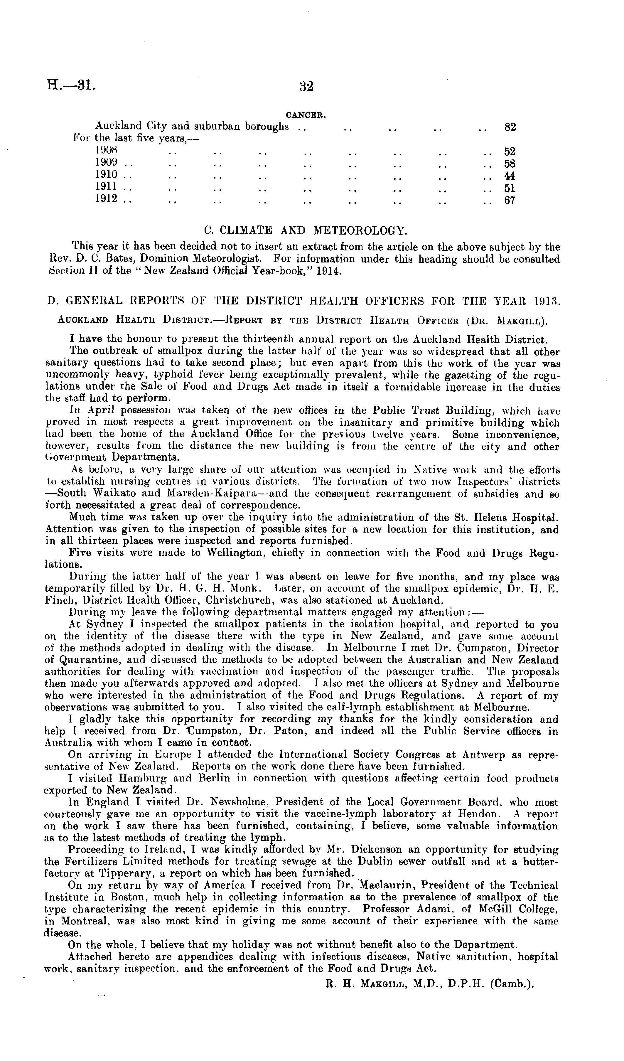 CANCER. Auckland City and suburban boroughs . . .. .. .. 82 For the last five years,— 1908 .. .. .. .. . . .. 52 1909 58 1910 .......... 44 1911 51 1912 67 C. CLIMATE AND METEOROLOGY. This year it has been decided not to insert an extract from the article on the above subject by the Rev. D. C. Bates, Dominion Meteorologist. For information under this heading should be consulted ■Section II of the "New Zealand Official Year-book," 1914. D. GENERAL REPORTS OF THE DISTRICT HEALTH OFFICERS FOR THE YEAI! L 913. Auckland Health District.—Report by run District Health Officer (Dh. Makgill). I have the honour to present the thirteenth annual report on the Auckland Health District. The outbreak of smallpox during the latter half of the year was so widespread that all other sanitary questions had to take second place; but even apart from this the work of the year was uncommonly heavy, typhoid fever being exceptionally prevalent, while the gazetting of the regulations under the Sale of Food and Drugs Act made in itself a formidable increase in the duties the staff had to perform. In April possession was taken of the new offices in the Public Trust Building, which have proved in most respects a great improvement on the insanitary and primitive building which had been the home of the Auckland Office for the previous twelve years. Some inconvenience, however, results from the distance the new building is from the centre of the city and other Government Departments. As before, a very large .share of our attention was occupied in Native work and the efforts to establish nursing centres in various districts. The formation of two now Inspectors' districts —South Waikato and Marsden-Kaipara—and the consequent rearrangement of subsidies and so forth necessitated a great deal of correspondence. Much time was taken up over the inquiry into the administration of the St. Helens Hospital. Attention was given to the inspection of possible sites for a new location for this institution, and in all thirteen places were inspected and reports furnished. Five visits were made to Wellington, chiefly in connection with the Food and Drugs Regulations. During the latter half of the year I was absent on leave for five months, and my place was temporarily filled by Dr. H. G. H. Monk. Later, on account of the smallpox epidemic, Dr. H. K. Finch, District Health Officer, Christchurch, was also stationed at Auckland. During my leave the following departmental matters engaged my attention: — At Sydney I inspected the smallpox patients in the isolation hospital, and reported to you on the identity of the disease there with the type in New Zealand, and gave some account of the methods adoptee! in dealing with the disease. In Melbourne I met Dr. Cumpston, Director of Quarantine, and discussed the methods to be adopted between the Australian and New Zealand authorities for dealing with vaccination and inspection of the passenger traffic. The proposals then made you afterwards approved and adopted. I also met the officers at Sydney and Melbourne who were interested in the administration of the Food and Drugs Regulations. A report of my observations was submitted to you. I also visited the calf-lymph establishment at Melbourne. I gladly take this opportunity for recording my thanks for the kindly consideration and help I received from Dr. Cumpston, Dr. Paton, and indeed all the Public Service officers in Australia with whom I came in contact. On arriving in Europe I attended the International Society Congress at Antwerp as representative of New Zealand. Reports on the work done there have been furnished. I visited Hamburg and Berlin in connection with questions affecting certain food products exported to New Zealand. In England I visited Dr. Newsholme, President of the Local Government Board, who most courteously gave me an opportunity to visit the vaccine-lymph laboratory at Hendon. A report on the work I saw there has been furnished, containing, I believe, some valuable information as to the latest methods of treating the lymph. Proceeding to Ireland, I was kindly afforded by Mr. Dickenson an opportunity for studying the Fertilizers Limited methods for treating sewage at the Dublin sewer outfall and at a butterfactory at Tipperary, a report on which has been furnished. On my return by way of America I received from Dr. Maclaurin, President of the Technical Institute in Boston, much help in collecting information as to the prevalence of smallpox of the type characterizing the recent epidemic in this country. Professor Adami, of McGill College, in Montreal, was also most kind in giving me some account of their experience with the same disease. On the whole, I believe that my holiday was not without benefit also to the Department. Attached hereto are appendices dealing with infectious diseases. Native sanitation, hospital work, sanitary inspection, and the enforcement of the Food and Drugs Act. R. H. Makgill, M.D., D.P.H. (Camb.).