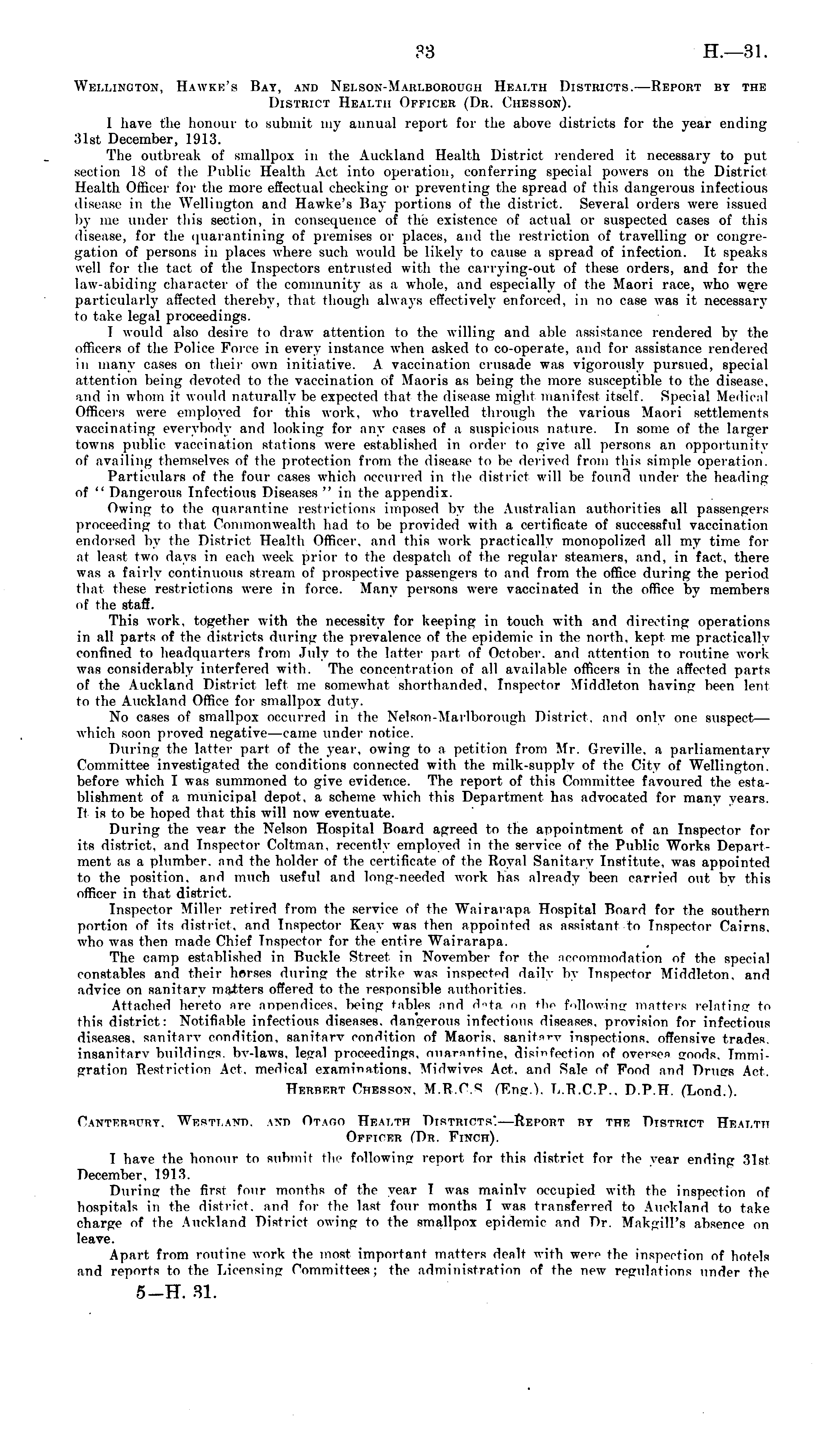 Wellington, Hawke's Bay, anb Nelson-Mari.borodgh Health Districts.—Report by the District Health Officer (Dr. Cues son). I have the honour to submit my annual report for the above districts for the year ending 31st December, 1913. The outbreak of smallpox in the Auckland Health District rendered it necessary to put section 18 of the Public Health Act into operation, conferring special powers on the District Health Officer for the more effectual checking or preventing the spread of this dangerous infectious disease in the Wellington and Hawke's Hay portions of the district. Several orders were issued by me under this section, in consequence of the existence of actual or suspected cases of this disease, for the quarantining of premises or places, and the restriction of travelling or congregation of persons in places where such would be likely to cause a spread of infection. It speaks well for the tact of the Inspectors entrusted with the carrying-out of these orders, and for the law-abiding character of the community as a whole, and especially of the Maori race, who were particularly affected thereby, that though always effectively enforced, in no case was it necessary to take legal proceedings. T would also desire to draw attention to the willing and able assistance rendered by the officers of the Police Force in every instance when asked to co-operate, and for assistance rendered in many cases on their own initiative. A vaccination crusade was vigorously pursued, special attention being devoted to the vaccination of Maoris as being the more susceptible to the disease. and in whom it would naturally be expected that the disease might manifest itself. Special Medical Officers were employed for this work, who travelled through the various Maori settlements vaccinating everybody and looking for any cases of a suspicious nature. In some of the larger towns public vaccination stations were established in order to give all persons an opportunity of availing themselves of the protection from the disease to be derived from this simple operation. Particulars of the four cases which occurred in the district will be found under the heading of " Dangerous Infectious Diseases " in the appendix. Owing to the quarantine restrictions imposed by the Australian authorities all passengers proceeding to that Commonwealth had to be provided with a certificate of successful vaccination endorsed by the District Health Officer, and this work practically monopolized all my time for at least two days in each week prior to the despatch of the regular steamers, and, in fact, there was a fairly continuous stream of prospective passengers to and from the office during the period thai these restrictions were in force. Many persons were vaccinated in the office hy members of the staff. This work, together with the necessity for keeping in touch with and directing operations in all parts of the districts during the prevalence of the epidemic in the north, kept me practically confined to headquarters from July to the latter part of October, and attention to routine work was considerably interfered with. The concentration of all available officers in the affected parts of the Auckland District left me somewhat shorthanded. Inspector Middleton having been lent to the Auckland Office for smallpox duty. No cases of smallpox occurred in the Nelson-Marlborough District, and only one suspect— which soon proved negative—came under notice. During the latter part of the year, owing to a petition from Mr. Oreville. a parliamentary Committee investigated the conditions connected with the milk-supply of the City of Wellington, before which I was summoned to give evidence. The report of this Committee favoured the establishment of a municipal depot, a scheme which this Department has advocated for many years. It is to be hoped that this will now eventuate. During the year the Nelson Hospital Board agreed to the appointment of an Inspector for its district, and Inspector Coltman, recently employed in the service of the Public Works Department as a plumber, and the holder of the certificate of the Royal Sanitary Institute, was appointed to the position, and much useful and long-needed work has already been carried out by this officer in that district. Inspector Miller retired from the service of the Wairarapa Hospital Board for the southern portion of its district, and Inspector Keay was then appointed as assistant to Inspector Cairns, who was then made Chief Inspector for the entire Wairarapa. The camp established in Buckle Street in November for the accommodation of the special constables and their hru-scs during the strike was inspected daily by Inspector Middleton. and advice on sanitary matters offered to the responsible authorities. Attached hereto are anpendices, being tables and d»ta on the following matters relating to this district: Notifiable infectious diseases, dangerous infectious diseases, provision for infectious diseases, snnitarv condition, sanitary condition of Maoris, sanitf-v inspections, offensive trades, insanitary buildings, by-laws, legal proceedings, onarantine, disinfection of over«er> fjoods. Immigration Restriction Act. medical examinations. Midwives Act, and Sale of Food and Drucs Act. Herbert Chesson. M.R.G.S fEncr.'). L.R.C.P., D.P.H. (Lond.). Canterbury. Westt.anp. and Otaoo Health Districts".—Report by the District Health Officer (Dr. Finch). I have the honour to submit the following report for this district for the year ending 31st December, 1913. During the first four months of the year I was mainly occupied with the inspection of hospitals in the district, and for the last four months I was transferred to Auckland to take charge of the Auckland District owing to the smallpox epidemic and Dr. Makgill's absence on leave. Apart from routine work the most important matters dealt with were the inspection of hotels and reports to the Licensing Committees; the administration of the new regulations 