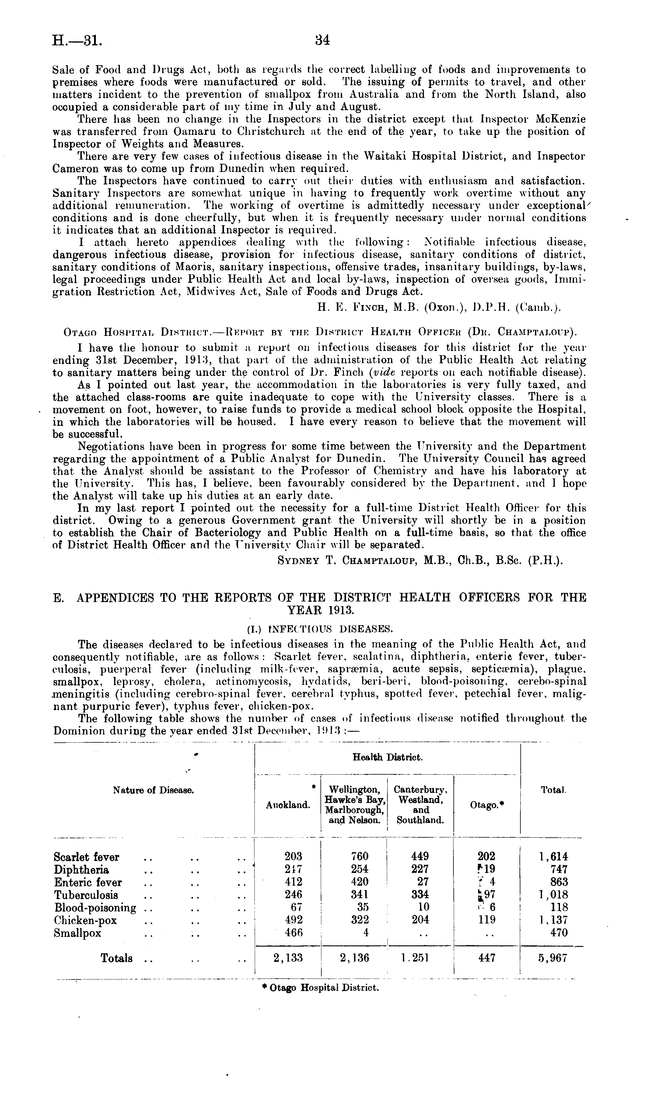 Sale of Food and Drugs Act, both as regards the correct labelling of foods and improvements to premises where foods were manufactured or sold. The issuing of permits to travel, and other matters incident to the prevention of smallpox from Australia and from the North Island, also occupied a considerable part of my time in July and August. There has been no change in the Inspectors in the district except that Inspector McKenzie was transferred from Oamaru to Christchurch at the end of the year, to take up the position of Inspector of Weights and Measures. There are very few cases of infectious disease in the Waitaki Hospital District, and Inspector Cameron was to come up from Dunedin when required. The Inspectors have continued to carry out their duties with enthusiasm and satisfaction. Sanitary Inspectors are somewhat unique in having to frequently work overtime without any additional remuneration. The working of overtime is admittedly necessary under exceptional conditions and is done cheerfully, but when it is frequently necessary under normal conditions it indicates that an additional Inspector is required. I attach hereto appendices dealing with the following: Notifiable infectious disease, dangerous infectious disease, provision for infectious disease, sanitary conditions of district, sanitary conditions of Maoris, sanitary inspections, offensive trades, insanitary buildings, by-laws, legal proceedings under Public Health Act and local by-laws, inspection of oversea goods, Immigration Restriction Act, Midwives Act, Sale of Foods and Drugs Act. H. E. I-'inch, M.B. (0x011.). D.P.H. (Camb.). Otago Hospital District.—Report by the District Health Officer (Dr. Champtai.oip). I have the honour to submit a report on infectious diseases for this district for the year ending 31st December, 1913, that part of the administration of the Public Health Act relating to sanitary matters being under the control of Dr. Finch (vide reports on each notifiable disease). As 1 pointed out last year, the accommodation in the laboratories is very fully taxed, and the attached class-rooms are quite inadequate to cope with the University classes. There is a movement on foot, however, to raise funds to provide a medical school block opposite the Hospital, in which the laboratories will be housed. I have every reason to believe that the movement will be successful. Negotiations have been in progress for some time between the University and the Department regarding the appointment of a Public Analyst for Dunedin. The University Council has agreed that the Analyst should be assistant to the Professor of Chemistry and have his laboratory at the University. This has, I believe, been favourably considered by the Department, and 1 hope the Analyst will take up his duties at an early date. In my last report I pointed out the necessity for a full-time District Health Officer for this district. Owing to a generous Government grant the University will shortly be in a position to establish the Chair of Bacteriology and Public Health on a full-time basis, so that the office of District Health Officer and the University Chair will be separated. Sydney T. Champtaloup, M.8., Ch.B., B.Sc. (P.H.). E. APPENDICES TO THE REPORTS OF THE DISTRICT HEALTH OFFICERS FOR THE YEAR 1913. (I.) INFECTIOUS DISEASES. The diseases declared to be infectious diseases in the meaning of the Public Health Act, and consequently notifiable, are as follows : Scarlet fever, scalatina, diphtheria, enteric fever, tuberculosis, puerperal fever (including milk-fever, sapnemia, acute sepsis, septictemia), plague, smallpox, leprosy, cholera, actinomycosis, hydatids, beri-beri, blood-poisoning, cerebo-spinal meningitis (including cerebro-spinal fever, cerebral typhus, spotted fever, petechial fever, malignant purpuric fever), typhus fever, chicken-pox. The following table shows the number of cases of infectious disease notified throughout the Dominion during the year ended 31st December, ! 9 I ■'! : —