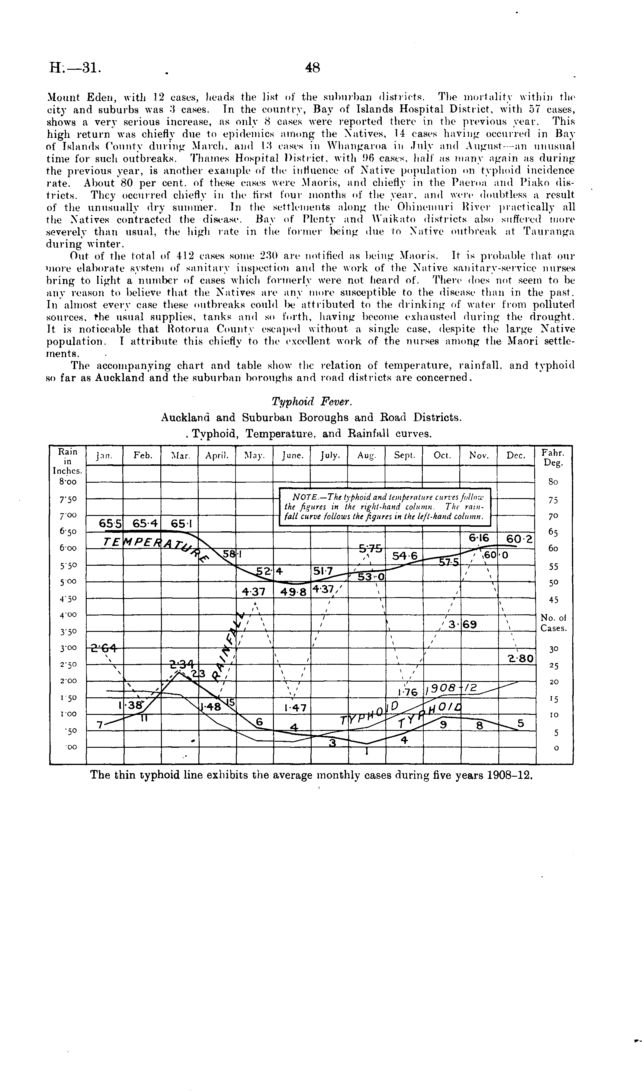 Mount Eden, with 12 cases, heads the list of the suburban districts. The mortality within the city and suburbs was .'i cases. In the country, Bay of Islands Hospital District, with 57 cases, shows a very serious increase, as only 8 cases were reported there in the previous year. This high return was chiefly due to epidemics among the Natives, I t cases having occurred in Bay of Islands County during March, and IS cases in Whangaroa in July and August—an unusual time for such outbreaks. Thames Hospital District, with 96 cases, half as many again as during the previous year, is another example of the influence of Native population on typhoid incidence rate. About 80 per cent, of these cases were Maoris, and chiefly in the Paeroa and Piako districts. They occurred chiefly in the first four months of the year, and were doubtless a result of the unusually dry summer. In the settlements along the Ohinemuri River practically all the Natives contracted the disease. Bay of Plenty and Waikato districts also suffered more severely than usual, the high rate in the former lx-ing due to Native outbreak at Taurang-a during winter. Out of the total of 112 cases some 230 are notified as being Maoris. It is probable lliat our more elaborate system of sanitary inspection and the work of the Native sanitary-service nurses bring to light a number of cases which formerly were not heard of. There does not seem to be any reason to believe that the Natives are any more susceptible to the disease than in the past. In almost every case these outbreaks could Ix , attributed to the drinking of water from polluted sources, rl k> usual supplies, tanks and so forth, having become exhausted during the drought. It is noticeable that Rotorua County escaped without a single case, despite the large Native population. I attribute this chiefly to the excellent work of the nurses among the Maori settlements. The accompanying chart and table show the relation of temperature, rainfall, and typhoid so far as Auckland and the suburban boroughs and road districts are concerned.