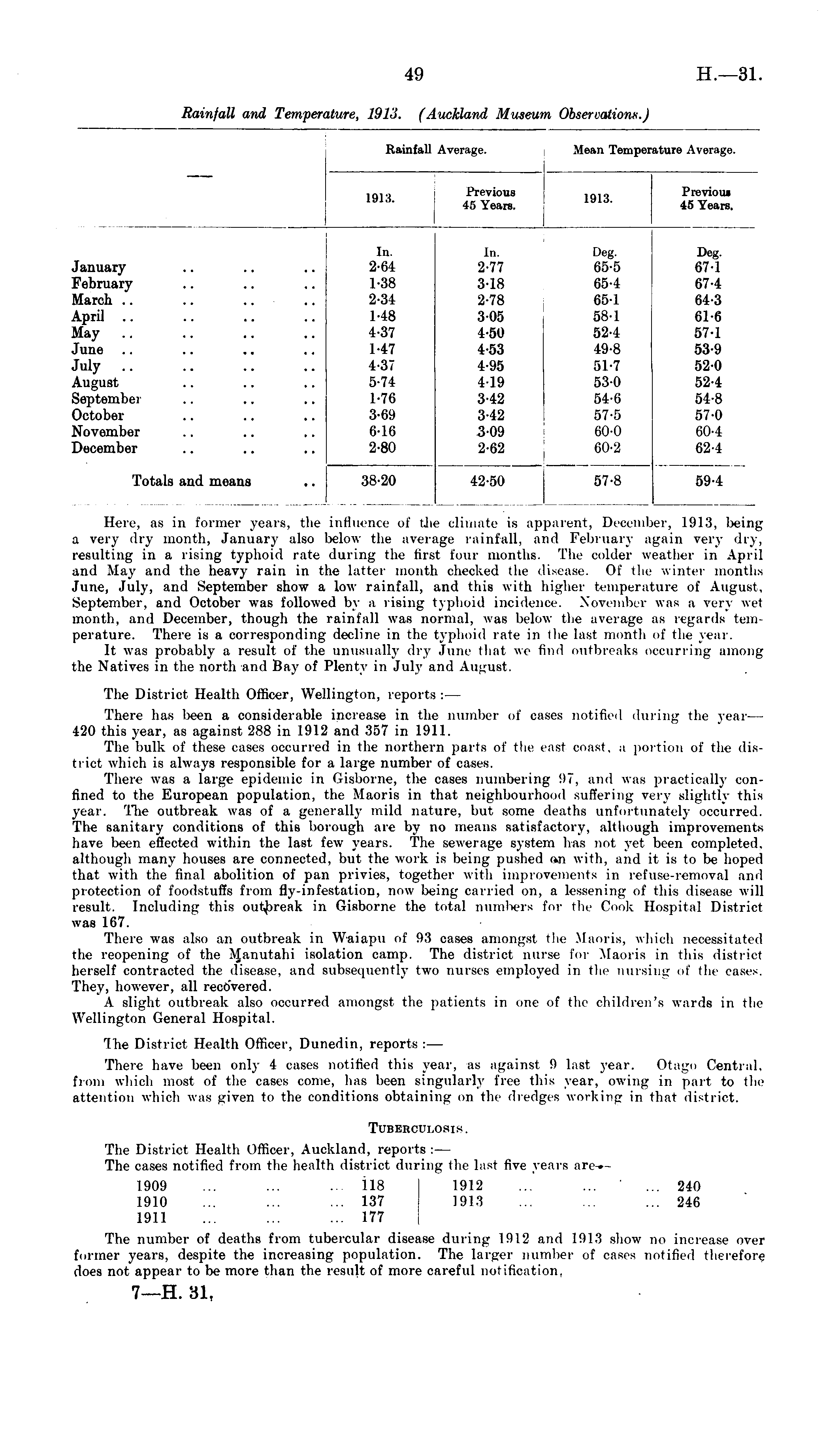 Here, as in former years, the influence of the climate is apparent, December, 1913, being a very dry month, January also below the average rainfall, and February again very dry, resulting in a rising typhoid rate during the first four months. The colder weather in April and May and the heavy rain in the latter month checked the disease. Of the winter months June, July, and September show a low rainfall, and this with higher temperature of August. September, and October was followed by a rising typhoid incidence. November was a very wet month, and December, though the rainfall was normal, was below the average as regards temperature. There is a corresponding decline in the typhoid rate in the last month of the year. It was probably a result of the unusually dry June that we find outbreaks occurring among the Natives in the north and Bay of Plenty in July and August. The District Health Officer, Wellington, reports : — There has been a considerable increase in the number of cases notified during the year— 420 this year, as against 288 in 1912 and 357 in 1911. The bulk of these cases occurred in the northern parts of the east coast, a portion of the district which is always responsible for a large number of cases. There was a large epidemic in Gisborne, the cases numbering !>7, and was practically confined to the European population, the Maoris in that neighbourhood suffering very slightly this year. The outbreak was of a generally mild nature, but some deaths unfortunately occurred. The sanitary conditions of this borough are by no means satisfactory, although improvements have been effected within the last few years. The sewerage system has not yet been completed, although many houses are connected, but the work is being pushed on with, and it is to be hoped that with the final abolition of pan privies, together with improvements in refuse-removal and protection of foodstuffs from fly-infestation, now being carried on, a lessening of this disease will result. Including this outbreak in Gisborne the total numbers for the Cook Hospital District was 167. There was also an outbreak in Waiapu of 93 cases amongst the Maoris, which necessitated the reopening of the Manutahi isolation camp. The district nurse for Maoris in this district herself contracted the disease, and subsequently two nurses employed in the nursing of the cases. They, however, all recovered. A slight outbreak also occurred amongst the patients in one of the children's wards in the Wellington General Hospital. The District Health Officer, Dunedin, reports : — There have been only 4 cases notified this year, as against !) last year. Otago Central, from which most of the cases come, has been singularly free this year, owing in part to the attention which was given to the conditions obtaining on the dredges working in that district. Tuberculosis. The District Health Officer, Auckland, reports : — The cases notified from the health district during the last five years are-.--1909 ... ... ... 118 1912 ... ... ... 240 1910 ... ... ... 137 1913 ... ... ... 246 1911 ... ... ... 177 The number of deaths from tubercular disease during 1912 and 1913 show no increase over former years, despite the increasing population. The larger number of cases notified therefore does not appear to be more than the result of more careful notification,