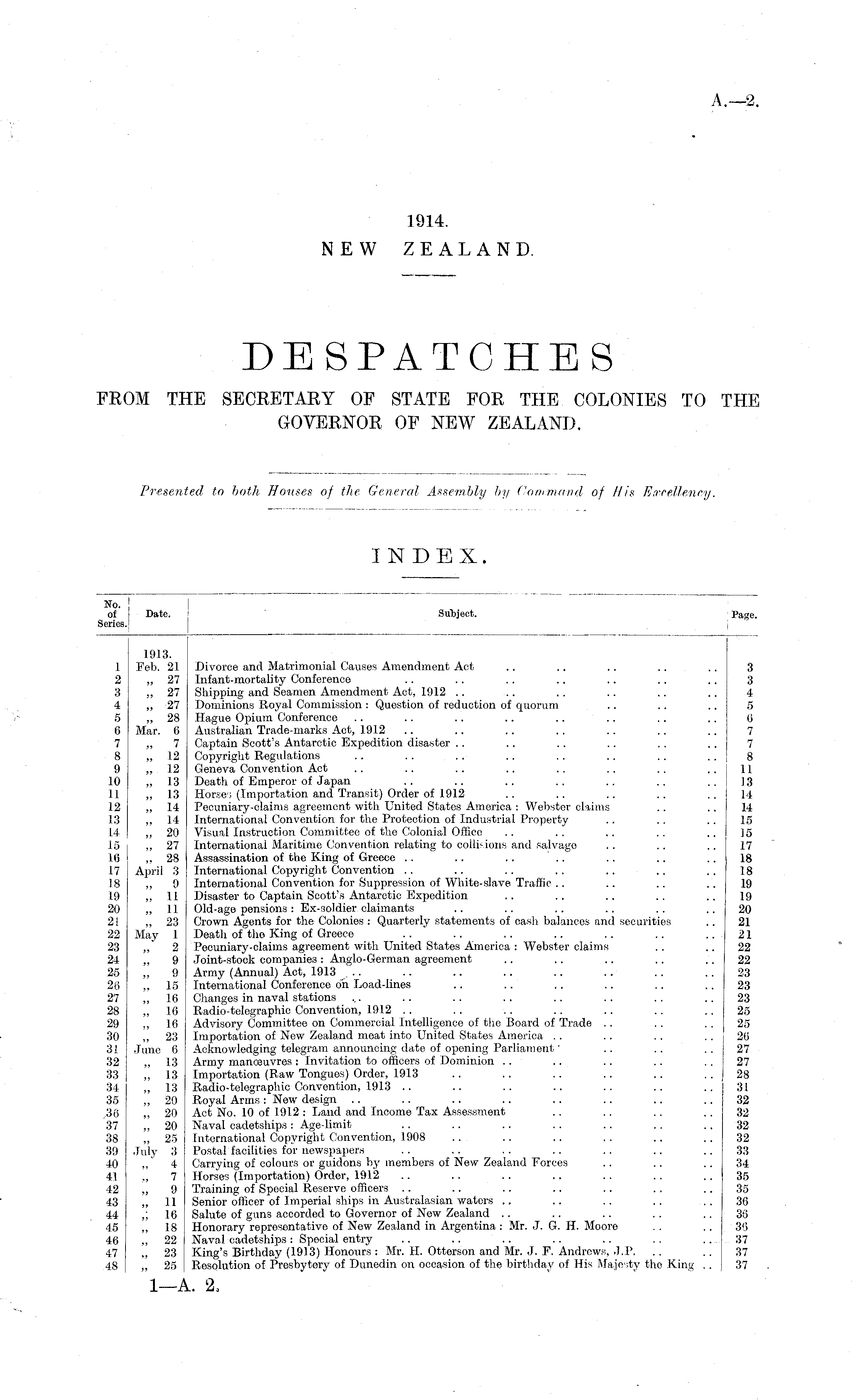 No. of Series. Subiect. Date. Subject. Page. suDject. 1 2 3 4 5 6 7 8 9 10 11 12 13 14 15 16 17 18 19 20 2! 22 23 24 25 26 27 28 29 30 31 32 33 34 35 .36 37 38 39 40 41 42 43 44 45 46 47 48 1913. Feb. 21 „ 27 „ 27 „ 27 „ 28 Mar. 6 7 „ 12 ,, 12 „ 13 „ 13 „ 14 „ 14 „ 20 „ 27 „ 28 April 3 „ 9 „ 11 „ 11 „ 23 May 1 2 9 9 „ 15 „ 16 „ 16 „ 16 „ 23 June 6 ., 13 „ 13 „ 13 „ 20 „ 20 „ 20 „ 25 July 3 4 7 9 „ 11 ,; 16 „ 18 „ 22 „ 23 „ 25 Divorce and Matrimonial Causes Amendment Act Infant-mortality Conference Shipping and Seamen Amendment Act, 1912 Dominions Royal Commission : Question of reduction of quorum Hague Opium Conference Australian Trade-marks Act, 1912 Captain Scott's Antarctic Expedition disaster Copyright Regulations Geneva Convention Act Death of Emperor of Japan Horses (Importation and Transit) Order of 1912 Pecuniary-claims agreement with United States America : Webster claims International Convention for the Protection of Industrial Property Visual Instruction Committee of the Colonial Office International Maritime Convention relating to collisions and salvage Assassination of the King of Greece .. .. .. International Copyright Convention International Convention for Suppression of White-slave Traffic Disaster to Captain Scott's Antarctic Expedition Old-age pensions : Ex-soldier claimants Crown Agents for the Colonies : Quarterly statements of cash balances and securities Death of the King of Greece Pecuniary-claims agreement with United States America : Webster claims Joint-stock companies : Anglo-German agreement Army (Annual) Act, 1913 ... International Conference on Load-lines Changes in naval stations Radio-telegraphic Convention, 1912 Advisory Committee on Commercial Intelligence of the Board of Trade Importation of New Zealand meat into United States America Acknowledging telegram announcing date of opening Parliament' Army manoeuvres : Invitation to officers of Dominion Importation (Raw Tongues) Order, 1913 Radio-telegraphic Convention, 1913 Royal Arms : New design Act No. 10 of 1912 : Land and Income Tax Assessment Naval cadetships : Age-limit International Copyright Convention, 1908 Postal facilities for newspapers Carrying of colours or guidons by members of New Zealand Forces Horses (Importation) Order, 1912 Training of Special Reserve officers Senior officer of Imperial ships in Australasian waters Salute of guns accorded to Governor of New Zealand Honorary representative of New Zealand in Argentina : Mr. J. G. H. Moore Naval cadetships : Special entry King's Birthday (1913) Honours: Mr. H. Otterson and Mr. J. F. Andrews, J.P. .. Resolution of Presbytery of Dunedin on occasion of the birthday of His Majesty the King .. 3 3 4 5 6 7 7 8 11 13 14 14 15 15 17 18 18 19 19 20 21 21 22 22 23 23 23 25 25 26 27 27 28 31 32 32 32 32 33 34 35 35 36 36 36 37 37 37