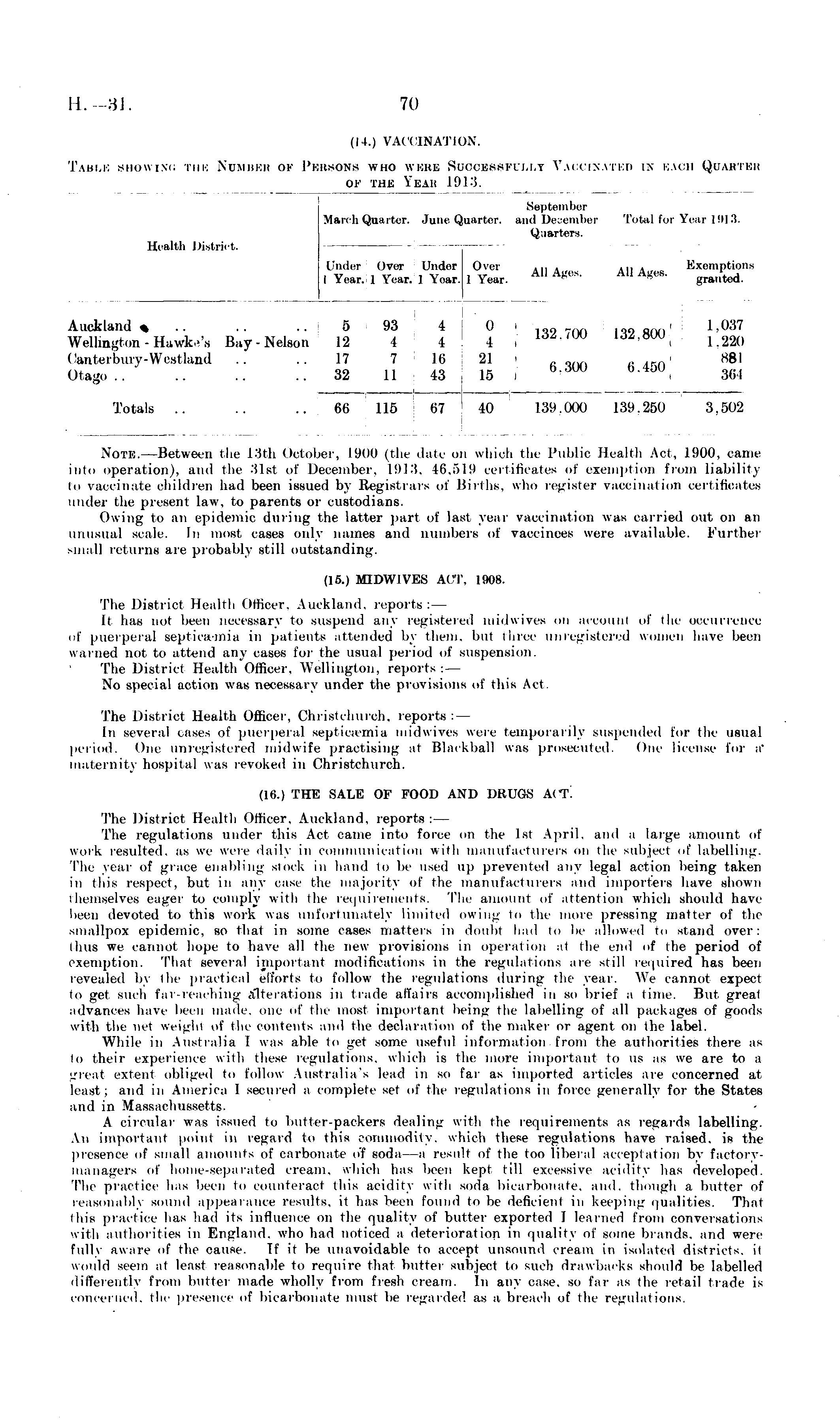Note. Between the l-'iih October, 1900 (the date on which the Public Health Act, 1900, came into operation), and the 'list of December, 1913, 16,519 certificates of exemption from liabilitylii vaccinate children had been issued by Registrars of Births, who register vaccinal ion certificates under the presenl law, to parents or custodians. Owing to an epidemic during the latter part of last year vaccination was carried out on an unusual scale. In most cases only names and numbers of vaccinees \w\-v available. Further small returns are probably still outstanding. (15.) MIDWIVES ACT. 1008. The District Health Ollicer. Auckland, reports: — It has not been necessary to suspend an\ registered midwives on account of the occurrence of puerperal septicaemia in patients attended by them, but three unregistered women have been warned not to attend any cases for the usual period of suspension. The District Health Ollicer. Wellington, reports: — No special action was necessary under the provisions of this Act. The District Health Officer, Christchurch, reports: — In several cases of puerperal septicaemia midwives wen- temporarily suspended for the usual period. One unregistered midwife practising at Blackball was prosecuted. One license for a' maternity hospital was revoked iii Christchurch. (16.) THE SALE OF FOOD AND DRUGS .Ml The District Health Ollicer. Auckland, reports: — The regulations under this Act came into force on the Ist April, and a large amount of work resulted, as we were daily in communication with manufacturers on ihe subject "i labelling. The year of grace enabling stock in hand to lie used up prevented any legal action being taken in this respect, hut in any case the majority of the manufacturers and importers have shown themselves eager to comply with ihe requirements. The amount of attention which should have been devoted to this work was unfortunately limited owing to tin- more pressing matter of the smallpox epidemic, so that in some cases matters in douhl had lo he allowed to stand over: thus we cannot hope to have all the new provisions iii operation at Ihe end of the period of exemption. That several important modifications in the regulations are still required has been revealed by the practical efforts to follow the regulations during the year. We cannot expect to get such far-reaching alterations in trade affairs accomplished in so brief a time. But great advances have In in made, one of lln most important being the labelling of all packages of goods with the net weight of the contents and the declaration of the maker or agent on the label. While in Australia I was able in get some useful information from the authorities there as lo their experience with these regulations, which is ihe more important to us as we are to a great extent obliged to follow Australia'- lead in so far as imported articles are concerned at least; and in America I secured a complete set of the regulations in force generally for the States and in Massachusetts. A circular was issued to butter-packers dealing with the requirements as regards labelling. An important point in regard to this commodity, which these regulations have raised, is the presence of s 11 amounts of carbonate of soda a result of the too liberal acceptation by factorymanagers of home-separated cream, which has been kept till excessive acidity has developed. The practice has been to counteract this acidity with soda bicarbonate, and. though a butter of reasonably sound appearance results, it has been found in he deficient in keeping qualities. That i his practice has had its influence on Ihe quality of butter exported I learned from conversations with authorities in England, who had noticed a deterioration in quality of some brands, and were frill\ aware of the cause. Tf it be unavoidable to accept unsound cream in isolated districts, ii would seem at least reasonable to require that butter subject to such drawbacks should be labelled differently from butter made wholly from fresh cream. In any ease, so far as the retail hade is concerned, the presence of bicarbonate insist lie regarded as a breach of ihe regtilat ions.