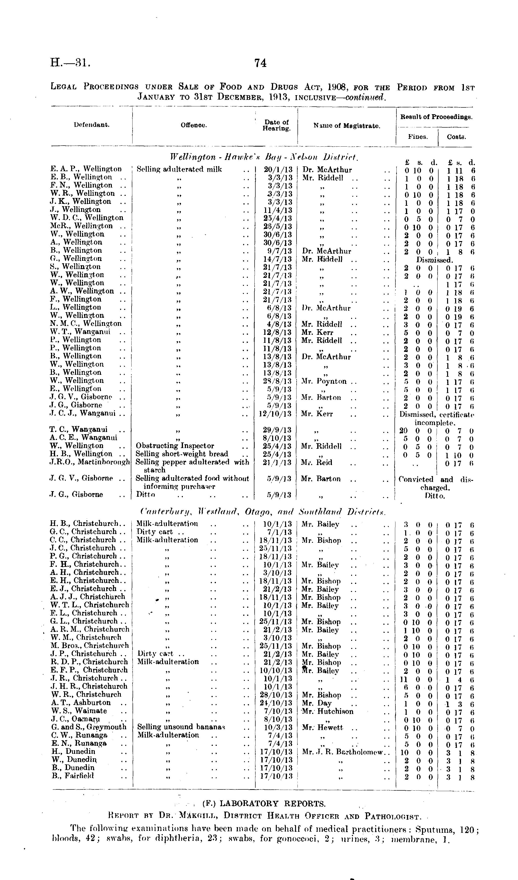 Defendant, Oflenoe. Hiring. N uiio of Magietrato. Kesult of Proceedings. Fines. Cost.-. j<:. A. I'., Wellington E. B., Wellington .. F. N., Wellington .. W.R., Wellington .. J. K., Wellington .. «J., Wellington W. D. (',., Wellington Melt.. Wellington .. \\\. Wellington A., Wellington B., Wellington G., Wellington 8., Wellington W., Wellington W., Wellington A. W., Wellington .. F., Wellington L., Wellington W., Wellington X. M.C., WeUington W. 'I'.. Wanganui I'., Wellington I , .. Wellington H.. Wellington W., Wellington IS., Wellington W., Wellington K., Wellingfbn J. (1. V., Qisbor.ne .. J. ('•.. Qisborne J. ('. J., Wanganui .. Wellington - Hawke'n /In// - Nelson District, Selling adulterated milk .. 20/1/13 Dr. MoArthur 3/3/13 Mr. Riddel] .. 3,:! 13 ..3/3/13 3/3/13 11/4/13 25/4/13 26/5/13 30/6/13 30/6/13 9/7/13 Dr. MoArthur 14/7/13 Mr. Riddcll .. .. 21/7/13 ,. .. 21/7/13 21/7/13 21/7/13 21/7/13 6/8/13 Dr. MoArthur 6/8/13 1/8/13 Mr. Riddel] .. 12/8/13 Mr. Kerr 11/8/13 Mr. Riddcll .. 11/8/13 13/8/13 Dr. Mi Arthur 13/8/13 13/8/13 23/8/13 Mr. Poynton . . 8 9/13 6/9/13 Mr. Barton .. 6 9/13 .. 12/10/13 Mr. Kerr £ s. d. (I 10 0 1 0 0 1 0 0 0 10 0 1 0 0 1 0 0 0 5 0 0 10 0 2 0 0 2 0 0 2 0 0 Dismii 2 (i 0 2 0 (i 1 6 o 2 0 0 2 0 0 2 0 0 3 0 0 5 0 0 2 0 0 2 0 (i 2 (I 0 3 0 0 2 0 0 r, 0 i) 5 0 0 2 0 0 2 0 0 Dismissed, incom] 20 0 0 8 0 (i 0 6 i) (t 5 0 £ s. <l. 1 11 6 1 18 6 1 18 ti 1 18 6 1 18 6 1 17 0 0 7 0 0 17 6 0 17 6 0 17 6 1 8 (i seed. 0 17 6 0 17 6 1 17 6 1 18 6 I 18 6 (i i9 a 0 19 6 (117 II 0 7 (I 0 17 6 0 17 (i 1 8 (i 1 8 .6 1 8 l> 1 17 8 1 17 l> 0 17 li 0 17 (i certificate ilete. 0 7 (» 0 7 0 0 7 0 1 i0 0 0 17 6 T. C, Wanganui A. C. E., Wanganui W., Wellington H. B., Wellington .. J.R.O., Martiriborough 29 9/13 8/10/13 Obstructing Inspector .. 25/4/13 Mr. Riddel! .. Selling short-weight bread .. 26/4/13 ,, Selling pepper adulterated with 21/1/13 Mr. Reid st arch Selling adulterated food without 6/9/13 Mr. Barton .. informing purchaser Ditto .. .. .. 6/9 I :s .. J. O. V., GBsbonre .. Convicted charf Ditt and disced. J. G., Gisborne 0. H. B., Christchurch.. G. C, Christchurcli .. C. C, Christchurch .. J. C.i Christchurch .. P. G., Christchurch .. F. H., Christehurch.. A. H., Christchurch.. E. H., Christchureh. . H..)., Christ church . . A. .1. J., Christchurch W.T, l>.. Christ church E. l>., Christchurch .. (J. L., Christchurch .. A. I!. M.. Chi-istclmrch W. M.. Christchurch M. Bros., ( hrist church J. I , ., Christchurch . . R, I). P., Christohuroh E.F. P., Christ chmvh • I. R., Christchurch . . J. H. R., Christchureh W. E., Cliristchurch A. T., Ashburton . . W. 8., Waimate .1. c, Oamaru G. ami S.. IJ i-cvniouth C. W., Runaaga E. N., Runanga H.. Dunedin W., Dunedin B., Dunedin B., Fairfield Canterbury, fVestland, Ota go, and Southland Districts. 0 17 li 0 17 li 0 17 6 0 17 l> 0 17 6 0 17 6 0 17 l> 0 17 l> 0 17 6 0 17 6 0 17 6 0 17 6 0 17 6 (I 17 li 0 17 l> O 17 6 0 17 l> 0 17 li I) 17 l> 14 6 0 17 6 0 17 6 1 3 6 0 17 6 0 17 6 0 7 0 0 17 6 0 17 6 :i i 8 8 1 8 3 18 3 1 8 Milk-adulteration .. .. 10/1/13 I Mr. Bailey .. Dirty cart .. .. .. 7/1/13 j Milk-adulteration .. .. 18/11/13 Mr. Bishop .. .. 25/11/13 .. 18/11/13 10/1/13 Mr. Bailey .. 3/10/13 .. 18/11/13 Mr. Bishop .. 21/2/13 Mr. Bailey .. ... .. .. 18/11/13 Mr. Bishop .. 10/1/13 Mr. Bailey .. •' - .. .. 10/1/13 .. 25/11/13 Mr. Bishop .. 21/2/13 Mr. Bailey .. ..3/10/13 ..25/11 13 Mr. Bishop . . Dirty cart .. .. .. 21/2 13 Mr. Bailey .. Milk-adulteration .. .. 21/2/13 Mr. Bishop .. .. 10/10/13 Tlr. Bailey .. :. 10/1/13 10/1 13 . . 28/10/13 Mr. Bishop . . .. 24/10/13 Mr. Day 7/10/13 Mr. Hutchison 8/10/13 Selling unsound bananas .. 10/3/13 Mr. Qewett .. Milk-adulteration .. .. 7/4, I. , ! ..7/4 13 .. 17/10/13 Mr. J. R. Bartholomew.. ..17/10/13 ..17 10 13 .. 17/10 13 :s 0 0 1 0 0 2 0 0 5 0 (I 2 0 0 3 0 0 2 0 0 2 0 0 3 0 0 2 0 0 :s o o 3 o (i 0 10 0 1 10 (t 2 0 0 0 Hi 0 0 10 0 0 10 0 2 0 0 110 0 <i 0 0 r> o 0 1 0 0 1 0 0 (I II) II 0 10 0 S 0 0 5 0 I) 10 0 0 2 0 0 2 0 0 2 0 0