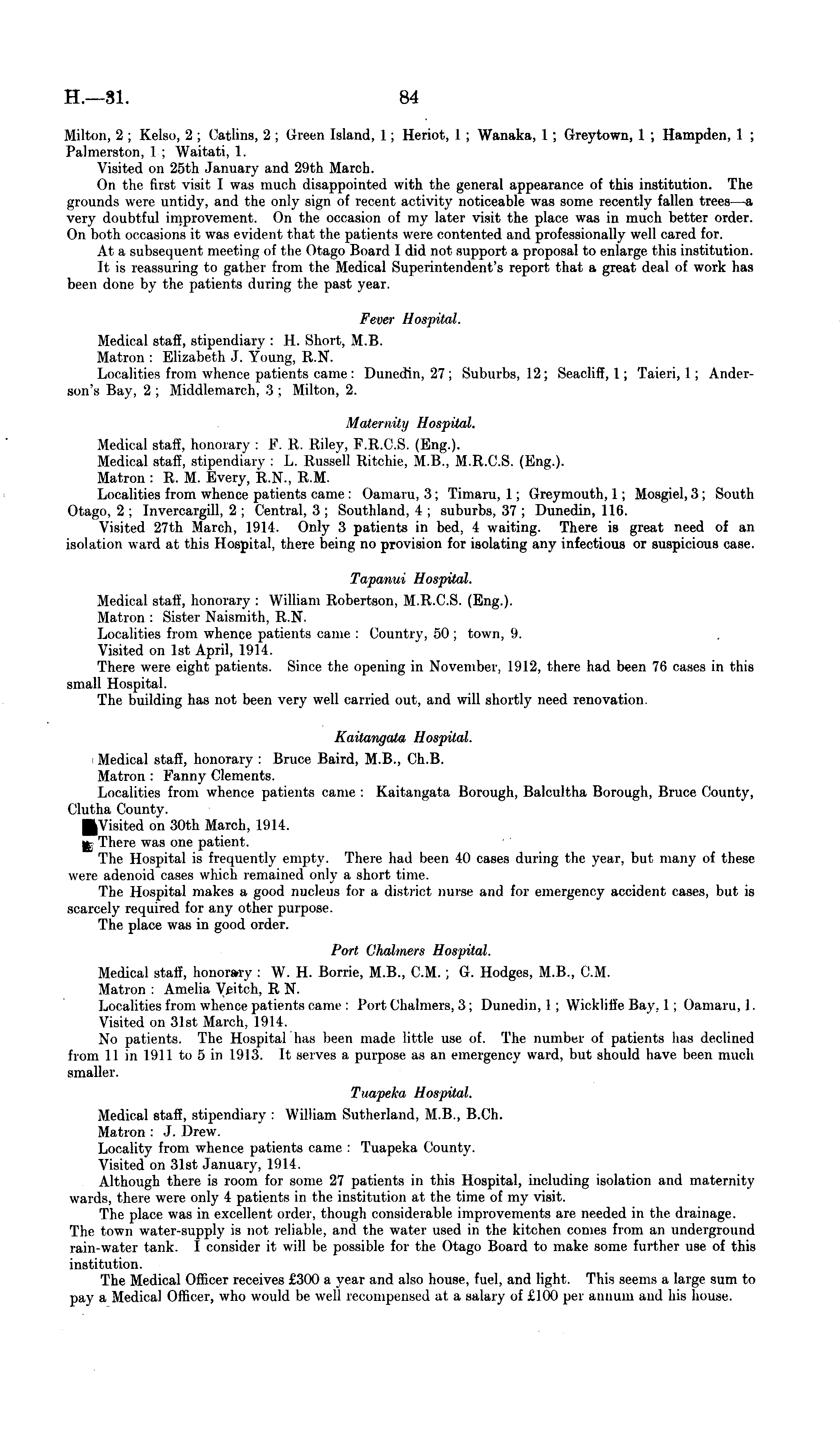 Milton, 2 ; Kelso, 2 ; Catlins, 2 ; Green Island, L; Heriot, 1 ; Wanaka, I; Greytown, 1 ; Hampden, 1 ; Palmerston, 1 ; Waitati, 1. Visited on 25th January and 29th March. On the first visit I was much disappointed with the general appearance of this institution. The grounds were untidy, and the only sign of recent activity noticeable was some recently fallen trees —a very doubtful improvement. On the occasion of my later visit the place was in much better order. On both occasions it was evident that the patients were contented and professionally well cared for. At a subsequent meeting of the Otago Board I did not support a proposal to enlarge this institution. It is reassuring to gather from the Medical Superintendent's report that a great deal of work has been done by the patients during the past year. Fever Hospital. Medical staff, stipendiary : H. Short, M.B. Matron : Elizabeth J. Young, R.N. Localities from whence patients came: Dunedin, 27 ; Suburbs, 12; Seacliff, 1; Taieri, 1; Anderson's Bay, 2 ; Middlemarch, 3 ; Milton, 2. Maternity Hospital. Medical staff, honorary : F. R. Riley, F.R.C.S. (Eng.). Medical staff, stipendiary : L. Russell Ritchie, M.8., M.R.C.S. (Eng.). Matron : R. M. Every, R.N., R.M. Localities from whence patients came : Oamaru, 3; Timaru, 1; Greymouth, 1; Mosgiel, 3 ; South Otago, 2 ; Invercargill, 2 ; Central, 3 ; Southland, 4 ; suburbs, 37 ; Dunedin, 116. Visited 27th March, 1914. Only 3 patients in bed. 4 waiting. There is great need of an isolation ward at this Hospital, there being no provision for isolating any infectious or suspicious case. Tapanui Hospital. Medical staff, honorary : William Robertson, M.R.C.S. (Eng.). Matron : Sister Naismith, R.N. Localities from whence patients came : Country, 50; town, 9. Visited on Ist April, 1914. There were eight patients. Since the opening in November, 1912, there had been 76 cases in this small Hospital. The building has not been very well carried out, and will shortly need renovation. Kaitangata Hospital. i Medical staff, honorary : Bruce Baird, M.8., Ch.B. Matron : Fanny Clements. Localities from whence patients came : Kaitangata Borough, Balcultha Borough, Bruce County, Clutha County. on 30th March, 1914. There was one patient. The Hospital is frequently empty. There had been 40 cases during the year, but many of these were adenoid cases which remained only a short time. The Hospital makes a good nucleus for a district nurse and for emergency accident cases, but is scarcely required for any other purpose. The place was in good order. Port Chalmers Hospital. Medical staff, honorary : W. H. Borrie, M.8., CM. ; G. Hodges, M.8., CM. Matron ; Amelia Veitch, R N. Localities from whence patients came : Port Chalmers, 3 ; Dunedin, 1; Wickliffe Bay. 1; Oamaru, 1. Visited on 31st March. 191 I. No patients. The Hospital has been made little use of. The number of patients has declined from 11 in 1911 to sin 1913. It serves a purpose as an emergency ward, but should have been much smaller. Tuapeka Hospital. Medical staff, stipendiary : William Sutherland, M.8., B.Ch. Matron : •). Drew. Locality from whence patients came : Tuapeka County. Visited on 31st January, 1914. Although there is room for some 27 patients in this Hospital, including isolation and maternity wards, there were only 4 patients in the institution at the time of my visit. The place was in excellent order, though considerable improvements are needed in the drainage. The town water-supply is not reliable, and the water used in the kitchen comes from an underground rain-water tank. I consider it will be possible for the Otago Board to make some further use of this institution. The Medical Officer receives £300 a year and also house, fuel, and light. This seems a large sum to pay a Medical Officer, who would be well recompensed at a salary of £1(X) per annum and his house.