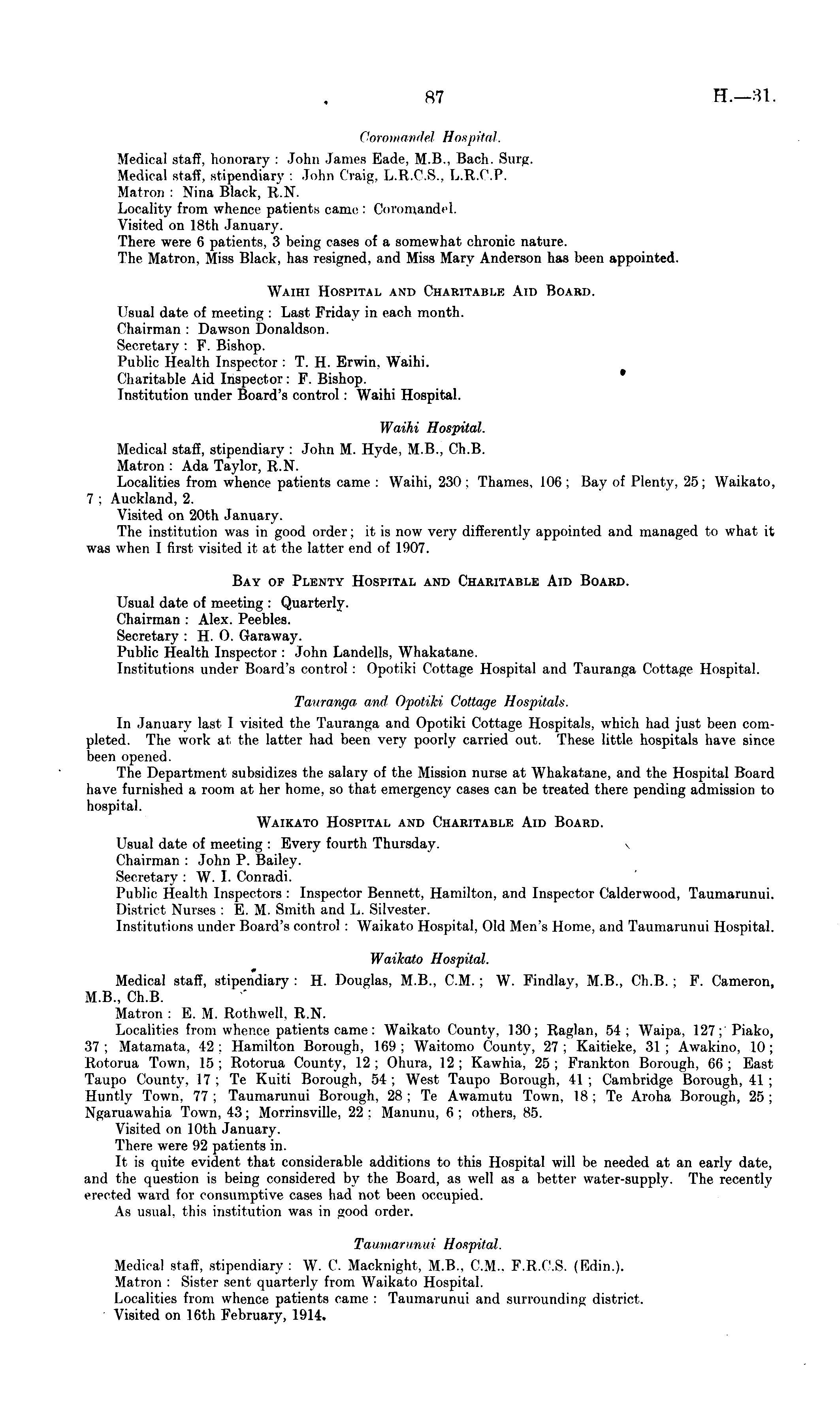 Coromandel Hospital. Medical staff, honorary : John James Eade, M.8., Bach. Surg. Medical staff, stipendiary : John Craig. L.R.C.S.. L.R.C.P. Matron : Nina Black, R.N. Locality from whence patients came : Coromandel. Visited on 18th January. There were 6 patients, 3 being cases of a somewhat chronic nature. The Matron, Miss Black, has resigned, and Miss Mary Anderson has been appointed. Waihi Hospital and Charitable Aid Board. Usual date of meeting : Last Friday in each month. Chairman : Dawson Donaldson. Secretary : F. Bishop. Public Health Inspector : T. H. Erwin, Waihi. Charitable Aid Inspector : F. Bishop. Institution under Board's control : Waihi Hospital. Waihi Hospital. Medical staff, stipendiary : John M. Hyde, M.8., Ch.B. Matron : Ada Taylor, R.N. Localities from whence patients came : Waihi, 230 ; Thames, 106 ; Bay of Plenty, 25; Waikato, 7 : Auckland, 2. Visited on 20th January. The institution was in good order; it is now very differently appointed and managed to what it was when I first visited it at the latter end of 1907. Bay of Plenty Hospital and Charitable Aid Board. Usual date of meeting : Quarterly. Chairman : Alex. Peebles. Secretary : H. 0. Garaway. Public Health Inspector : John Landells, Whakatane. Institutions under Board's control : Opotiki Cottage Hospital and Tauranga Cottage Hospital. Tauranga. and Opotiki Cottage Hospitals. In January last I visited the Tauranga and Opotiki Cottage Hospitals, which had just been completed. The work at the latter had been very poorly carried out. These little hospitals have since been opened. The Department subsidizes the salary of the Mission nurse at Whakatane, and the Hospital Board have furnished a room at her home, so that emergency cases can be treated there pending admission to hospital. Waikato Hospital and Charitable Aid Board. Usual date of meeting : Every fourth Thursday. v Chairman : John P. Bailey. Secretary : W. I. Conradi. Public Health Inspectors : Inspector Bennett, Hamilton, and Inspector Calderwood, Taumarunui. District Nurses : E. M. Smith and L. Silvester. Institutions under Board's control : Waikato Hospital, Old Men's Home, and Taumarunui Hospital. Waikato Hospital. Medical staff, stipendiary : H. Douglas, M.8., CM. ; W. Findlay, M.8., Ch.B. ; F. Cameron, M.8., Ch.B. Matron : E. M. Rothwell, R.N. Localities from whence patients came : Waikato County. 130; Raglan, 54; Waipa, 127; Piako, 37 ; Matamata, 42 ; Hamilton Borough, 169 ; Waitomo County, 27 ; Kaitieke, 31 ; Awakino, 10; Rotorua Town, 15; Rotorua County, 12; Ohura, 12; Kawhia, 25; Frankton Borough, 66; East Taupo County. 17; Te Kuiti Borough, 54; West Taupo Borough, 41; Cambridge Borough, 41 ; Huntly Town, 77 ; Taumarunui Borough, 28 ; Te Awamutu Town, 18 ; Te Aroha Borough, 25 ; Ngaruawahia Town, 43; Morrinsville, 22 ; Manunu, 6 ; others, 85. Visited on 10th January. There were 92 patients in. It is quite evident that considerable additions to this Hospital will be needed at an early date, and the question is being considered by the Board, as well as a better water-supply. The recently erected ward for consumptive cases had not been occupied. As usual, this institution was in good order. Taumarunui Hospital. Medical staff, stipendiary: W. C. Macknight, M.8., CM.. F.R.C.S. (Edin.). Matron : Sister sent quarterly from Waikato Hospital. Localities from whence patients came : Taumarunui and surrounding district. Visited on 16th February, 1914.