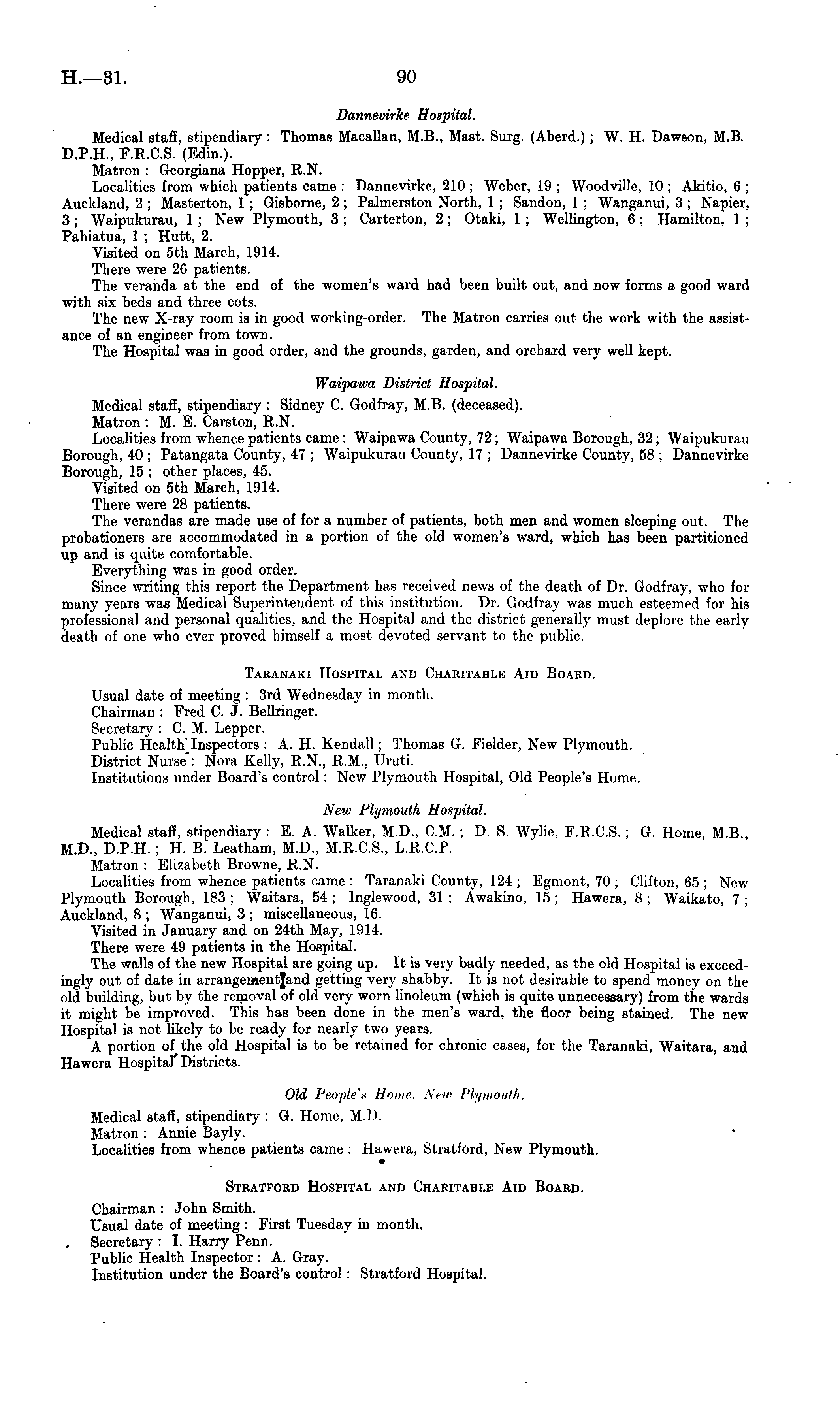 Dannevirke Hospital. Medical staff, stipendiary : Thomas Macallan, M.8., Mast. Surg. (Aberd.) ; W. H. Dawson, M.B. D.P.H., F.R.C.S. (Edin.). Matron : Georgiana Hopper, R.N. Localities from which patients came : Dannevirke, 210 ; Weber, 19 ; Woodville, 10 ; Akitio, 6 ; Auckland, 2 ; Masterton, 1 ; Gisborne, 2 ; Palmerston North, 1 ; Sandon, 1 ; Wanganui, 3 ; Napier, 3; Waipukurau, 1 ; New Plymouth, 3 ; Carterton, 2 ; Otaki, 1 ; Wellington, 6 ; Hamilton, 1 : Pahiatua, 1 ; Hutt, 2. Visited on sth March, 1914. There were 26 patients. The veranda at the end of the women's ward had been built out, and now forms a good ward with six beds and three cots. The new X-ray room is in good working-order. The Matron carries out the work with the assistance of an engineer from town. The Hospital was in good order, and the grounds, garden, and orchard very well kept. Waipawa District Hospital. Medical staff, stipendiary : Sidney C. Godfray, M.B. (deceased). Matron : M. E. Carston, R.N. Localities from whence patients came : Waipawa County, 72 ; Waipawa Borough, 32 ; Waipukurau Borough, 40; Patangata County, 47 ; Waipukurau County, 17 ; Dannevirke County, 58 ; Dannevirke Borough, 15 ; other places, 45. Visited on sth March, 1914. There were 28 patients. The verandas are made use of for a number of patients, both men and women sleeping out. The probationers are accommodated in a portion of the old women's ward, which has been partitioned up and is quite comfortable. Everything was in good order. Since writing this report the Department has received news of the death of Dr. Godfray, who for many years was Medical Superintendent of this institution. Dr. Godfray was much esteemed for his professional and personal qualities, and the Hospital and the district generally must deplore the early death of one who ever proved himself a most devoted servant to the public. Taranaki Hospital and Charitable Aid Board. Usual date of meeting : 3rd Wednesday in month. Chairman : Fred C J. Bellringer. Secretary : C. M. Lepper. Public Health'lnspectors :A. H. Kendall; Thomas G. Fielder, New Plymouth. District Nurse': Nora Kelly, R.N., R.M., Uruti. Institutions under Board's control : New Plymouth Hospital, Old People's Home. New Plymouth Hospital. Medical staff, stipendiary :E. A. Walker, M.D., CM.; D. S. Wylie, F.R.C.S. ; G. Home. M.8., M.D., D.P.H.; H. B. Leatham, M.D., M.R.C.S., L.R.C.P. Matron : Elizabeth Browne, R.N. Localities from whence patients came : Taranaki County, 124 ; Egmont, 70 ; Clifton, 65 ; New Plymouth Borough, 183 ; Waitara, 54 ; Inglewood, 31 ; Awakino, 15 ; Hawera, 8 ; Waikato, 7 ; Auckland, 8 ; Wanganui, 3 ; miscellaneous, 16. Visited in January and on 24th May, 1914. There were 49 patients in the Hospital. The walls of the new Hospital are going up. It is very badly needed, as the old Hospital is exceedingly out of date in arrangementjand getting very shabby. It is not desirable to spend money on the old building, but by the removal of old very worn linoleum (which is quite unnecessary) from the wards it might be improved. This has been done in the men's ward, the floor being stained. The new Hospital is not likely to be ready for nearly two years. A portion of the old Hospital is to be retained for chronic cases, for the Taranaki, Waitara, and Hawera Hospitaf Districts. Old People's Home. New Plymouth. Medical staff, stipendiary : G. Home, M.D. Matron : Annie Bayly. Localities from whence patients came : Hawera, Stratford, New Plymouth. Stratford Hospital and Charitable Aid Board. Chairman : John Smith. Usual date of meeting : First Tuesday in month. Secretary : I. Harry Perm. Public Health Inspector : A. Gray. Institution under the Board's control : Stratford Hospital.