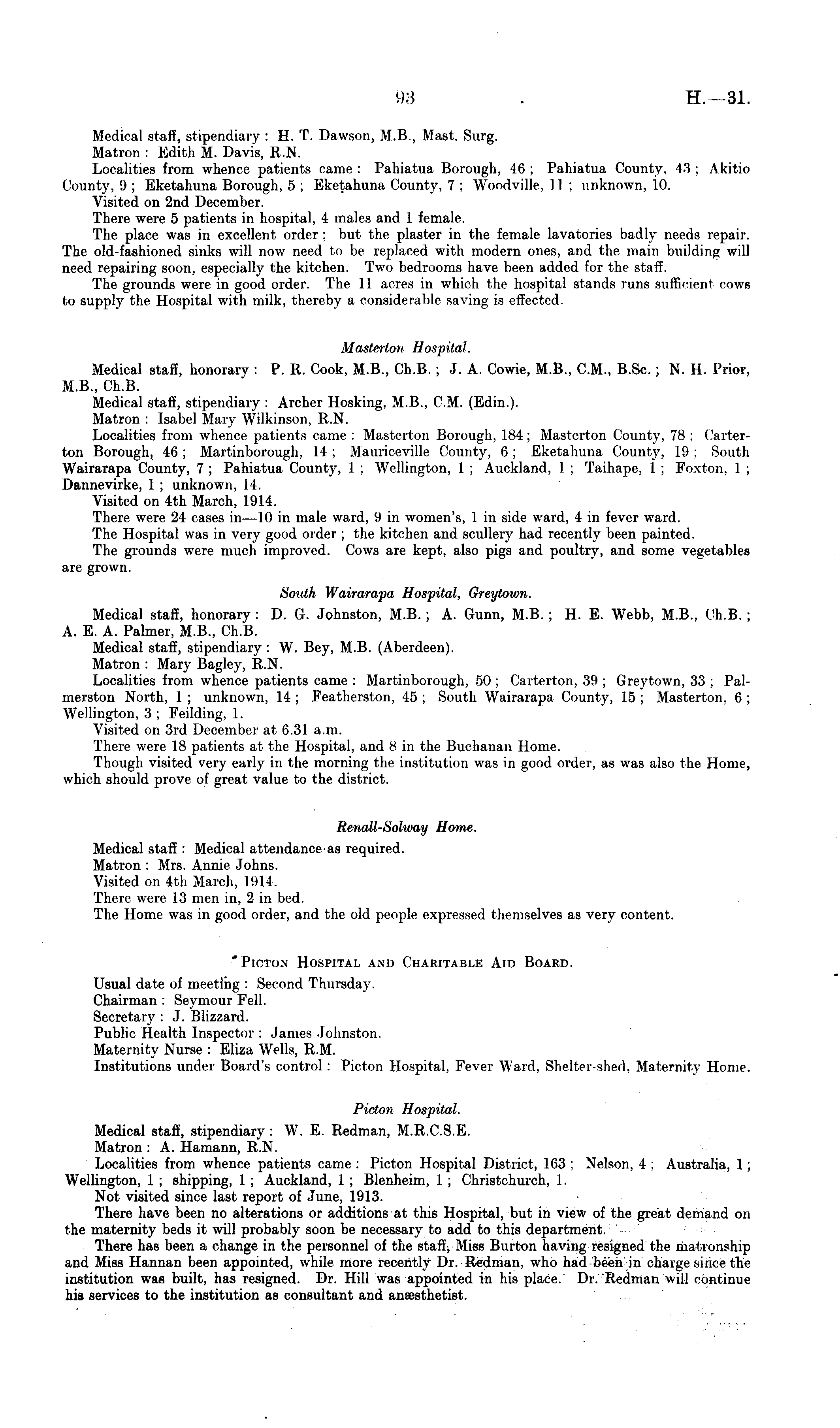Medical staff, stipendiary : H. T. Dawson, M.8.. Mast. Surg. Matron : Edith M. Davis, R.N. Localities from whence patients came: Pahiatua Borough, 46; Pahiatua County, t'i : Akitio County, 9 ; Eketahuna Borough, 5 ; Eketahuna County, 7 : VVoodville, 11 : unknown, 10. Visited on 2nd December. There were 5 patients in hospital, 4 males and 1 female. The place was in excellent order ; but the plaster in the female lavatories badly needs repair. The old-fashioned sinks will now need to be replaced with modern ones, and the main building will need repairing soon, especially the kitchen. Two bedrooms have been added for the staff. The grounds were in good order. The 11 acres in which the hospital stands runs sufficient cows to supply the Hospital with milk, thereby a considerable saving is effected. Masterton Hospital. Medical staff, honorary : P. R. Cook, M.8., Ch.B. ; J. A. Cowie, M.8., CM., B.Sc. ; N. H. Prior, M.8., Ch.B. Medical staff, stipendiary : Archer Hosking, M.8., CM. (Edin.). Matron : Isabel Mary Wilkinson, R.N. Localities from whence patients came : Masterton Borough, 184; Masterton County, 78 : Carterton Borough, 46 ; Martinborough, 14; Mauriceville County, 6; Eketahuna County, 19 ; South Wairarapa County, 7 ; Pahiatua County, 1 ; Wellington, 1 ; Auckland, 1 ; Taihape, 1 ; Foxton, I ; Dannevirke, 1 ; unknown, i 1 Visited on 4th March, 1914. There were 24 cases in—lo in male ward, 9 in women's, 1 in side ward, 4 in fever ward. The Hospital was in very good order ; the kitchen and scullery had recently been painted. The grounds were much improved. Cows are kept, also pigs and poultry, and some vegetables are grown. South Wairarapa Hospital, Greytown. Medical staff, honorary: D. G. Johnston, M.8.; A. Gunn, M.B. :H. E. Webb, M.8., Ch.B.; A. E. A. Palmer, M.B, Ch.B. Medical staff, stipendiary : W. Bey, M.B. (Aberdeen). Matron : Mary Bagley, R.N. Localities from whence patients came : Martinborough, 50 ; Carterton, 39 ; Greytown, 33 ; Palmerston North, 1 ; unknown, 14 ; Featherston, 45 ; South Wairarapa County, 15 ; Masterton, 6 ; Wellington, 3 ; Feilding, 1. Visited on 3rd December at 6.31 a.m. There were 18 patients at the Hospital, and 8 in the Buchanan Home. Though visited very early in the morning the institution was in good order, as was also the Dome, which should prove of great value to the district. Renall-Solway Home. Medical staff : Medical attendance as required. Matron : Mrs. Annie Johns. Visited on 4th March, 191 1. There were 13 men in, 2 in bed. The Home was in good order, and the old people expressed themselves as very content. "Picton Hospital and Charitable Aid Board. Usual date of meeting : Second Thursday. Chairman : Seymour Fell. Secretary : J. Blizzard. Public Health Inspector : James Johnston. Maternity Nurse : Eliza Wells, R.M. Institutions under Board's control : Picton Hospital. Fever Ward. Shelter-shed. Maternity Home. Picton Hospital. Medical staff, stipendiary : W. E. Redman, M.R.C.S.E. Matron : A. Hamann, R.N. Localities from whence patients came : Picton Hospital District, 163 : Nelson, 4 : Australia, 1 ; Wellington, 1 ; shipping, 1 ; Auckland, 1 ; Blenheim, 1 ; Christchurch, 1. Not visited since last report of June, 1913. There have been no alterations or additions at this Hospital, but in view of the great demand on the maternity beds it will probably soon be necessary to add to this department. There has been a change in the personnel of the staff;, Miss Burton having resigned the niationship and Miss Hannan been appointed, while more recently Dr. Redman, who had beieh in charge since the institution was built, has resigned. Dr. Hill was appointed in his place. Dr. Redman will continue his services to the institution as consultant and anaesthetist.