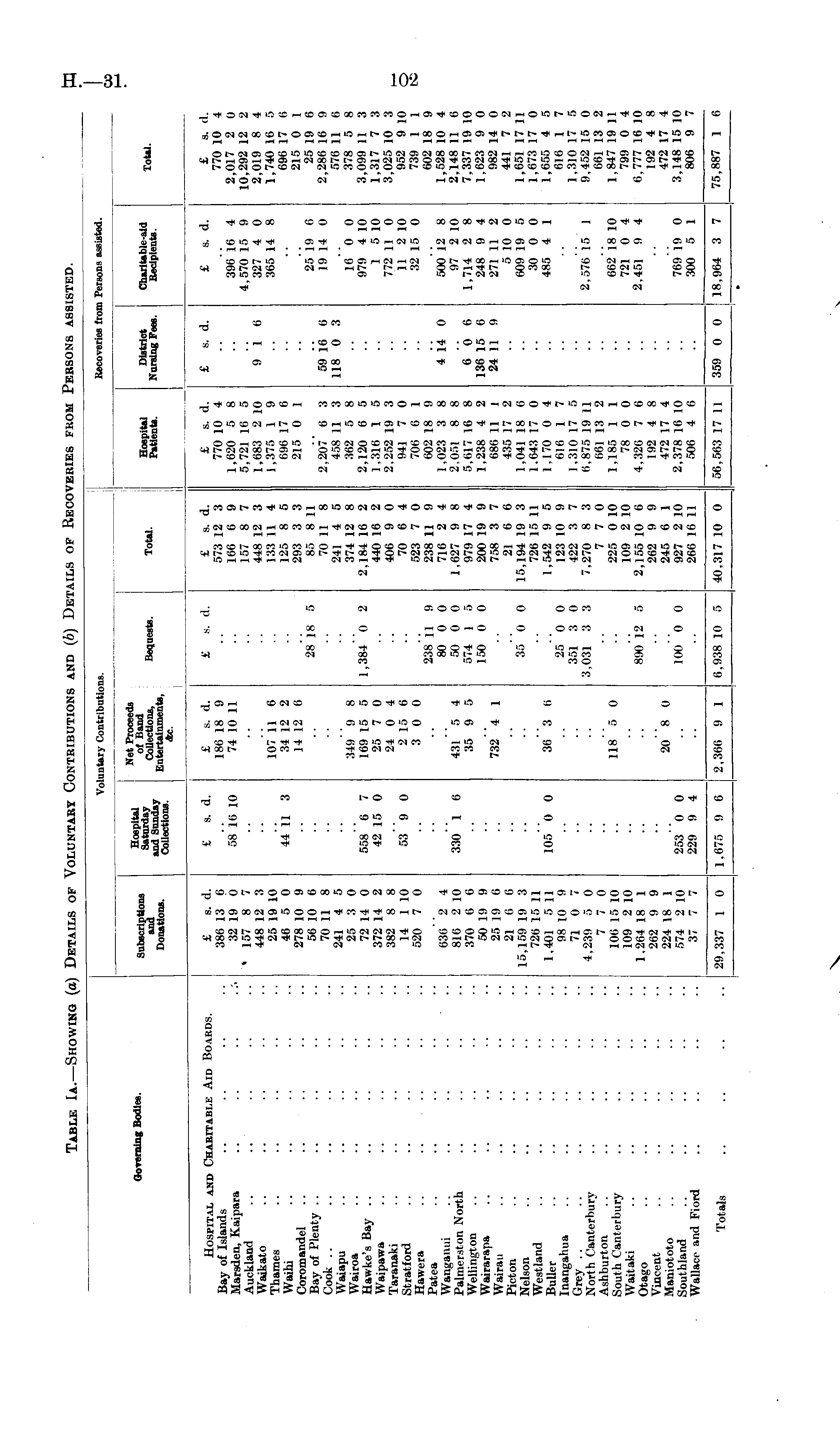 Vol intary Contributions. Recoveries froi Persons assisted. Ooreming Bodies. Subscriptions and Donations. Hospital Saturday and Sunday Collections. Net Proceeds of Baud Collections, Entertainments, Ac. Bequests. Total. Hospital Patients. District Nursing Fees. Charitable-aid Recipients. Total. Hospital and Charitable Aid Boards. Bay of Islands Marsden, Kaipara Auckland Waikato Thames Waihi Coromandel Bay of Plenty Cook Waiapu VVairoa Hawke's Bay .. Waipawa Taranaki Stratford Hawera .. .. Patea Wanganui Palmrrston North Wellington Wairarapa Wairau Picton Nelson Westland Buller Inangaluia Grey North Canterbury Ashburton South Canterbury Waitaki Otago Vincent Maniototo Southland Wallace and Fiord E e. (1. 386 13 0 32 19 0 1 157 8 7 448 12 3 25 19 10 46 5 0 278 10 9 50 10 6 70 11 8 241 4 5 25 3 0 72 14 0 372 14 2 382 8 8 14 1 10 520 7 0 £ s. d. £ b. d. 186 18 9 74 10 11 a b. d. £ s. d. 573 12 3 160 6 9 157 8 7 448 12 3 133 11 4 125 8 5 293 3 3 85 8 11 70 11 8 241 4 5 374 12 8 2,184 16 2 440 16 2 400 9 0 70 0 4 523 7 0 238 11 !) 716 2 4 1,627 9 8 979 17 4 200 19 9 758 3 7 21 0 6 15,194 1!) 3 720 15 II 1.542 9 5 123 10 9 422 3 7 7.270 8 3 7 7 0 225 0 10 109 2 10 2,155 10 0 262 9 9 245 6 1 927 2 10 266 16 11 t s. d. 770 10 4 1,020 5 8 5,721 16 5 1,683 2 10 1,375 1 9 696 17 6 215 0 1 £ s. d. £ B. d. £ s. d. 770 10 4 2,017 2 0 10,292 12 2 2,019 8 4 1,740 16 5 690 17 0 215 0 1 25 19 6 2,280 16 9 576 11 0 378 5 8 3,099 II 3 1,317 7 3 3,025 10 3 952 9 10 739 1 1 602 18 9 1,528 10 4 2,148 11 6 7.337 19 10 1,623 9 0 982 14 0 441 7 2 1,651 17 11 1,073 17 0 1,055 4 5 616 1 7 1.310 17 5 9,452 15 0 661 13 2 1,847 19 11 79!) 0 4 6,777 16 10 192 4 8 472 17 4 3,148 15 10 806 9 7 58 16 10 396 16 4 4,570 15 9 327 4 0 365 14 8 9 1 0 44 11 3 107 11 6 34 12 2 14 12 6 28J8 5 2,207 6 3 458 11 3 362 5 8 2,120 6 5 1,316 1 5 2.252 19 3 H41 7 0 706 0 1 602 18 9 1,023 3 8 2,051 8 8 •">.017 16 8 1,238 4 2 686 11 I 435 17 2 1,041 18 6 1,643 17 0 1,170 0 4 616 1 7 1,310 17 5 6,875 19 11 66] 13 2 1,185 1 1 78 0 0 4,326 7 6 192 4 8 472 17 4 2,378 16 10 506 4 6 59 16 0 118 0 3 25 19 6 19 14 0 558 6 7 42 15 0 349 9 8 169 15 5 25 7 0 24 0 4 2 15 6 3 0 0 1,384 0 2 - 16 0 0 979 4 10 1 5 10 772 11 0 11 2 10 32 15 0 53 9 0 630 2 4 816 2 10 370 6 6 50 19 9 25 19 0 21 6 6 15,159 19 3 726 15 11 1,401 5 11 98 10 9 71 0 7 4,239 5 0 7 7 0 100 15 10 109 2 10 1.264 18 1 262 9 9 224 18 1 574 2 10 37 7 7 330 1 6 4:; i 5 4 36 !) 5 238 11 9 80 0 0 50 0 0 574 1 5 150 0 0 4 14 0 6 0 6 136 15 6 24 11 n 500 12 8 97 2 10 1,714 2 8 248 9 4 271 11 2 5 10 0 609 19 5 30 0 0 485 4 1 732 4 1 35 0 0 105 0 0 36 :s 6 25 0 0 351 3 0 3,031 :) 3 2,576 15 1 118 5 0 662 18 10 721 0 4 2,451 9 4 890 12 5 20 8 0 100 0 0 76919 0 300 5 1 253 0 0 22(1 9 4 Totals 29,337 1 0 1.676 9 6 2,366 9 1 6,938 10 5 40,317 10 0 56,563 17 11 359 0 0 18,964 3 7 75,887 1