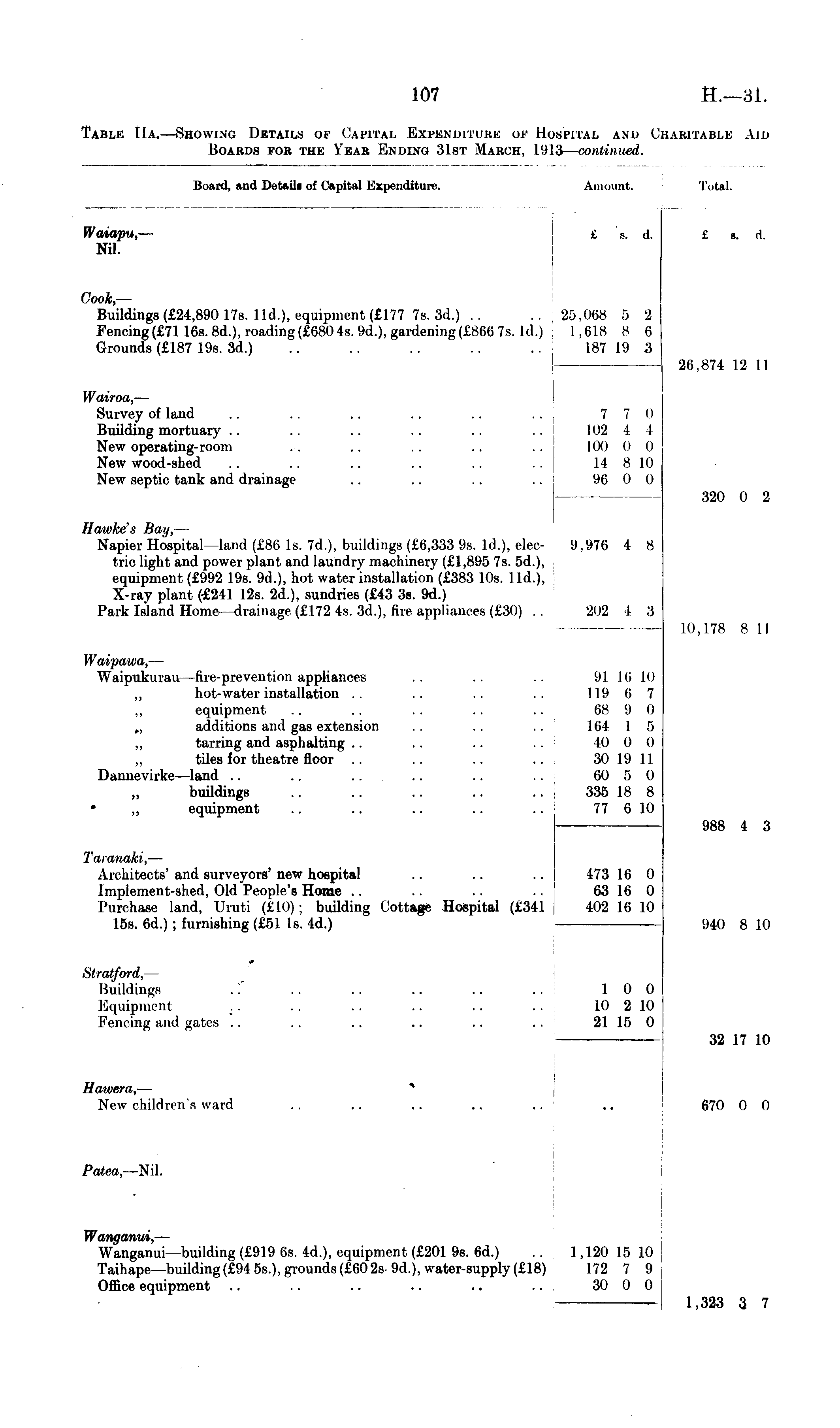 Board, and Detail! of Capital Expenditure. Amount. Total. Waiapu,— Nil. £ p. (1. £ s. d. £ s. d. Cook,— Buildings (£24,890 17s. lid.), equipment (£177 7s. 3d.) .. Fencing(£7116s. 8d.), roading(£6804s. 9d.), gardening(£866 7s. Id.) Grounds (£187 19s. 3d.) 25.068 5 2 1.018 8 6 187 19 3 25,068 6 1,618 s 187 19 2 6 3 26.874 12 11 Wairoa, — Survey of laud .. .. .. .. .. Building mortuary .. .. .. .. .. .. I New operating-room New wood-shed New septic tank and drainage 7 7 0 102 4 4 100 0 0 14 8 10 96 0 0 7 102 100 14 96 7 0 4 4 0 0 8 10 0 0 320 0 2 Hawke's Bay, — Napier Hospital—land (£86 Is. 7d.), buildings (£6,333 9s. Id.), electric light and power plant and laundry machinery (£1,895 7s. 5d.), equipment (£992 19s. 9d.), hot water "installation (£383 10s. 1 Id.), X-ray plant (£241 12s. 2d.), sundries (£43 3s. 9d.) Park Island Home—drainage (£172 4s. 3d.), fire appliances (£-' J ><>) .. '.|.!I76 4 8 202 I 3 10,178 8 II Waipawa, — Waipukurau—fire-prevention appliances „ hot-water installation . . ,, equipment „ additions and gas extension ,, tarring and asphalting .. .. .. .. „ tiles for theatre floor Dannevirke—land .. „ buildings .. .. .. .. .. ,, equipment .. .. .. .. 91 l<; 10 119 (I 7 68 9 0 164 1 5 40 0 0 30 19 11 60 5 0 335 18 8 77 6 10 Taranaki, — Architects' and surveyors' new hospital Implement-shed, Old People's Home Purchase land, Uruti (£10); building Cottage Hospital (£341 15s. 6d.) ; furnishing (£51 Is. 4d.) 473 16 0 63 16 0 402 16 10 988 4 3 473 16 0 63 16 0 402 16 10 940 8 10 Stratford, — Buildings Equipment .. .. .. .. .. Fencing and gates .. 1 0 0 10 2 10 21 15 0 32 17 10 Hawera, — New children's ward 670 0 0 Patea,— Nil. Wanganui, — Wanganui—building (£919 6s. 4d.), equipment (£201 9s. 6d.) Taihape—building(£94 5s.), grounds (£602s- 9d.), water-supply (£18) Office equipment .. .. .. .. .. .. 1,120 15 10 172 7 9 30 0 0