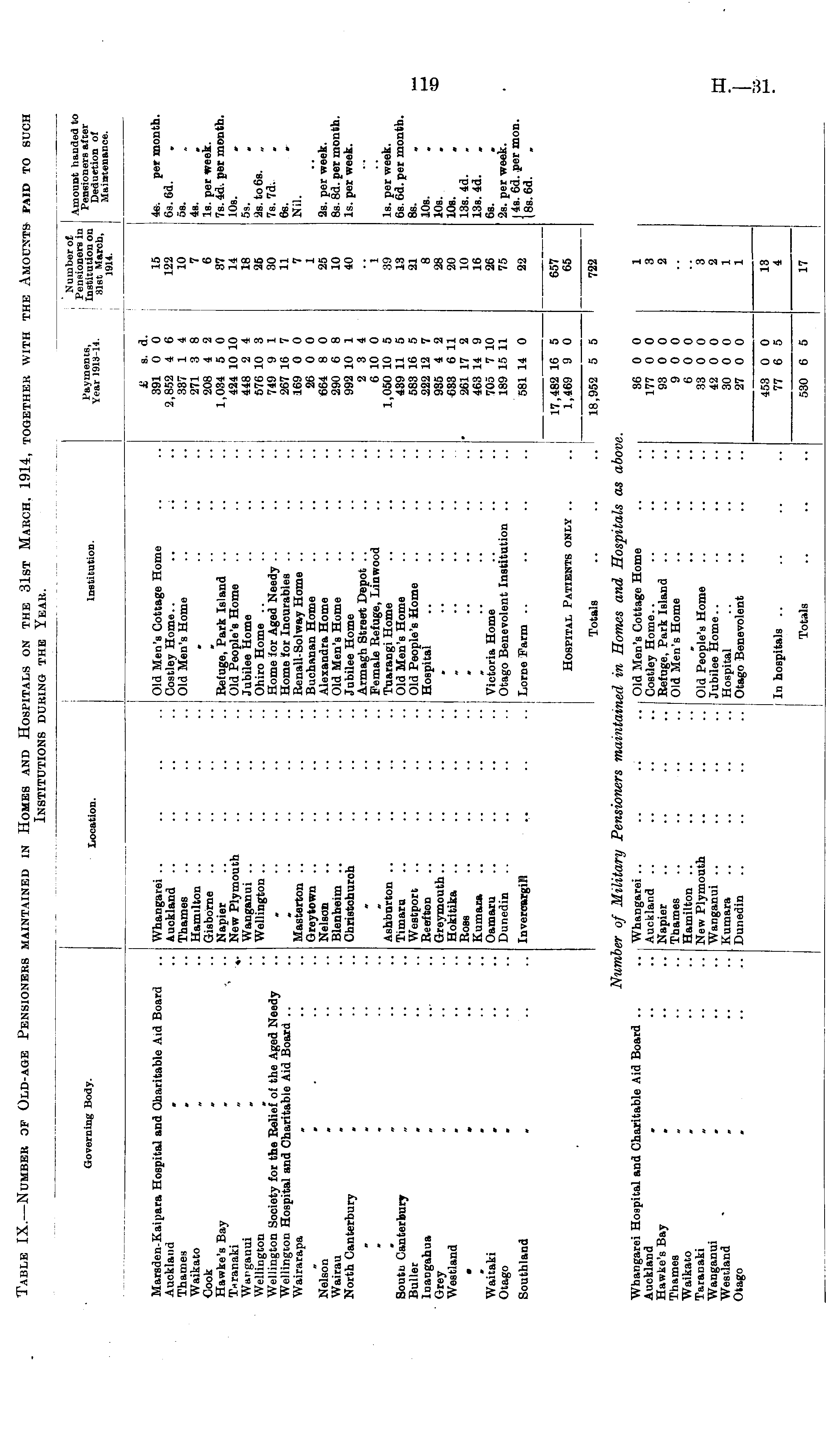 Governing Body. Location. Institution. Payments, Year 1913-14. pjJSSSSSln Amount handed t, InSuSon on Pensioners after £ a. d. Marsden-Kaipara Hospital and Charitable Aid Board .. Whangarei .. .. .. .. Old Men's Cottage Home .. .. 391 0 0 Auckland . .. Auckland .. .. .. .. Costley Home.. .. .; .. 2,852 4 6 Thames „ .. Thames .. .. .. .. Old Men's Home .. .. .. 337 1 4 Waikato „ .. Hamilton .. .. .. .. . .. .. .. 271 3 8 Cook „ .. Gisborne .. .. .. .. „ .. .. .. 208 4 2 Hawke's Bay „ . .. Napier .. .. .. .. Refuge, Park Island .. .. .. 1,034 5 0 T-ranaki , ' ,. New Plymouth .. .. ..! Old People's Home .. .. .. 4241010 Wai'ganui „ .. Wanganui .. .. .. .. | Jubilee Home .. .. .. 448 2 4 Wellington „ .. Wellington .. .. .. .. I Ohiro Home .. .. .. .. 576 10 3 Wellington Society for the Relief of the Aged Needy .. „ .. .. .. .. I Home for Aged Needy .. .. .. 749 9 1 Wellington Hospital and Charitable Aid Board .. .. „ .. .. .. .. Home for Incurables .. .. .. 267 16 7 Wairarapa , .... Masterton .. .. .. .. Renall-Solway Home .. .. .. 169 0 0 , . .... Greytown .. .. .. .. Buchanan Home .. .. .. 26 0 0 Nelson „ .... Nelson .. .. .. .. Alexandra Home .. .. .. 664 8 0 Wairau . .... Blenheim .. .. .. .. Old Men's Home .. .. .. 290 6 8 North Canterbury „ .... Christchuroh .. .. .. Jubilee Home .. .. .. 992 10 1 .. Armagh Street Depot .. .. .. 2 3 4 .. Female Refuge, Linwood .. .. 6 10 0 .. Ashburton .. .. .. .. Tuarangi Home .. .. .. 1,050 10 5 Soutu Canterbury „ .... Timaru .. .. .. .. Old Men's Home .. .. .. 439 11 5 Buller . .... Westport .. .. .. .. Old People's Home .. .. .. 583 16 5 luangahua „ ..... Reefton .. .. .. .. Hospital .. .. .. .. 222 12 7 Grey „ .... Greymouth.. .. .. .. . .. .. .. .. 935 4 2 Westland . .... Hokitika .. .. .. .. „ .. .. .. .. 633 6 11 . . .... Ross .. .. .. .. „ .. .. .. .. ' 261 17 2 .. Kumara .. .. .. .. „ .. .. .. .. 463 14 9 Waitaki . .... Oamaru .. .. .. .. Victoria Home .. .. .. 705 7 10 Otago „ .... Dunedin .. .. .. .. Otago Benevolent Institution .. .. 189 15 11 15 122 10 7 6 37 14 18 26 30 11 7 1 25 10 40 4e. per month. 6s. 6d. 5s. 4s. Is. per week. 7s. 4d. per month. 10s. 5s. 2s. to 6s. 7s. 7d. 6s. Nil. 2s. per week. 8s. 8d. per month. Is. per week. 1 39 13 ■21 8 28 20 10 16 26 75 Is. per week. 6s. 6d. per month. 8s. 10s. 10s. 10s. 13s. 4d. 13s. 4d. 6s. 2s. per week. j 4e. 6d. per mon. 18s. 6d. Southland . .... Invercargill .. .. .. Lome Farm .. .. .. .. 581 14 0 22 17,482 16 5 Hospital Patients only .. .. 1,469 9 0 657 65 Totals .. .. .. 18,952 5 5 722 Number of Military Pensioners maintained in Homes and Hospitals as above. 1 3 2 Whangarei Hospital and Charitable Aid Board .. .. Whangarei.. .. .: .. Old Men's Cottage Home .. .. 36 0 0 Auckland , .... Auckland .. .. .. .. Costley Home.. .. .. .. 177 0 0 Hawke's Bay . .... Napier .. .. .. .. Refuge, Park Island .. .. .. 93 0 0 Thames „ .... Thames .. .. .. .. Old Men's Home .. .. .. 9 0 0 Waikato „ .... Hamilton .. .. .. .. , .. .. .. 600 Taranaki „ .... New Plymouth .. .. .. Old People's Home .. .. .. 33 0 0 Wanganui . .... Wanganui .. .. .. .. Jubilee Home.. .. .. .. 42 0 0 Westland „ .... Kumara .. .. .. .. Hospital .. .. .. .. 30 0 0 OSago » .. .. Dunedin .. .. .. .. Otago Benevolent .. .. .. 27 0 0 3 2 1 1 453 0 0 j In hospitals .. .. .. .. 77 6 5 453 0 0 77 6 5 13 4 Totals .. .. .. 530 6 5 530 6 5 17