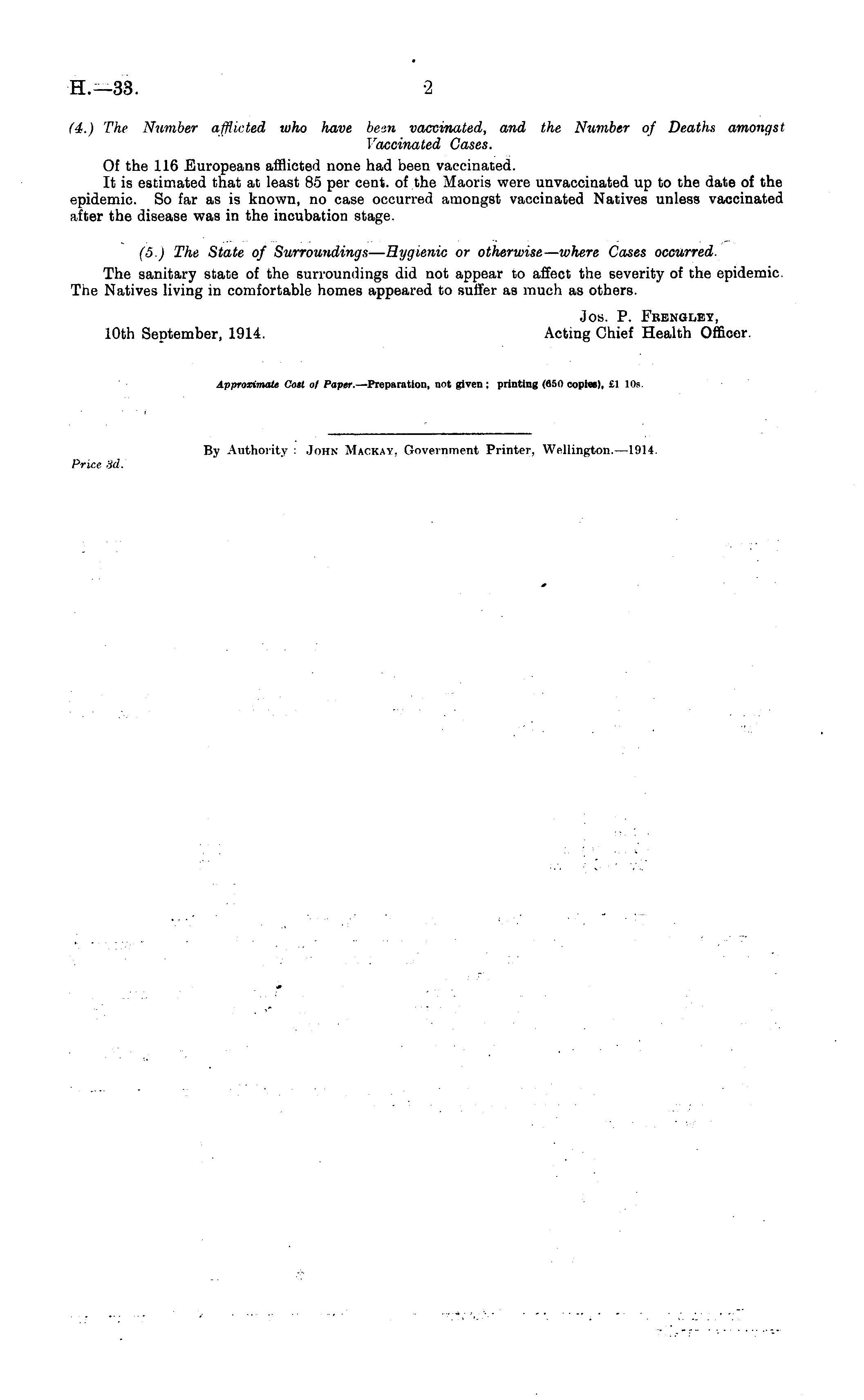 (4.) The Number afflicted who have bean vaccinated, and the Number of Deaths amongst Vaccinated Cases. Of the 116 Europeans afflicted none had been vaccinated. It is estimated that at least 85 per cent, of the Maoris were unvaecinated up to the date of the epidemic. So far as is known, no case occurred amongst vaccinated Natives unless vaccinated after the disease was in the incubation stage. (5.) The State of Surroundings — Hygienic or otherwise — where Cases occurred. The sanitary state of the surroundings did not appear to affect the severity of the epidemic. The Natives living in comfortable homes appeared to suffer as much as others. Jos. P. Frengley, 10th September, 1914. Acting Chief Health Officer.