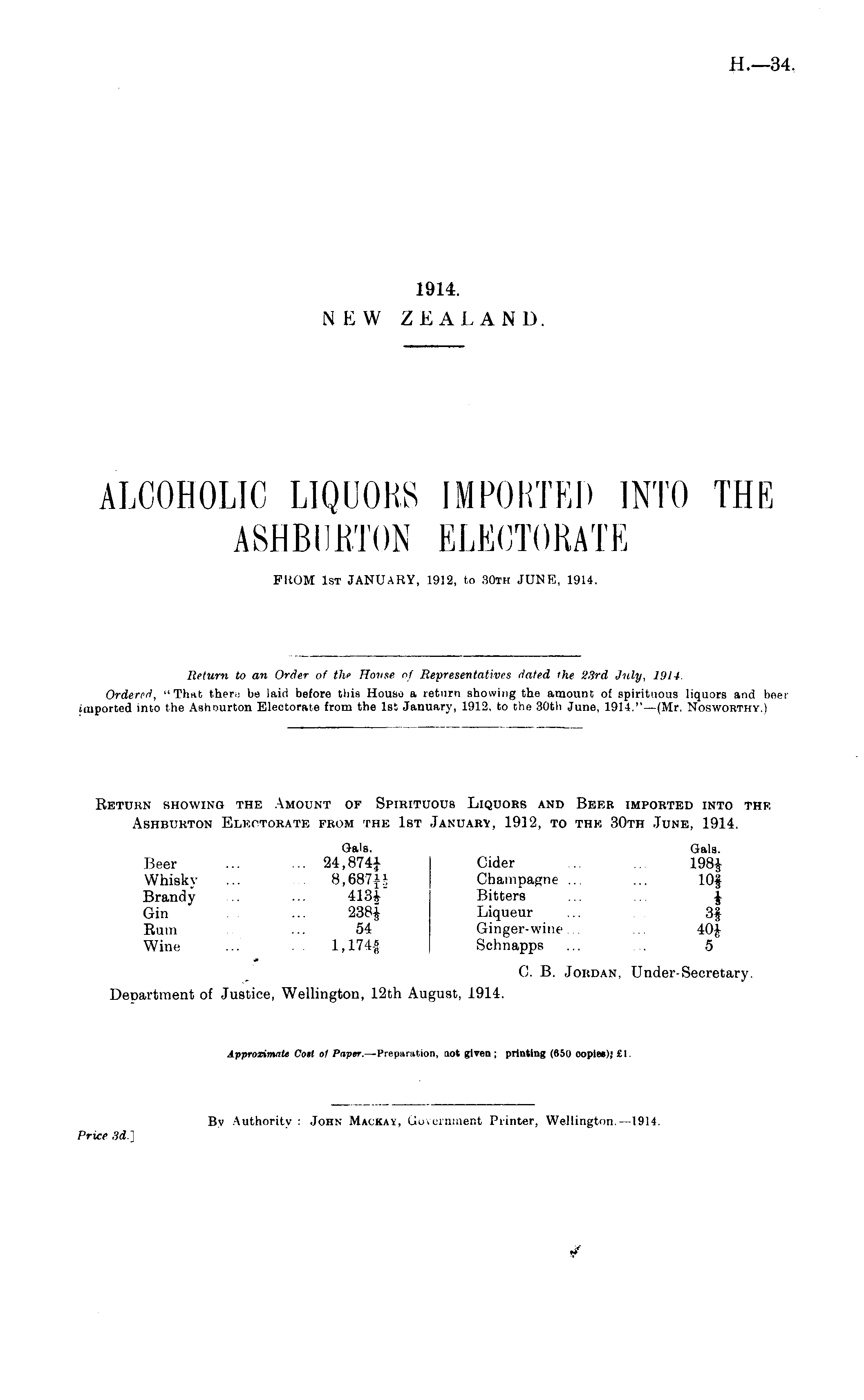 Return to an Order of the House of Representatives dated the 23rd July, 1914. Ordered, "Thut then: be laid before this Houso a return showing the amount of spirituous liquors and beer imported into the Aahourton Electorate from the Ist January, 1912, to the 30th June, 1914." —(Mr. Nosworthy.)