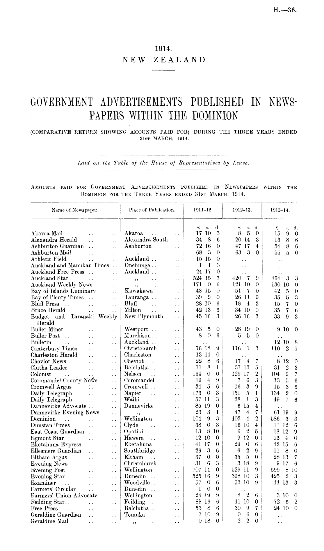GOVERNMENT ADVERTISEMENTS PUBLISHED IN NEWSPAPERS WITHIN THE DOMINION (COMPARATIVE RETURN SHOWING AMOUNTS PAID FOR) DURING THE THREE YEARS ENDED 31st MARCH, 1914.