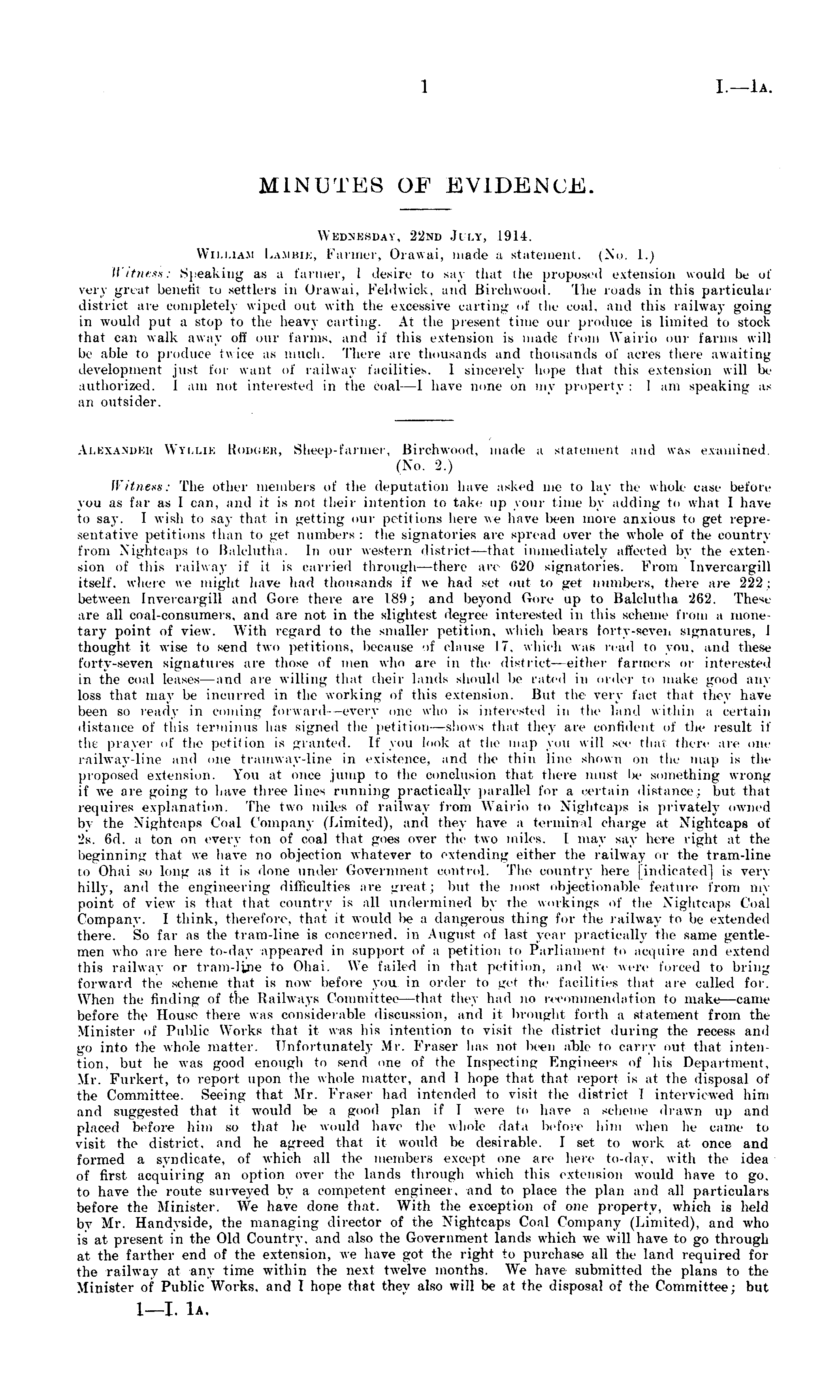 MINUTES OF EVIDENCE. Wednesday, 22nd July, 1914. William Lambie, Farmer, Orawai, made a statement. (No. 1.) Witness; Speaking as a farmer, 1 desire to say that the proposed extension would be of very great beiiftii to settlers in Orawai, Feldwick, and Birchwood. llie roads in this particular district are completely wiped out with the excessive carting of the coal, and this railway going in would put a stop to the heavy carting. At the present time our produce is limited to stock that can walk away off our farms, and if this extension is made from Wairio our farms will be able to produce twice as much. There are thousands and thousands of acres there awaiting development just for want of railway facilities. 1 sincerely hope that this extension will be authorized. 1 am not interested in the coal —I have none on my property :I am speaking a> an outsider. Alexander Wyi.uk Rodger, Sheep-farmer, Birchwood, made a statement and was examined. (No. 2.) Witness: The other members of the deputation have asked me to lay the whole case before you as far as 1 tan. and it is not their intention to take up your time by adding to what I have to say. I wish to say that in getting our petitions here we have been more anxious to get representative petitions than to get numbers : the signatories are spread over the whole of the country from Nightcaps to Balclutha. In our western district — that immediately affected by the extension of this railway if it is carried through—there are 620 signatories. From Invercargill itself, where we might have had thousands if we had set out to gel numbers, there are 222: between Invercargill and Gore there are 189; and beyond Gore up to Balclutha 262. These are all coal-consumers, and are not in the slightest degree interested in this scheme from a mone tary point of view. With regard to the smaller petition, which bears forty-seven signatures, 1 thought it wise to send two petitions, because of clause 17. which was read to you. and these forty-seven signatures are those of men who are in the district —either farmers or interested in the coal leases and are willing that their lands should be rated in order to make good any loss that may be incurred in the working of this extension. But the very fact that they have been so ready in ooming forward -every one who is interested in the land within a certain distance of this terminus has signed the petition— shows that they are confident of the result if the prayer of the petition is granted. If you look at the map you will see that there are one railway-line and one tramway-line in existence, and the thin line shown on the map is the proposed extension. You at once jump to the conclusion that there must lie something wrong if we are going to have three lineq running practically parallel for a certain distance: but that requires explanation. The two miles of railway from Wairio to Nightcaps is privately owned by the Nightcaps Coal Company (Limited), and they have a terminal charge at Nightcaps of 2s. 6d. a ton on wwy ton of coal that goes over the two miles. 1 may say here right at the beginning that we have no objection whatever to extending either the railway or the tram-line to Ohai so long as it is done under Government control. The country here [indicated] is very hill}', and the engineering difficulties are great; but the most objectionable feature from my point of view is that that country is all undermined by the workings of the Nightcaps Coal Company. I think, therefore, that it would lie a dangerous thing for the railway to be extended there. So far as the tram-line is concerned, in .August of last year practically the same gentlemen who are here to-day appeared in support of a petition to Parliament to acquire and extend this railway or tram-line to Ohai. We failed in that petition, and w< , were forced to bring forward the scheme that is now before you in order to get the facilities that arc called for. When the finding of the Railways Committee—that they had no recommendation to make —came before the House there was considerable discussion, and it brought forth a statement from the Minister of Public Works that it was his intention to visit tin' district during the recess and go into the whole matter. Unfortunately Mr. Fraser has not been able to oarry out that intention, but he was good enough to send one of the Inspecting Engineers of his Department. Mr. Furkert, to report upon the whole matter, and I hope that that report is at the disposal of the Committee. Seeing that Mr. Fraser had intended to visit tin , district I interviewed him and suggested that it would be a good plan if I were to have a scheme drawn up and placed before him so that he would have the whole data before hint when he came to visit the district, and he agreed that it would be desirable. I set to work at once and formed a syndicate, of which all the members except one are here to-day, with the idea of first acquiring an option over the lands through which this extension would have to go, to have the route surveyed by a competent engineer, and to place the plan and all particulars before the Minister. We have done that. With the exception of one property, which is held by Mr. Handyside, the managing director of the Nightcaps Coal Company (Limited), and who is at present in the Old Country, and also the Government lands which we will have to go through at the farther end of the extension, we have got the right to purchase all the land required for the railway at any time within the next twelve months. We have submitted the plans to the Minister of Public Works, and I hope that they also will be at the disposal of the Committee; but