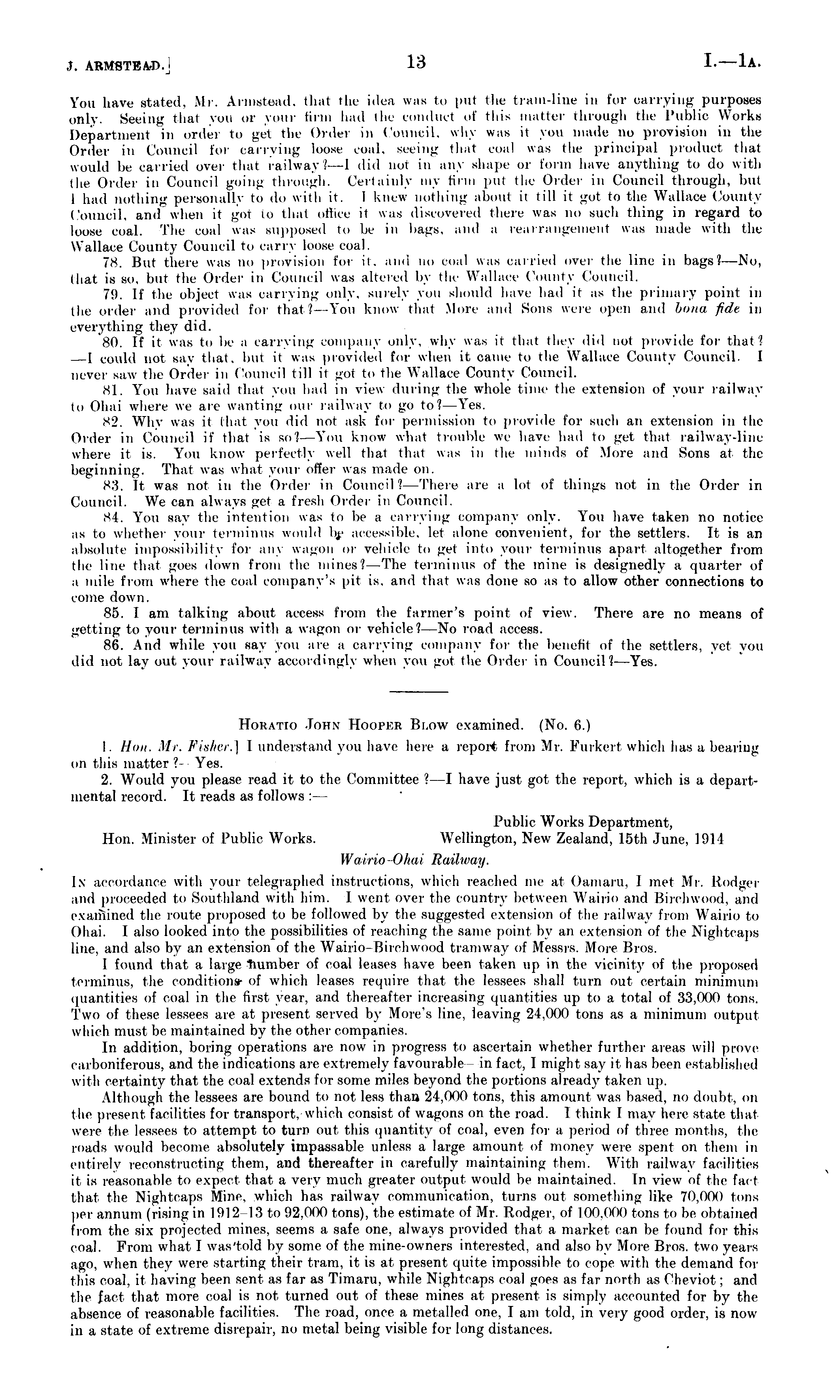 You have staled. Mr. Armstead, thai the idea was to pul the tram-line in for carrying purposes only. Seeing thai you or your firm liad the conduci of this matter through the Public Works Departmeni in ordei to gel the Order in Council, why was it yon made no provision in the Order in Council for carrying loose coal, seeing thai coal was the principal product thai would be carried over thai railway? I did uoi in any shape or form have anything to do with the Order in Council going through. Certainly ury firm pul the Order in Council through, but I had nothing personally to do with it. I knew nothing aboul it n'll it goi to the Wallace County Council, and when ii goi v. thai office it was discovered there was no such thing in regard t<> loose coal. The coal was supposed to be in bags, and a rearrangement was made with the Wallace County Council to carrj loose coal. IS. Bui there was no provision for it, ami no coal was carried over the line in bags? —No, thai is so. hut the Order in Council was altered by the Wallace County Council. 79. If the object >vas carrying only, eurely you should have had ii as the primary point in ill,, order and provided Tin' that i you know that More ami Sons were open mid hiimi fi//< in everything they did. SO. If it was to lie a carrying company only, why was it that they did not provide for that .' —I could not say that, hut it was provided for when it eaim- to the Wallace County Council. 1 never saw the Order in Council rill it got to the Wallace County Council. (SI. You have said that you had in view during the whole time the extension of your railway to Ohai where we are wanting our railway to go to? Yes. 82. Why was it thai you did not ask for permission to provide for such an extension in the Order in Council if that is bo?— You know what trouble we have hail to gel that railway-line where it is. You know perfectly well that that was in tin 1 minds of More and Sons at the beginning. 'That was what your offer was made on. 83. It was not in the Order in Council? —There arc a lot of things not in the Order in Council. We can always gel a fresh Order in Council. 84. You say tin' intention was to lie a carrying company only. You have taken no notice as to whether your terminus would hf accessible, let alone convenient, for the settlers. It is an absolute impossibility for any wago ■ vehicle to gel into your terminus apart altogether from the line that goes down from the mines.' The terminus of the mine is designedly a quarter of a mile from where the coal company's pit is. and that was done so as to allow other connections to come down. 85. lam talking about access from the farmer's point of view. There are no means of getting to your terminus with a wagon or vehicle?—No road access. 86. And while you say you are a carrying company for the benefit of the settlers, vet you did not lav out your railway accordingly when you goi the Order in Council?— Yes.