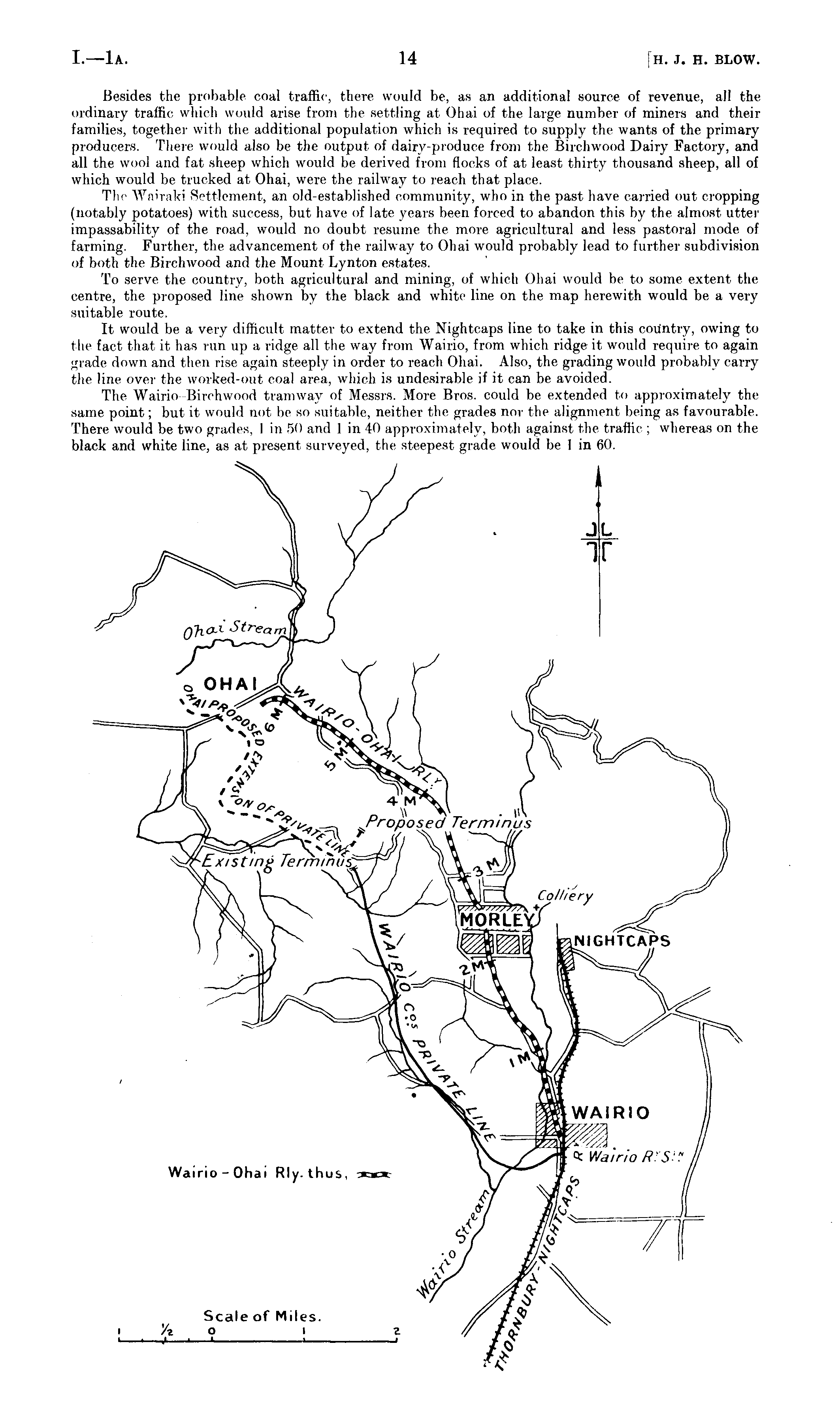 Besides the probable coal traffic, there would be, as an additional source of revenue, all the ordinary traffic which would arise from the settling at Ohai of the large number of miners and their families, together with the additional population which is required to supply the wants of the primary producers. There would also be the output of dairy-produce from the Birchwood Dairy Factory, and all the wool and fat sheep which would be derived from flocks of at least thirty thousand sheep, all of which would be trucked at Ohai, were the railway to reach that place. The Wairaki Settlement, an old-established community, who in the past have carried out cropping (notably potatoes) with success, but have of late years been forced to abandon this by the almost utter impassability of the road, would no doubt resume the more agricultural and less pastoral mode of farming. Further, the advancement of the railway to Ohai would probably lead to further subdivision of both the Birchwood and the Mount Lynton estates. To serve the country, both agricultural and mining, of which Ohai would be to some extent the centre, the proposed line shown by the black and white line on the map herewith would be a very suitable route. It would be a very difficult matter to extend the Nightcaps line to take in this coiintrv. owing to the fact that it has run up a ridge all the way from Wairio, from which ridge it would require to again grade down and then rise again steeply in order to reach Ohai. Also, the grading would probably carry the line over the worked-out coal area, which is undesirable if it can be avoided. The Wairio Birchwood tramway of Messrs. More Bros, could be extended to approximately the same point ; but it would not be so suitable, neither the grades nor the alignment being as favourable. Then , would be two grades, I in 50 and 1 in 40 approximately, both against the traffic ; whereas on the black and white line, as at present surveyed, the steepest grade would be 1 in 60.