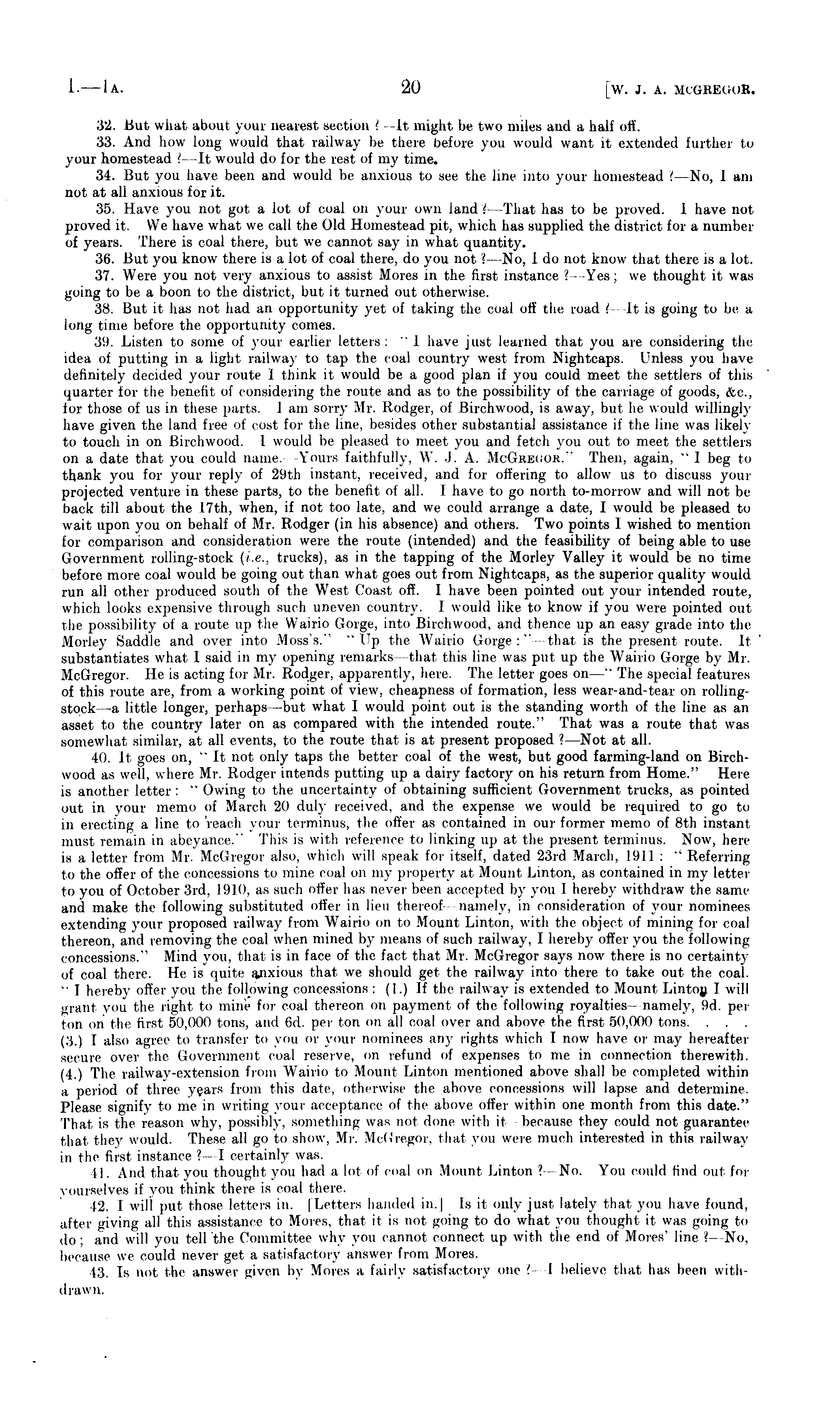 32. But what about your nearest section ?—lt might be two miles and a half off. 33. And how long would that railway be there before you would want it extended further t<i viiur homestead ?—lt would do for the reel of my time. 34. But you have been and would be anxious to see the line into your homestead '. No, 1 am not at all anxious for it. 35. Have you not got a lot of coal on your own land '. That has to be proved. 1 have not proved it. We have what we call the Old Homestead pit, which has supplied the district for a number of years. There is coal there, but we cannot say in what quantity. 36. But you know there is a lot of coal there, do you not ? -No, I do not know that there is a lot. 37. Were you not very anxious to assist Mores in the first instance ? —Yes; we thought it was going to be a boon to the district, but it turned out otherwise. 38. But it has not had an opportunity yet of taking the coal off the road (- It is going to be a long time before the opportunity comes. 39. Listen to some of your earlier letters: " I have just learned thai you are considering the idea of putting in a light railwax to tap the coal country west from Nightcaps. Unless you have definitely decided your route I think it would be a good plan if you could meet the settlers of this quarter for the benefit of considering the route and as to the possibility of the carriage of goods, &c, lor those of us in these parts. lam sorry Mr. Rodger, of Birchwood, is away, but he would willingly have given the land free of cost for the line, besides other substantial assistance if the line was likely to touch in on Birchwood. 1 would be pleased to meet you and fetch you out to meet the settlers on a date that you could name. Yours faithfully, \V. J. A. McGregoe." Then, again, " I beg to thank you for your reply of 29th instant, received, and for offering to allow us to discuss your projected venture in these parts, to the benefit of all. 1 have to go north to-morrow and will not be back till about the 17th, when, if not too late, and we could arrange a date, I would be pleased to wait upon you on behalt of Mr. Rodger (in his absence) and others. Two points 1 wished to mention for comparison and consideration were the route (intended) and the feasibility of being able to use Government rolling-stock (i.e., trucks), as in the tapping of the Morley Valley it would be no time before more coal would be going out than what goes out from Nightcaps, as the superior quality would ran all other produced south of the West Coast off. I have been pointed out your intended route, which looks expensive through such uneven country. I would like to know if you were pointed out the possibility of a route up the Wairio Gorge, into Birchwood, and thence up an easy grade into the Morley Saddle and over into Moss's." "Op the Wairio Gorge:" that is the present route. It substantiates what I said in my opening remarks—that this line was put up the Wairio Gorge by Mr. McGregor. He is acting for Mr. Rodger, apparently, here. The letter goes on —" The special features of this route are, from a working point of view, cheapness of formation, less wear-and-tear on rollingstock—a little longer, perhaps —but what I would point out is the standing worth of the line as an asset to the country later on as compared with the intended route.' - That was a route that was somewhat similar, at all events, to the route that is at present proposed '. .Not at all. |n. It goes on. " It not only taps the better coal of the west, but good farming-land on Birch wood as well, where Mr. Rodger intends putting up a dairy factory on his return from Home.'' Here is another letter : " Owing to the uncertainty of obtaining sufficient Government trucks, as pointed out in your memo of March 20 duly received, and the expense we would be required to go to in erecting a line to reach your terminus, the offer as contained in our former memo of Bth instant must remain in abeyance."' This is with reference to linking up at the present terminus. Now, here is a letter from Mr. McGregor also, which will speak for itself, dated 23rd March. 1911 : " Referring to the offer of the concessions to 'nine coal on my property at Mount Linton, as contained in my letter to you of October 3rd, I.HO. as such offer lias never been accepted by you 1 hereby withdraw the same and make the following substituted offer in lieu thereof namely, in consideration of your nominees extending your proposed railway from Wairio on i<> Mount Linton, with the object of mining for coal thereon, and removing tin , coal when mined by means of such railway, I hereby offer you the following concessions." Mind you. that is in face of the fact that Mr. McGregor says now there is no certainty of coal there. He is quite anxious that we should gel the railway into there to take out the coal. "I hereby offer you the following concessions: (I.) X the railway is extended to Mount Linton I will grant you the right to mine for coal thereon on payment of the following royalties namely. 9d. per ton on the first 50,000 tons, and fid. per ton on all coal over and above the first 50,000 tons. . . . (3.) I also agree to transfer to yon or your nominees any lights which I now have or may hereafter secure over the Government coal reserve, on refund of expenses to me in connection therewith. (I.) The railway-extension from Wairio to Mount Linton mentioned above shall be completed within ,i period of three years from this date, otherwise the above concessions will lapse and determine. Please signify to me in writing your acceptance of the above offer within one month from this date." Thai is tin , reason why. possibly, something was not done with it because they could not guarantee that they would. These all go to show. Mr. McGregor, thai you were much interested in this railway in the liist instance \ I certainly was. 11. And that you thought you had a lot of coal mi Mount Linton '. No. You could find out lor yourselves