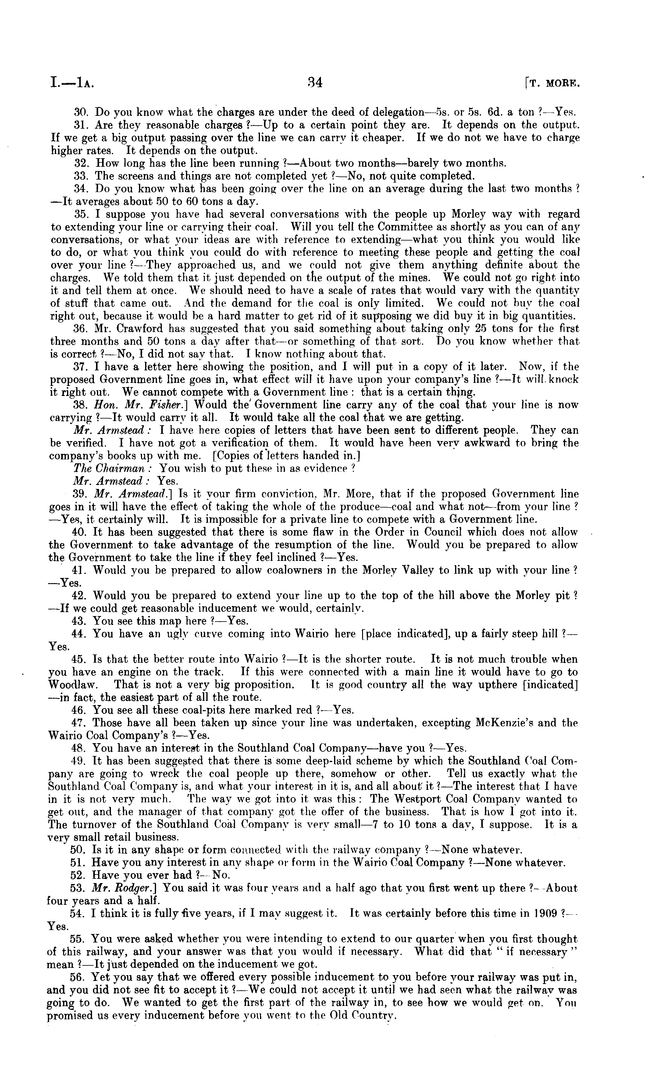 30. Do you know what the charges are under the deed of delegation —ss. or ss. 6d. a ton '. Yes. 31. Are they reasonable charges ? —Up to a certain point they are. It depends on the output. If we get a big output passing over the line we can carry it cheaper. If we do not we have to charge higher rates. It depends on the output. 32. How long has the line been running ?—About two months —barely two months. 33. The screens and things are not completed yet ?—No, not quite completed. 34. Do you know what has been going over the line on an average during the last two months ? —It averages about 50 to 60 tons a day. 35. I suppose you have had several conversations with the people up Morley way with regard to extending your line or carrying their coal. Will you tell the Committee as shortly as you can of any conversations, or what your ideas are with reference to extending —what you think you would like to do, or what you think you could do with reference to meeting these people and getting the coal over your line ?— They approached us, and we could not give them anything definite about the charges. We told them that it just depended on the output of the mines. We could not go right into it and tell them at once. We should need to have a scale of rates that would vary with the quantity of stuff that came out. And the demand for the coal is only limited. We could not buy the coal right out, because it would be a hard matter to get rid of it supposing we did buy it in big quantities. 36. Mr. Crawford has suggested that you said something about taking only 25 tons for the first three months and 50 tons a day after that or something of that sort. Do you know whether that is correct ?—No, I did not say that. I know nothing about that. 37. I have a letter here showing the position, and I will put in a copy of it later. Now, if the proposed Government line goes in, what effect will it have upon your company's line ? —lt will.knock it right out. We cannot compete with a Government line : that is a certain thjng. 38. Hon. Mr. Fisher.] Would the Government line carry any of the coal that your line is now carrying ?—lt would carry it all. It would take all the coal that we are getting. Mr. Arinstead: I have here copies of letters that have been sent to different people. They can be verified. I have not got a verification of them. It would have been very awkward to bring the company's books up with me. [Copies of letters handed in.] The Chairman : You wish to put these in as evidence \ Mr. Armstead : Yes. 39. Mr. Armstead.] Is it your firm conviction. Mr. More, that if the proposed Government line goes in it will have the effect of taking the whole of the produce—coal and what not —from your line ? —Yes, it certainly will. It is impossible for a private line to compete with a Government line. 40. It has been suggested that there is some flaw in the Order in Council which does not allow the Government to take advantage of the resumption of the line. Would you be prepared to allow the Government to take the line if they feel inclined ?—Yes. 41. Would you be prepared to allow coalowners in the Morley Valley to link up with your line ? —Yes. 42. Would you be prepared to extend your line up to the top of the hill above the Morley pit ? —If we could get reasonable inducement we would, certainly. 43. You see this map here ?—Yes. 44. You have an ugly curve coming into Wairio here [place indicated], up a fairly steep hill ? — Yes. 45. Is that the better route into Wairio ? —lt is the shorter route. It is not much trouble when you have an engine on the track. If this were connected with a main line it would have to go to Woodlaw. That is not a very big proposition. It is good country all the way upthere [indicated] —in fact, the easiest part of all the route. 46. You see all these coal-pits here marked red ?—Yes. 47. Those have all been taken up since your line was undertaken, excepting McKenzie's and the Wairio Coal Company's ?—Yes. 48. You have an interest in the Southland Coal Company—have you ?—Yes. lit. It has been suggested that there is some deep-laid scheme by which the Southland Coal Company are going to wreck the coal people up there, somehow or other. Tell us exactly what the Southland Coal Company is, and what your interest in it is, and all about it ?—The interest that I have in it is not very much. The way we got into it was this : The Westport Coal Company wanted to get out, and the manager of that company got the offer of the business. That is how I got into it. The turnover of the Southland Coal Company is very small —7 to 10 tons a day, I suppose. It is a very small retail business. 50. Is it in any shape or form connected with the railway company ( -None whatever. 51. Have you any interest in any shape or form in the Wairio Coal Company ? —None whatever. 52. Have you ever had ?- No. 53. Mr. Rodger.] You said it was four years and a half ago that you first went up there ?- About four years and a half. 54. I think it is fully ■five years, if I may suggest it. It was certainly before this time in 1909 ?— Yes. 55. You were asked whether you were intending to extend to our quarter when you first thought of this railway, and your answer was that you would if necessary. What did that "if necessary mean ?—lt just depended on the inducement we got. 56. Yet you say that we offered every possible inducement to you before your railway was put in, and you did not see fit to accept it ? —We could not accept it until we had seen what the railway was going to do. We wanted to get the first part of the railway in, to see how we would get on. You promised us every inducement before you went to the Old Country.