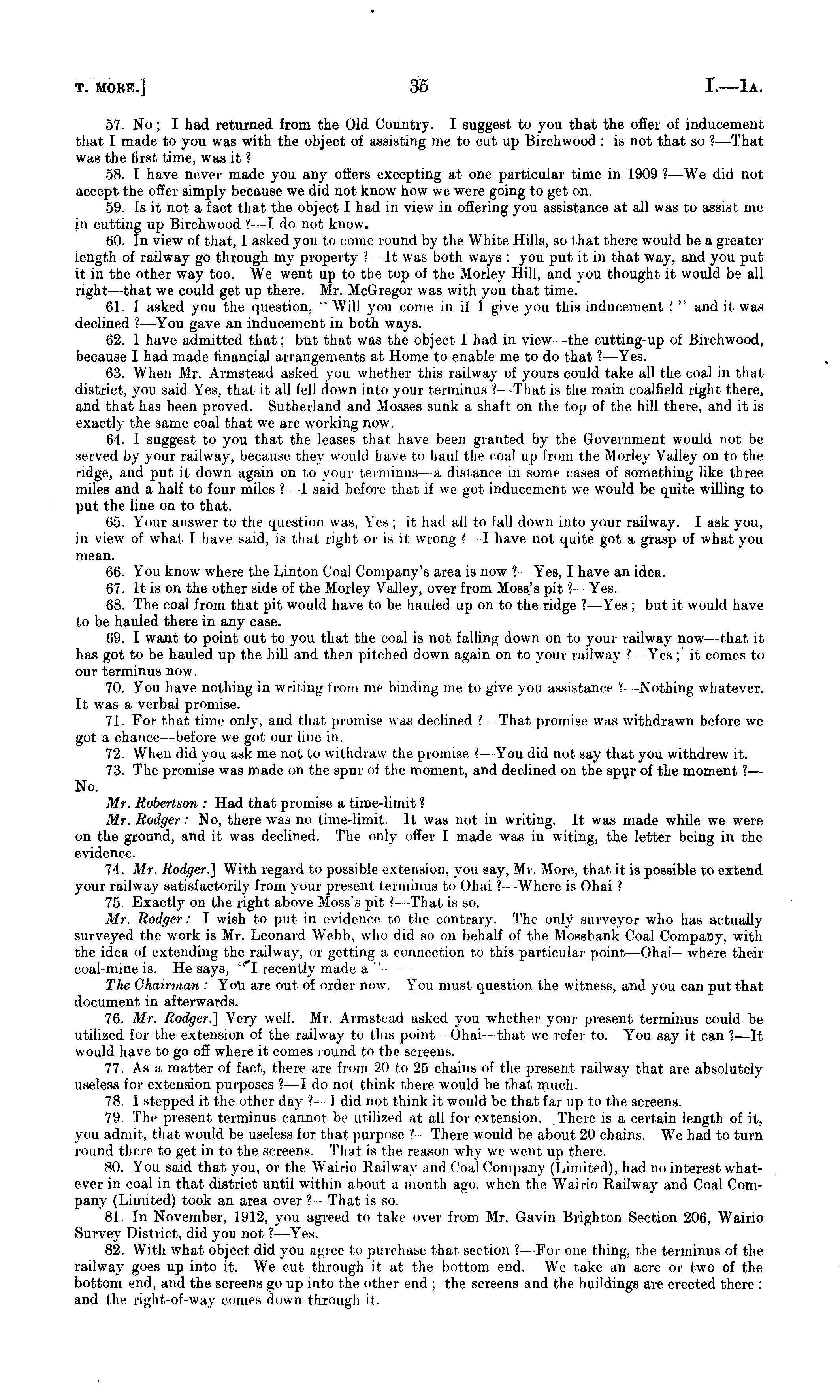 57. No ; I had returned from the Old Country. I suggest to you that the ofier of inducement that 1 made to you was with the object of assisting me to cut up Birch wood : is not that so ?—That was the first time, was it ? 58. I have never made you any offers excepting at one particular time in 1909 ?—We did not accept the offer simply because we did not know how « c were going to get on. 59. Is it not a fact that the object I had in view in offering you assistance at all was bo assist me in cutting up Birchwood ?■ -I do not know. 60. In view of that, I asked you to come round by the White Hills, so that there would be a greater length of railway go through my property ?- It was both ways : you put it in that way, and you put it in the other way too. We went up to the top of the Morley Hill, and you thought it would be all right—that we could get up there. Mr. McGregor was with you that time. 61. I asked you the question, " Will you come in if I give you this inducement ( " and it was declined ? —You gave an inducement in both ways. 62. I have admitted that; but that was the object 1 had in view—the cutting-up of Birchwood, because I had made financial arrangements at Home to enable me to do that ? —Yes. 63. When Mr. Armstead asked you whether this railway of yours oould take all the coal in that district, you said Yes, that it all fell down into your terminus i That is the main coalfield right there, and that has been proved. Sutherland and .Mosses sunk a shaft on the top of the hill there, and it is exactly the same coal that we are working now. 64. I suggest to you that the leases that have been granted by the Government would not be served by your railway, because they would have to haul the coal up from the Morley Valley on to the ridge, and put it down again on to your terminus —a distance in some cases of something like three miles and a half to four miles ? -I said before that if we got inducement we would be quite willing to put the line on to that. 65. Your answer to the question was, Yes ;it had all to fall down into your railway. 1 ask you, in view of what I have said, is that right or is it wrong ?— I have not quite got a grasp of what you mean. 66. You know where the Linton Coal < lompany's area is now ?—Yes, I have an idea. 67. It is on the other side of the Morley Valley, over from Moss's pit ?■■ -Yes. 68. The coal from that pit would have to be hauled up on to the ridge ?- Yes ; but it would have to be hauled there in any case. 69. I want to point out to you that the coal is not falling down on to your railway now- that it has got to be hauled up the hill and then pitched clown again on to your railway ?—Yes; it comes to our terminus now. 70. You have nothing in writing from me binding me to give you assistance ?—Nothing whatever. It was a verbal promise. 71. For that time only, and that promise was declined ?- That promise was withdrawn before we got a chance —before we got our line in. 72. When did you ask me not to withdraw the promise ?■ You did not say that you withdrew it. 73. The promise was made on the spur of the moment, and declined on the spur of the moment ? — No. Mr. Robertson : Had that promise a time-limit ? Mr. Rodger: No, there was no time-limit. It was not in writing. It was made while we were on the ground, and it was declined. The only offer 1 made was in witing, the letter being in the evidence. 74. Mr. Rodger.] With regard to possible extension, you say, Mr. More, that it is possible to extend your railway satisfactorily from your present terminus to Ohai ?—Where is Ohai ? 75. Exactly on the right above Moss's pit ?- That is so. Mr. Rodger: I wish to put in evidence to the contrary. The only surveyor who has actually surveyed the work is Mr. Leonard Webb, who did so on behalf of the Mossbank Coal Company, with the idea of extending the railway, or getting a connection to this particular point—Ohai— where their coal-mine is. He says, ""I recently made a"■ The Chairman : You are out of order now. You must question the witness, and you can put that document in afterwards. 76. Mr. Rodger.] Very well. Mr. Armstead asked you whether your present terminus could be utilized for the extension of the railway to this point Oliai —that we refer to. You say it can ?—lt would have to go off where it comes round to the screens. 77. As a matter of fact, there are from 20 to 25 chains of the present railway that are absolutely useless for extension purposes ?—I do not think there would be that much. 78. I stepped it the other day ?-■■ I did not think it would be that far up to the screens. 79. The present terminus cannot be utilized at all for extension. There is a certain length of it, \on admit, that would be useless for that purpose '. There would be about 20 chains. We had to turn round t here to get in to the screens. That is the reason why we went up there. 80. You said that you, or the Wairio Railway and Coal Company (Limited), had no interest whatever in coal in that district until within about a month ago, when the \Yaiii o Eailway and Coal Company (Limited) took an area over ? That is so. 81. In November, 1912, you agreed to take over from Mr. Gavin Brighton Section 206, Wairio Survey District, did you not ?--Yes. 82. With what object did you agree to purchase thai section '. For one bhing, the terminus of the railway goes up into it. We cut through it at the bottom end. We take an acre or two of the bottom end, and the screens go up into the other end ; the screens and the buildings are erected there : and the right-of-way comes down through it.