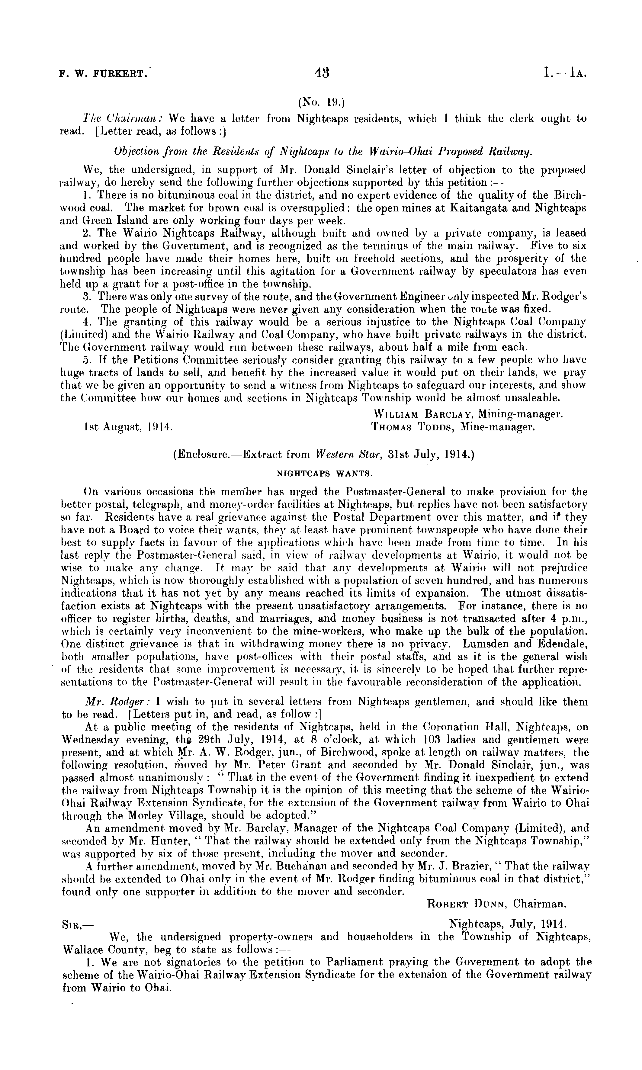 (No. 19.) 1 'hairman : We have a letter from Nightcaps residents, which 1 think the clerk ought to read. [Letter read, as follows :] Objection from the Residents of Nightcaps to l/ie Wairio-O/uti Proponed Railway. We, the undersigned, in support of Mr. Donald Sinclair's letter of objection to the proposed railway, do hereby send the following further objections supported by this petition : 1. There is no bituminous coal in the district, and no expert evidence of the quality of the Birchwood coal. The market for brown coal is oversupplied: the open mines at Kaitangata and Nightcaps and Green Island are only working four days per week. 2. The Wairio-Nightcaps Railway, although built and owned by a private company, is leased and worked by the Government, and is recognized as the terminus i>l the main railway. Five to six hundred people have made their homes here, built mi freehold sections, and the prosperity of the township has been increasing until this agitation for a Government railway by speculators has even held up a grant for a post-office in the township. 3. There was only one survey of the route, and the Government Engineer ..iily inspected Mr. Rodger's route. The people of Nightcaps were never given any consideration when the route was fixed. 4. The granting of this railway would be a serious injustice to the Nightcaps Coal Company (Limited) and the Wairio Railway and Coal Company, who have built private railways in the district. The Government railway would run between these railways, about half a mile from each. 5. If the Petitions Committee seriously consider granting this railway to a few people who have huge tracts of lands to sell, and benefit by the increased value it would put on their lands, we pray that we lie given an Opportunity to send a witness from Nightcaps to safeguard our interests, and show the Committee how our homes and sections in Nightcaps Township would be almost unsaleable. William Barclay, Mining-manager. Ist August, 1914. Thomas Todds, Mine-manager. (Enclosure. Extract from Western Star, 31st July, 1914.) NIGHTCAPS WANTS. On various occasions the member has urged the Postmaster-(ieiieral to make provision for the better postal, telegraph, and money-order facilities at Nightcaps, hut replies have not been satisfactory so far. Residents have a real grievance against the Postal Department over this matter, and if they have not a Board to voice their wants, the) 7 at least have prominent townspeople who have done their lust to supply facts in favour of the applications which have been made from time to time. In his last reply the Postmaster-General said, in view of railway developments at Wairio, it would not be wise to make any change. If may be said that any developments at Wairio will not prejudice Nightcaps, which is now thoroughly established with a population of seven hundred, and has numerous indications that it has not yet by any means reached its limits of expansion. The utmost dissatisfaction exists at Nightcaps with the present unsatisfactory arrangements. For instance, there is m> officer to register births, deaths, and marriages, and money business is not transacted after 4 p.m., which is certainly very inconvenient to the mine-workers, who make up the bulk of the population. One distinct grievance, is that in withdrawing money there is no privacy. Lumsden and Kdondale, both smaller populations, have post-offices with their postal staffs, and as it is the general wish of I he residents that some improvement is necessary, it is sincerely to lie hoped that further representations to the Postmaster-General will result in the favourable reconsideration of the application. Mr. Rodger: I wish to put in several letters from Nightcaps gentlemen, and should like them to be read. [Letters put in, and read, as follow :] At a public meeting of the residents of Nightcaps, hold in the Coronation Hall, Nightcaps, on Wednesday evening, the 29th July. 1914, at 8 o'clock, at which 103 ladies and gentlemen were present, and at which Mr. A. W. Rodger, jun., of Birchwood, spoke at length on railway matters, the following resolution, moved by Mr. Peter Grant and seconded by Mr. Donald Sinclair, jun., was passed almost unanimously : " That in the event of the Government rinding it inexpedient to extend the railway from Nightcaps Township it is the opinion of this meeting that the scheme of the WairioOhai Railway Extension Syndicate, for the extension of the Government railway from Wairio to Ohai through the Morley Village, should be adopted." An amendment moved by Mr. Barclay, Manager of the Nightcaps Coal Company (Limited), and seconded by Mr. Hunter. " That the railway should be extended only from the Nightcaps Township," was supported by six of those present, including the mover and seconder. A further amendment, moved by Mr. Buchanan and seconded by Mr. J. Brazier. " That the railway should be extended to Ohai only in the event of Mr. Rodger finding bituminous coal in that district," found only one supporter in addition to the mover and seconder. Robert Dunn, Chairman. Sir,— Nightcaps, July, 1914. We, the undersigned property-owners and householders in the Township of Nightcaps. Wallace County, beg to state as follows: — 1. We are not signatories to the petition to Parliament praying the Government to adopt the scheme of the Wairio-Ohai Railway Extension Syndicate Eor the extension of the Government railway from Wairio to Ohai.