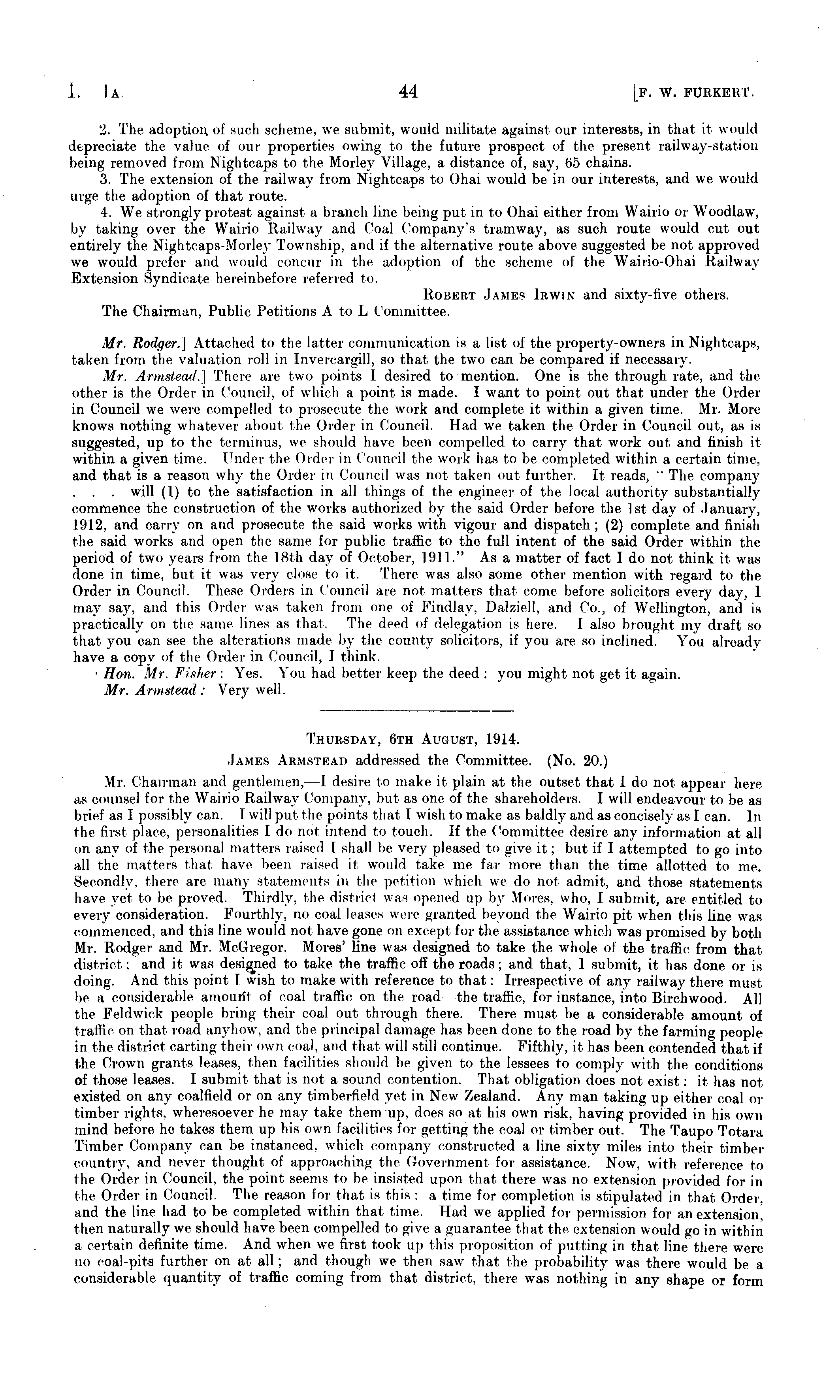 Thursday, 6th August, 1914. James Armstead addressed the Committee. (No. 20.) Mr. Chairman and gentlemen,—l desire to make it plain at the outset that J do not appear here as counsel for the Wairio Railway Company, but as one "I the shareholders. I will endeavour to be as brief as I possibly can. I will put the points that I wish to make as baldly and as concisely as I can. In the first place, personalities Ido not intend to touch. If the Committee desire any information at all on any of the personal matters raised I shall be very pleased to give it; but if I attempted to go into all the matters that have been raised it would take me far more than the time allotted to me. Secondly, there are many statements in the petition which we do not admit, and those statements have vet to be proved. Thirdly, the district was opened up by Mores, who, I submit, are entitled to every consideration. Fourthly, no coal leases were granted beyond the Wairio pit when this line was commenced, and this line would not have gone on except for the assistance which was promised by both Mr. Rodger and Mr. McGregor. Moves' line was designed to take the whole of the traffic from that district ; and it was designed to take the traffic oft the roads; and that, 1 submit, it has done or is doing. And this point T wish to make with reference to that: Irrespective of any railway there must be a considerable amourfi of coal traffic on the road the traffic, for instance, into Birchwood. All the Feldwick people bring their coal out through there. There must be a considerable amount of traffic on that road anyhow, and the principal damage has been done to the road by the farming people in the district carting their own coal, and that will still continue. Fifthly, it has been contended that if (.he Crown grants leases, then facilities should be given to the lessees to comply with the conditions of those leases. I submit that is not a sound contention. That obligation does not exist: it has not existed on any coalfield or on any timberfield yet in New Zealand. Any man taking up either coal or timber rights, wheresoever he may take them up, does so at his own risk, having provided in his own mind before he takes them up his own facilities for getting the coal or timber out. The Taupo Totara Timber Company can be instanced, which company ((instructed a line sixty miles into their timber country, and never thought of approaching the Government for assistance. Now. with reference to the Order in Council, the point seems to be insisted upon that there was no extension provided for in the Order in Council. The reason for that is this : a time for completion is stipulated in that Older. and the line had to be completed within that time. Had we applied for permission for an extension, then naturally we should have been compelled to give a guarantee that the extension would go in within a certain definite time. And when we first took up this proposition of putting in that line there were no coal-pits further on at all; and though we then saw that the probability was there would be a considerable quantity of traffic coming from that district, there was nothing in any shape or form