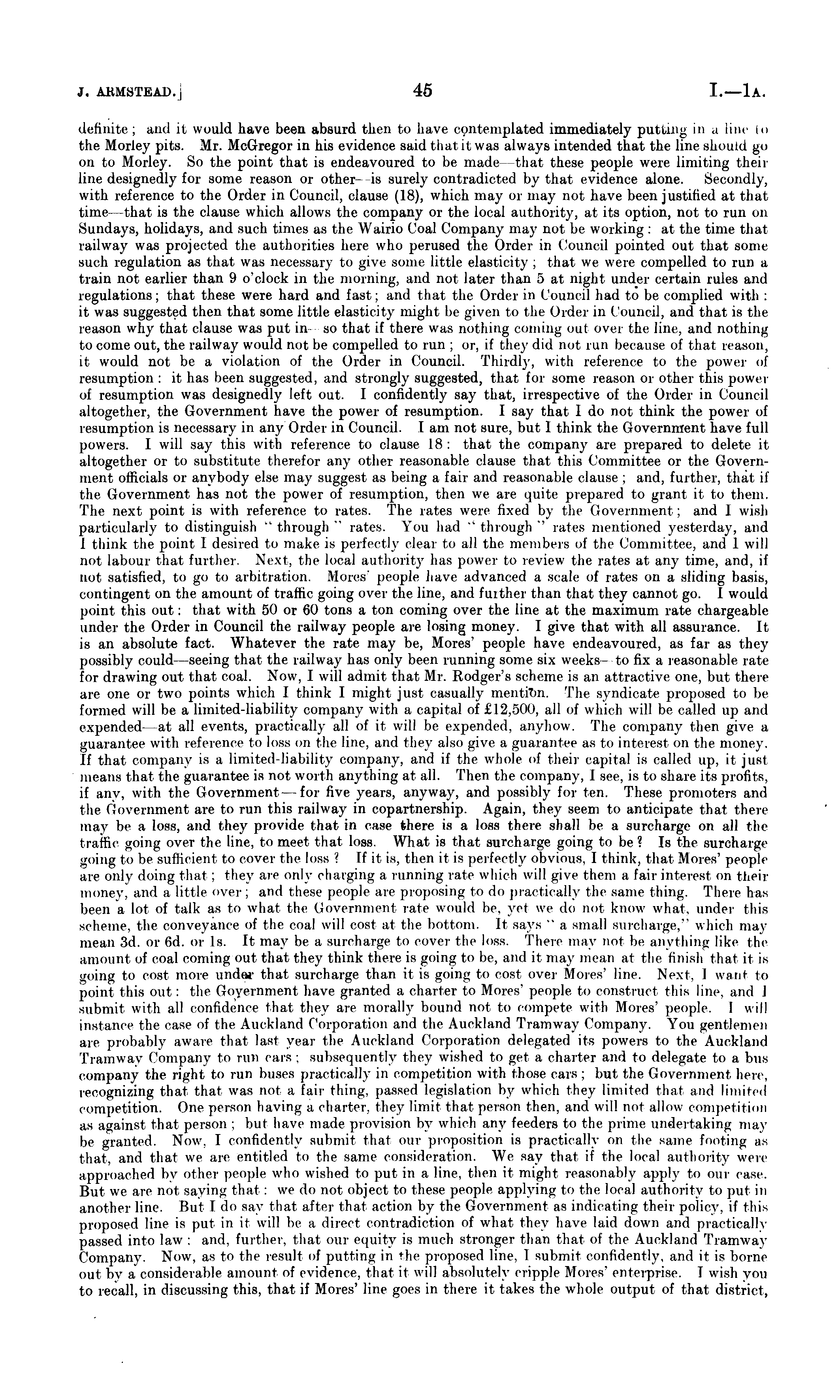 definite; and it would have been absurd then to have contemplated immediately putting in a line Lo the Morley pits. Mr. McGregor in his evidence said that it was always intended that the line should go on to Morley. So the point that is endeavoured to be made that these people were limiting their line designedly for some reason or other is surely contradicted by that evidence alone. Secondly, with reference to the Order in Council, clause (18), which may or may not have been justified at that time- that is the clause which allows the company or the local authority, at its option, not to run on Sundays, holidays, and such times as the Wairio Coal Company may not be working : at the time that railway was projected the authorities here who perused the Order in Council pointed out that some such regulation as that was necessary to give some little elasticity ; that we were compelled to run a train not earlier than 9 o'clock in the morning, and not later than 5 at night under certain ruies and regulations; that these were hard and fast; and that the Order in Council had to be complied with : it was suggested then that some little elasticity might hi- given to the Order in Council, and that is the reason why that clause was put in so that if there was nothing coming out over the line, and nothing to come out, the railway would not be compelled to run ; or, if they did not run because of that reason. it would not be a violation of the Order in Council. Thirdly, with reference to the power of resumption: it has been suggested, and strongly suggested, that for some reason or other this power of resumption was designedly left out. I confidently say that, irrespective of the Order in Council altogether, the Government have the power of resumption. I say that Ido not think the power of resumption is necessary in any Order in Council. lam not sure, but 1 think the Government have full powers. 1 will say this with reference to clause 18: that the company are prepared to delete it altogether or to substitute therefor any other reasonable clause that this Committee or the Govern ment officials or anybody else may suggest as being a fair and reasonable clause ; and, further, that if the Government has not the power of resumption, then we are quite prepared to grant it to them. The next point is with reference to rates. The rates were fixed by the Government; and 1 wish particularly to distinguish " through " rates. You had " through " rates mentioned yesterday, and I think the point I desired to make is perfectly clear to all the members of the Committee, and 1 will not labour that further. Next, the local authority has power to review the rates at any time, and. if not satisfied, to go to arbitration. Mores' people have advanced a scale of rates on a sliding basts. contingent on the amount of traffic going over the line, and fuither than that they cannot go. 1 would point this out : that with 50 or 60 tons a ton coming over the line at the maximum rate chargeable under the Order in Council the railway people are losing money. I give that with all assurance. It is an absolute fact. Whatever the rate may be, Mores' people have endeavoured, as far as they possibly could— seeing that the railway has only been running some six weeks to fix a reasonable rate for drawing out that coal. Now, I will admit that Mr. Rodger's scheme is an attractive one, but there are one or two points which I think I might just casually mention. The syndicate proposed to be formed will be a limited-liability company with a capital of £12,500, all of which will be called up and expended- -at all events, practically all of it will be expended, anyhow. The company then give a guarantee with reference to loss on the line, and they also give a guarantee as to interest on the money. If that company is a limited-liability company, and if the whole of their capital is called up, it just means that the guarantee is not wort h anything at all. Then the company, 1 see. is to share its profits, if any, with the Government for live years, anyway, and possibly lor ten. These promoters and the Government are to run this railway in copartnership. Again, they seem to anticipate that there may he a loss, and they provide that in ease there is a loss there shall he a surcharge on all the traffic going over the line, to meet that loss. What is that surcharge going to be? Is the surcharge going to be sufficient to cover the loss '. If it is. then it is perfectly obvious. 1 think, that Mores' people are only doing that : they are only charging a running rate which will give them a fair interest on their money, and a little over : and these people are proposing to do practically the same thing. There has been a lot of talk as to what the Government rate would be. yet we do not know what, under this scheme, the conveyance of the coal will cost at the bottom. It says " a small surcharge," which may mean 3d. or lid. or Is. It may be a .surcharge to cover the loss. There may nof be anything like the amount of coal coming out that they t hink there is going to be, and it may mean at the finish that it is going to cost more under that surcharge than it is going to cost over Mores' line. Next, 1 want to point this out : the Government have granted a charter to Mores' people to construct this line, and 1 submit with all confidence that they are morally bound not to compete with Mines' people. I will instance the case of the Auckland Corporation and the Auckland Tramway Company. You gentlemen are probably aware that last year the Auckland Corporation delegated its powers to the Auckland Tramway Company to ran cars: subsequently they wished to get a charter and to delegate to a bus company the right to run buses practically in competition with those cars : but the Government here, recognizing that that was not a fair thing, passed legislation by which they limited that and limited competition. One person having a charter, they limit that person t hen. and will
