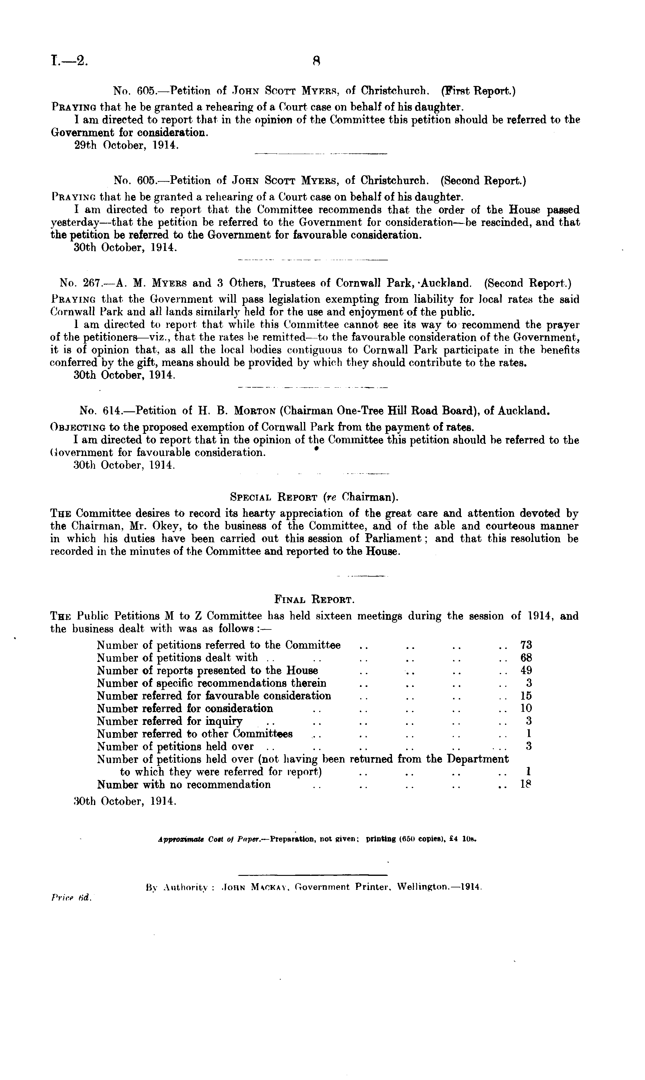 Final Report. The Public Petitions M to Z Committee has held sixteen meetings during the session of 1914, and the business dealt with was as follows :— Number of petitions referred to the Committee .. .. .. 73 Number of petitions dealt with .. .. .. .. .. 68 Number of reports presented to the House .. .. .. 49 Number of specific recommendations therein .. .. .. .. 3 Number referred for favourable consideration .. .. .. 15 Number referred for consideration .. .. .. 10 Number referred for inquiry .. .. .. .. .. .. 3 Number referred to other Committees .. .. .. . . 1 Number of petitions held over .. .. .. .. ... 3 Number of petitions held over (not having been returned from the Department to which they were referred for report) .. .. .. .. 1 Number with no recommendation .. .. 18 30th October, 1914.