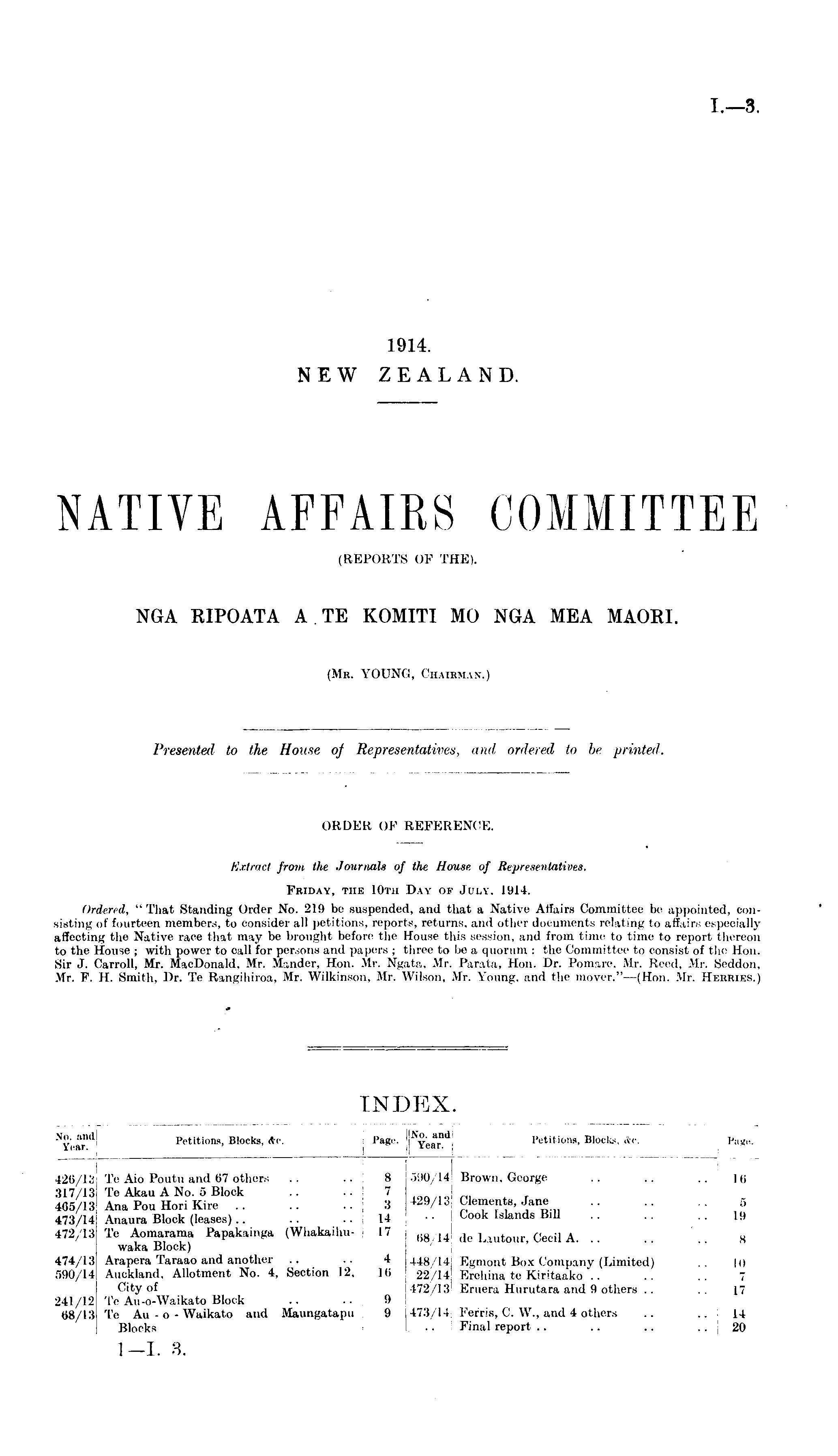 ORDER OF REFERENCE. Extinct from the Journals of tlie House, of Representatives. Friday, the 10th Day of July. 1914. Ordered, "That Standing Order No. 219 bo suspended, and that a Native Affairs Committee bo appointed, consist ing of fourteen members, to consider all petitions, reports, returns, and other documents relating to affairs especially affecting the Native race that may be brought before the House this session, and from time to time to report thereon to the House ; with power to call for persons and papers ; three to be a quorum : the Committee to consist of the Son. Sir J. Carroll, Mr. Mac Donald. Mr. Mander, Hon. Mr. Ngata. Mr. Parate, Hon. Dr. Pom .re. Mr. Reed, Mr. Seddon, Mr. F. H. Smith, Dr. To Rangihiroa, Mr. Wilkinson, Mr. Wilson, Mr. Young, and the mover." —(Hon. Mr. llerries.)