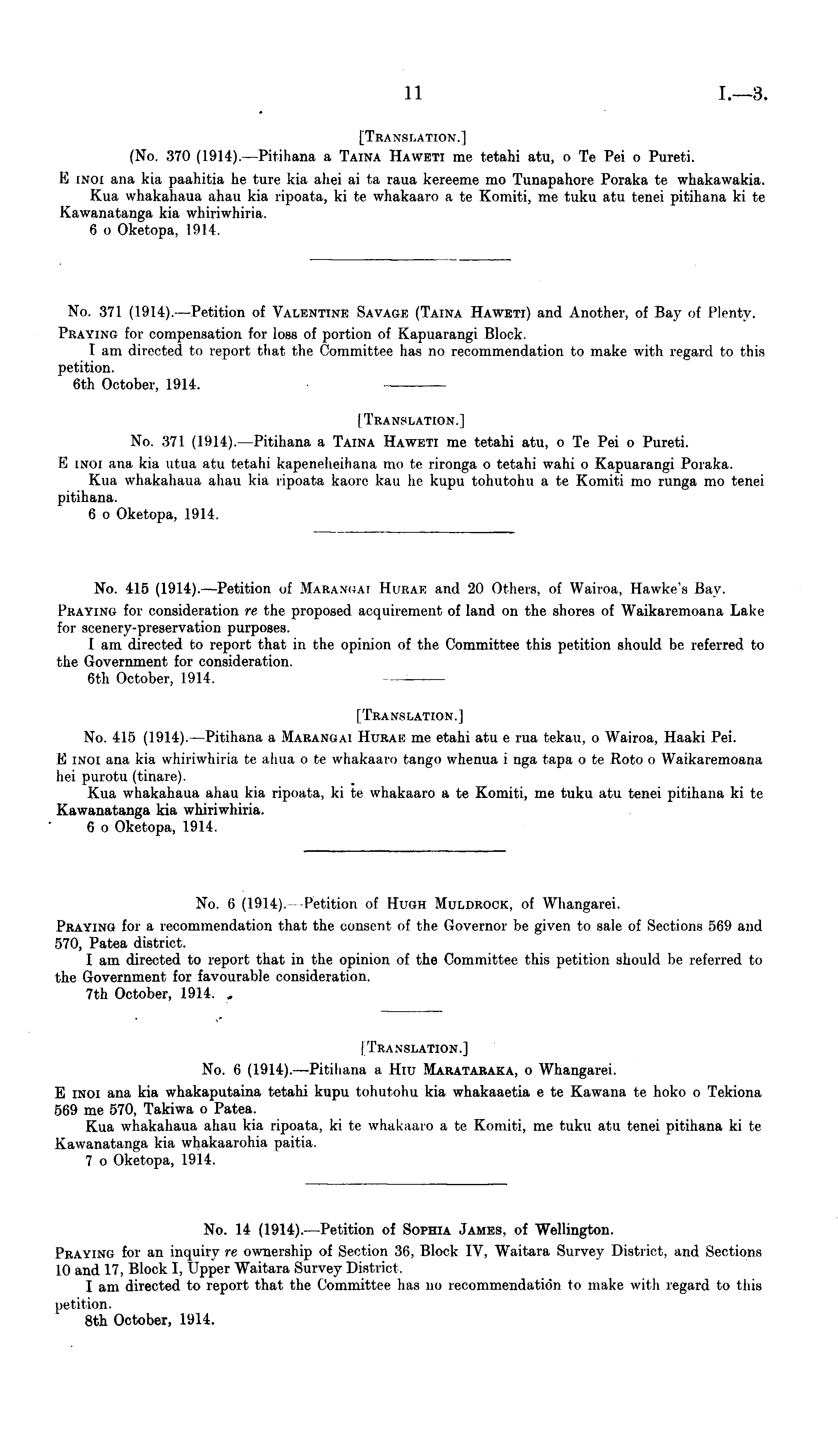 [Translation.] (No. 370 (1914). —Pitihana a Taina Haweti me tetahi atu, o Te Pei o Pureti. E inoi ana kia paahitia he ture kia ahei ai ta raua kereeme mo Tunapahore Poraka te whakawakia. Kua whakahaua ahau kia ripoata, kite whakaaro a te Komiti, me tuku atu tenei pitihana kite Kawanatanga kia whiriwhiria. 6 o Oketopa, 1914,